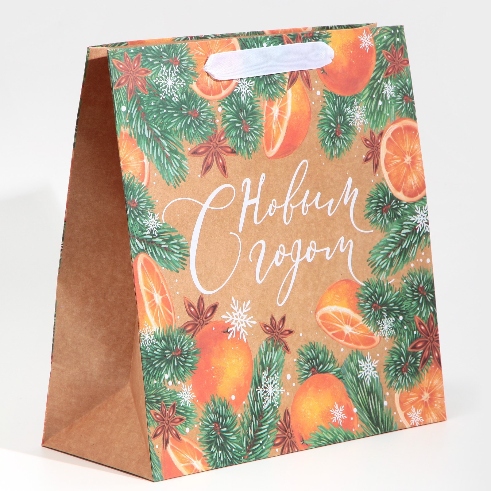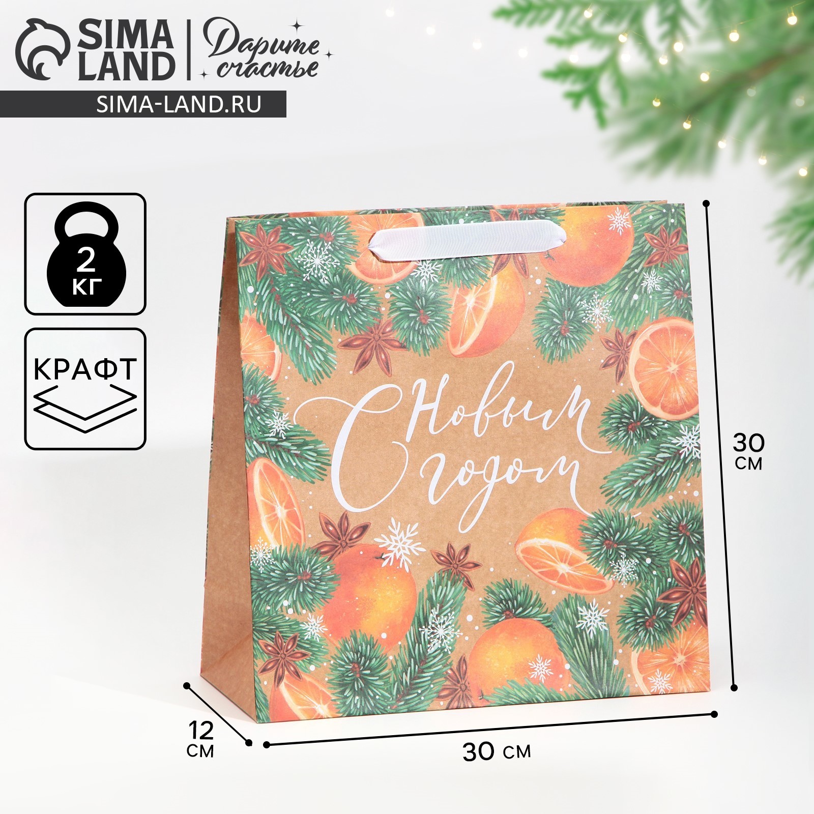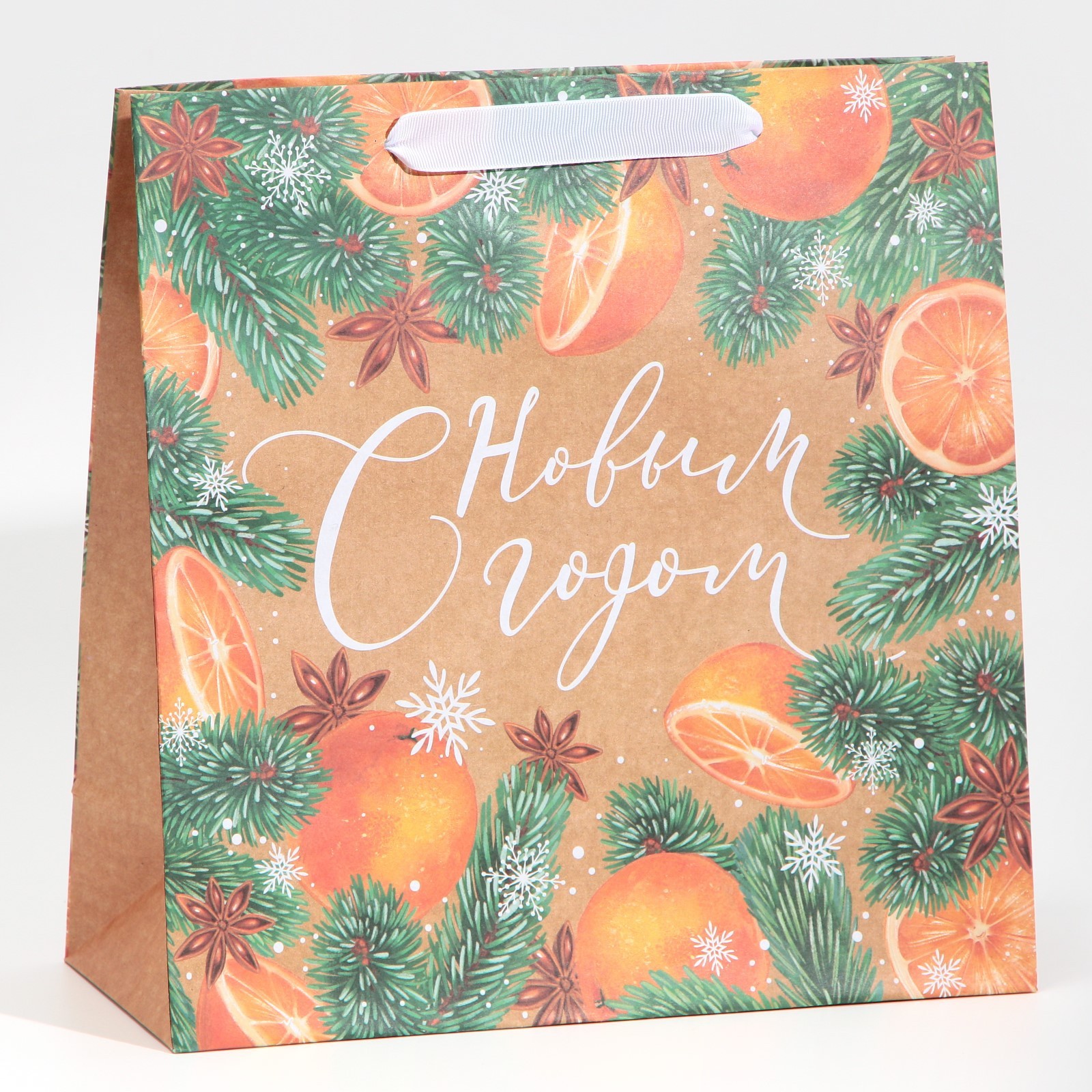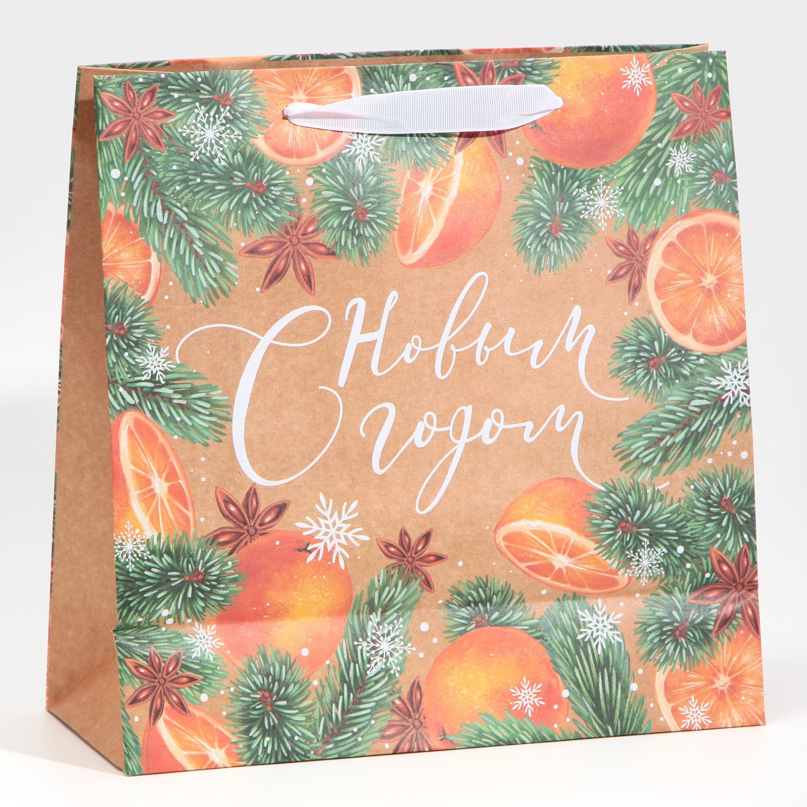 Пакет подарочный новогодний крафтовый квадратный «с новым годом», 30 х 30 х 12 см. Набор:Нет|Цвет:Бежевый|Цвет:Оранжевый|Для кого:Унисекс|Форма:Квадратная|Плотность, г/м :150|Рекомендуемая нагрузка, кг:2|Допустимый вес вложения, г:2000|Тематика:Растительный орнамент|Тематика:Фрукты|Тематика:Новогодняя|Рисунок:Да|Символ года:Нет|Тематика праздника:Новый год|Материал:Бумага|Отделка пакета:Крафт|Расширение:Без складки|Вид ручки:Ручка-лента|Форма пакета:Квадратный|Особенности:Квадратные|Страна:Китай  развернуть описание ▼