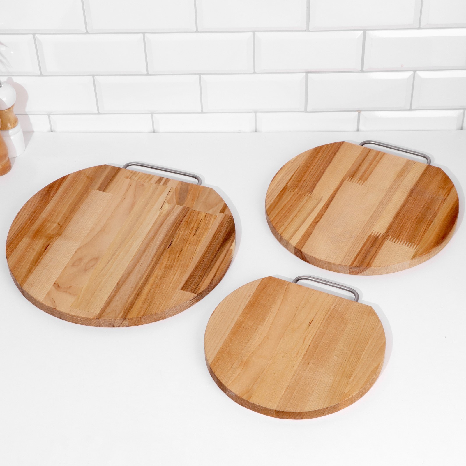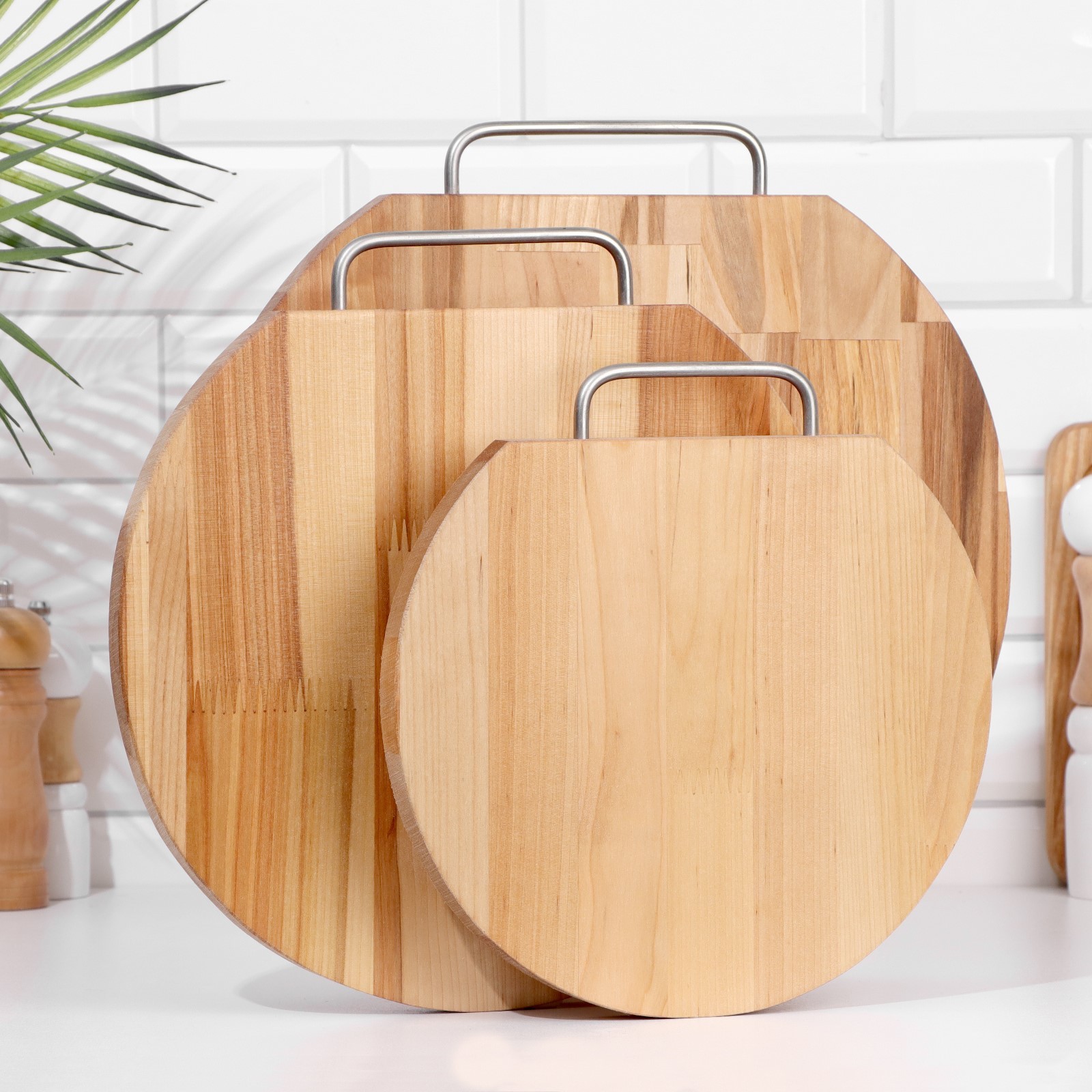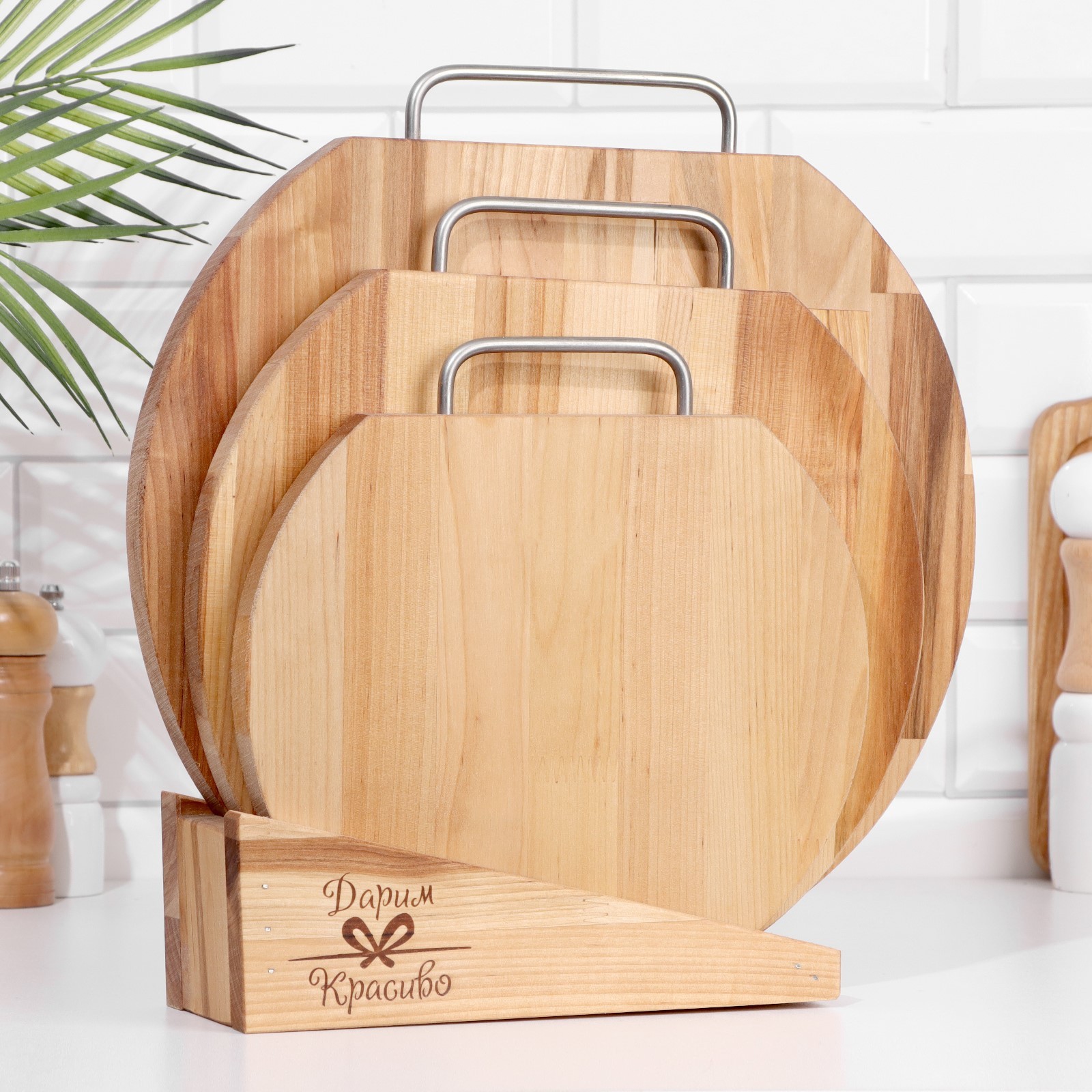 Набор досок разделочных "круг" (металлическая ручка) в кассете d=35х1,8;30х1,8;25х1,8 см. Деревянная разделочная доска — это классика, актуальная во все времена. Она не боится воды и имеет длительный срок службы. Подходит для мяса и овощей: продукты на ней не скользят, что значительно облегчает нарезку и обеспечивает безопасность повару. Также изделие почти не тупит ножи. Особенности: легко моется и быстро сушится;удобно хранить, можно подвесить на крючок;безопасный природный материал;невысокая цена. Уход за деревянной посудой: 1. Перед первым использованием ополосните деревянное изделие в тёплой воде без добавления моющих средств. Протрите предмет впитывающей тканью. Оставьте его на 1–2 часа, чтобы испарилась вся влага. 2. Не оставляйте изделие надолго в воде, так как дерево впитывает влагу и по мере высыхания может растрескаться. 3. Храните посуду в месте, куда не попадают солнечные лучи и влага. 4. Мойте посуду только вручную, мягкой губкой с добавлением небольшого количества моющего средства. 5. Не оставляете деревянную посуду грязной или мокрой надолго. 6. После мытья тщательно протрите изделие и высушите в вертикальном положении. Цвет: Бежевый Форма: Круглая Длина, см: 25 Длина, см: 30 Длина, см: 35 Ширина, см: 25 Ширина, см: 30 Ширина, см: 35 parts count: 0 В наборе, шт.: 3 tnved: 4419900000 Вид дерева: Берёза Материал: Дерево Тип доски: Стандартная Тип нанесения рисунка: Без нанесения Температурное ограничение: Нет Можно мыть в посудомоечной машине: Нет Особенности: На подставке Форма: Круг, шар, цилиндр  развернуть описание ▼