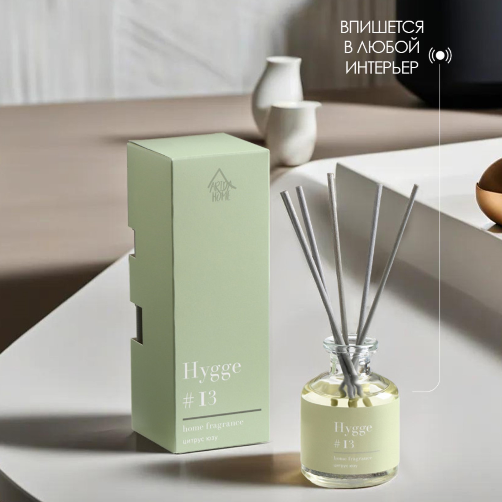 Диффузор "hygge" ароматический, 50 мл, цитрус юзу. Юзу – цитрус родом из древнего Китая. В нём сочетается и привкус лимона и оттенок лайма и лёгкая горчинка грейпфрута. Вся эта палитра ярких вкусов приправлена свежей мятной нотой, сладостью ананаса и представлена в аромате Хюгге #13 Цитрус/юзу. НОТЫ АРОМАТА: Верхние ноты: апельсин Средние ноты: ананас, мята Нижние ноты: ваниль, пралинеДиффузор с фибровыми палочками - это безопасный экологически чистый и натуральный способ ароматизации помещения, является прекрасной альтернативой ароматизированным спреям. Стильный дизайн этого модного ароматического аксессуара украсит любой интерьер. Диффузор представляет собою изящную стеклянную емкость с ароматной жидкостью. В нее вставляются несколько длинных фибровых палочек. Постепенно, насыщаясь эфирными маслами , они распространяют аромат по всей комнате. Палочки важно применять сразу все и периодически переворачивать (1-2 раза в сутки). Флакона , объемом 50 мл, хватит на помещение площадью до 15 м 2. Срок службы диффузора от 1, 5 до 2 -х месяцев, в зависимости от места использования. В более влажных помещениях , срок использования сокращается. Объём, мл: 50 Вид ароматизатора: Диффузор Аромат: Цитрус Температурное ограничение: Нет  развернуть описание ▼