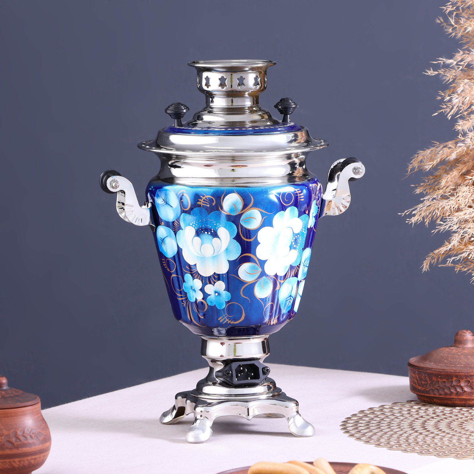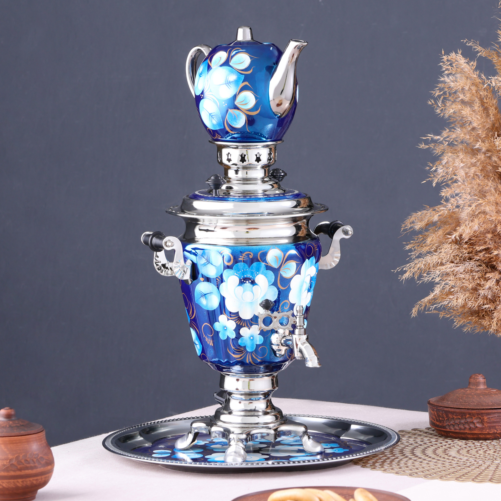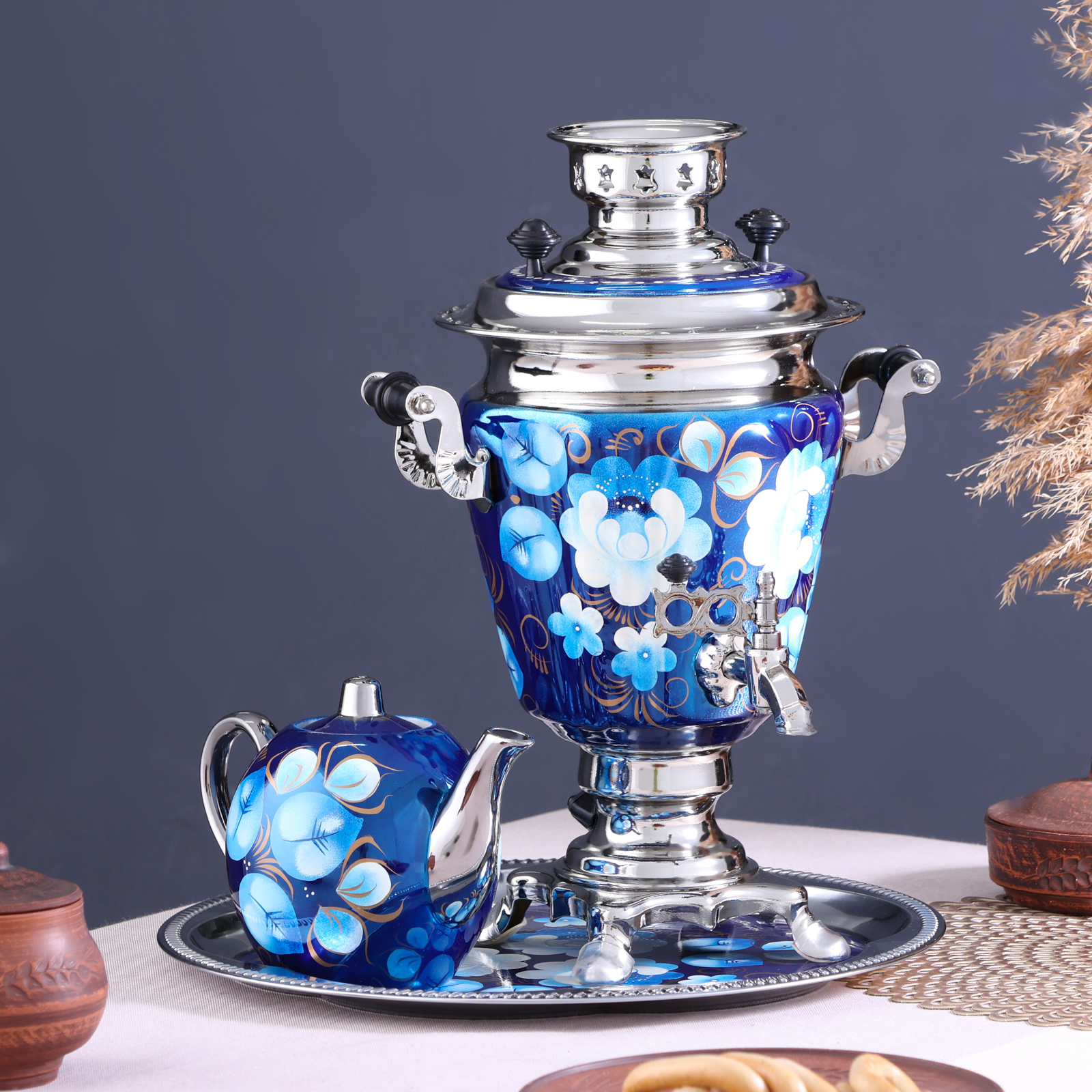 Набор «жостово на синем», рюмка, 3 предмета, самовар 3 л, заварочный чайник 0,7 л, поднос