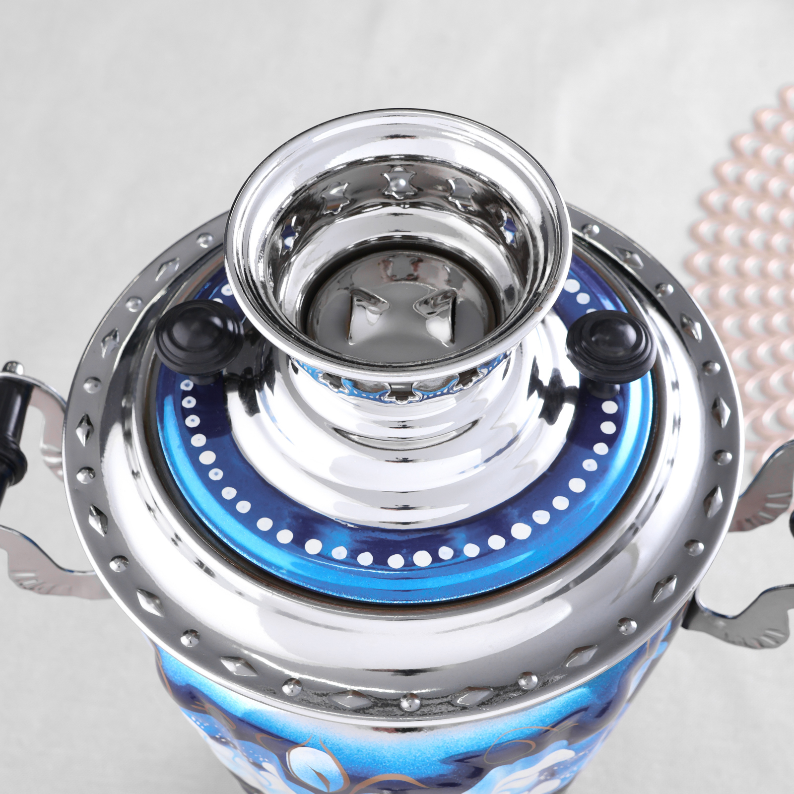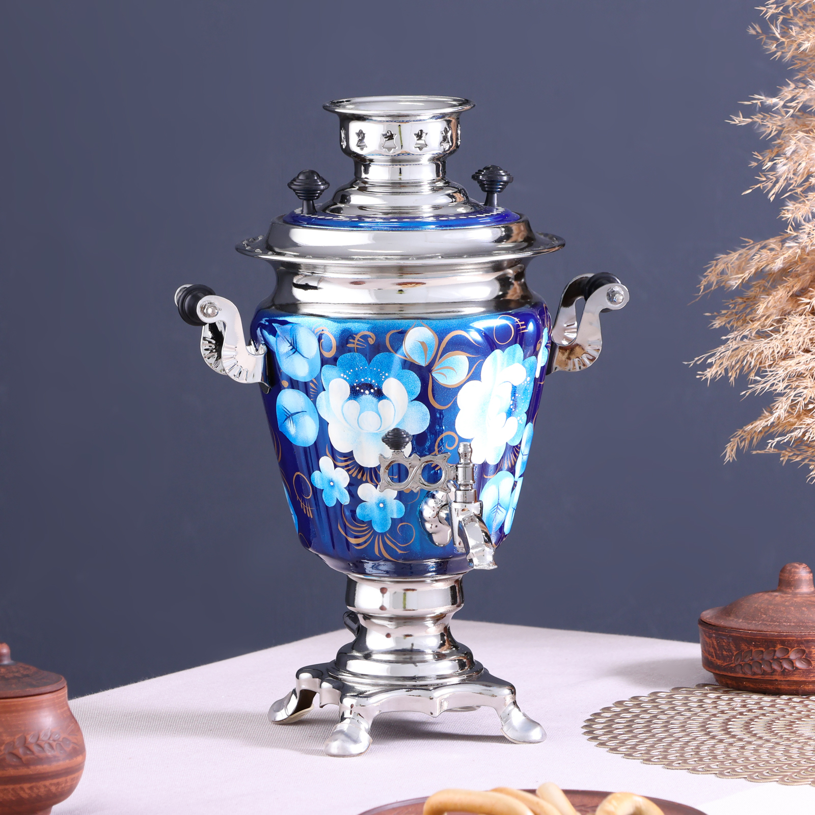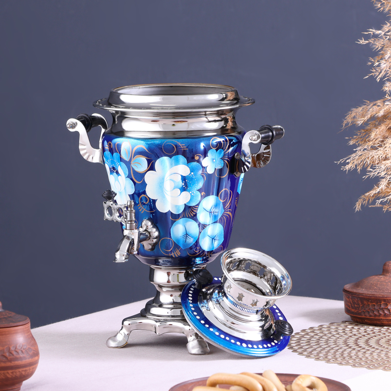 Набор «жостово на синем», рюмка, 3 предмета, самовар 3 л, заварочный чайник 0,7 л, поднос