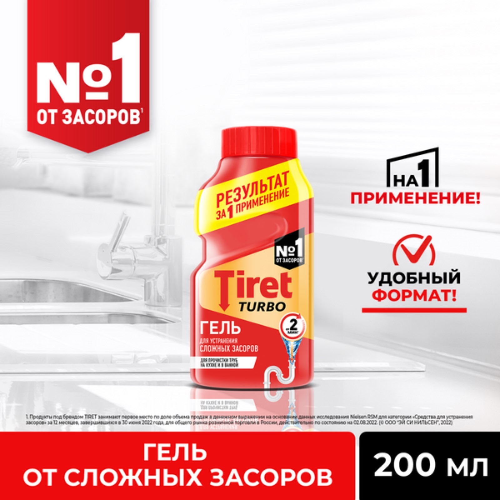 Появился засор? Попробуйте новый компактный формат от бренда No1 в устранении засоров- Tiret Turbo 200 мл. Tiret Turbo эффективно и быстро справляется даже с очень сложными засорами, а густая формула геля позволяет средству проникать в трубы даже в стоячей воде. Компактная упаковка продукта, рассчитанная на 1 применение, очень удобна использовании, и не будет занимать много места дома.