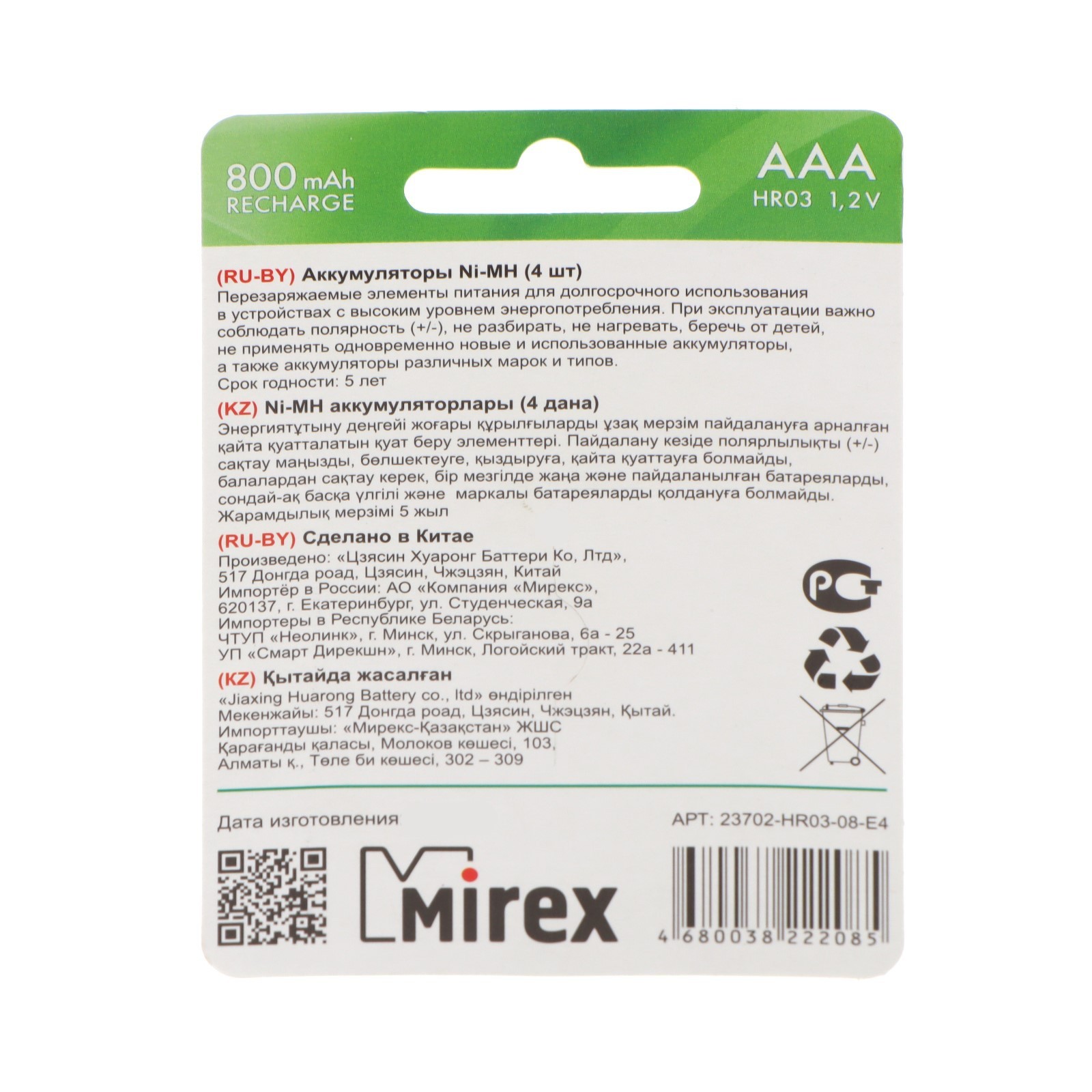 Аккумулятор Mirex, Ni-mh, Aaa, Hr03-4bl, 1.2в, 800 мач, блистер, 4 шт.