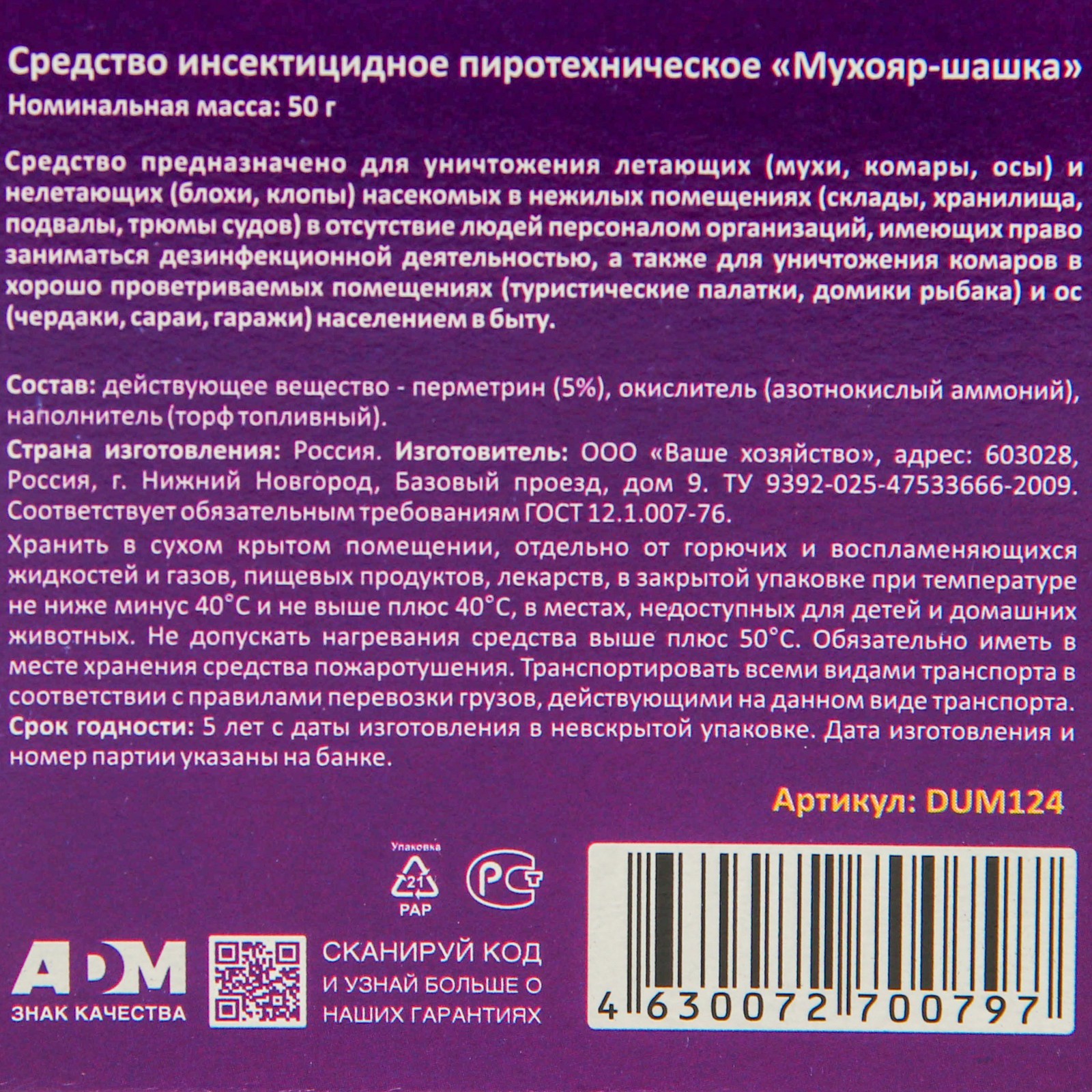 Дымовая шашка "Nadzor", от насекомых, инсектицидная, 50 г