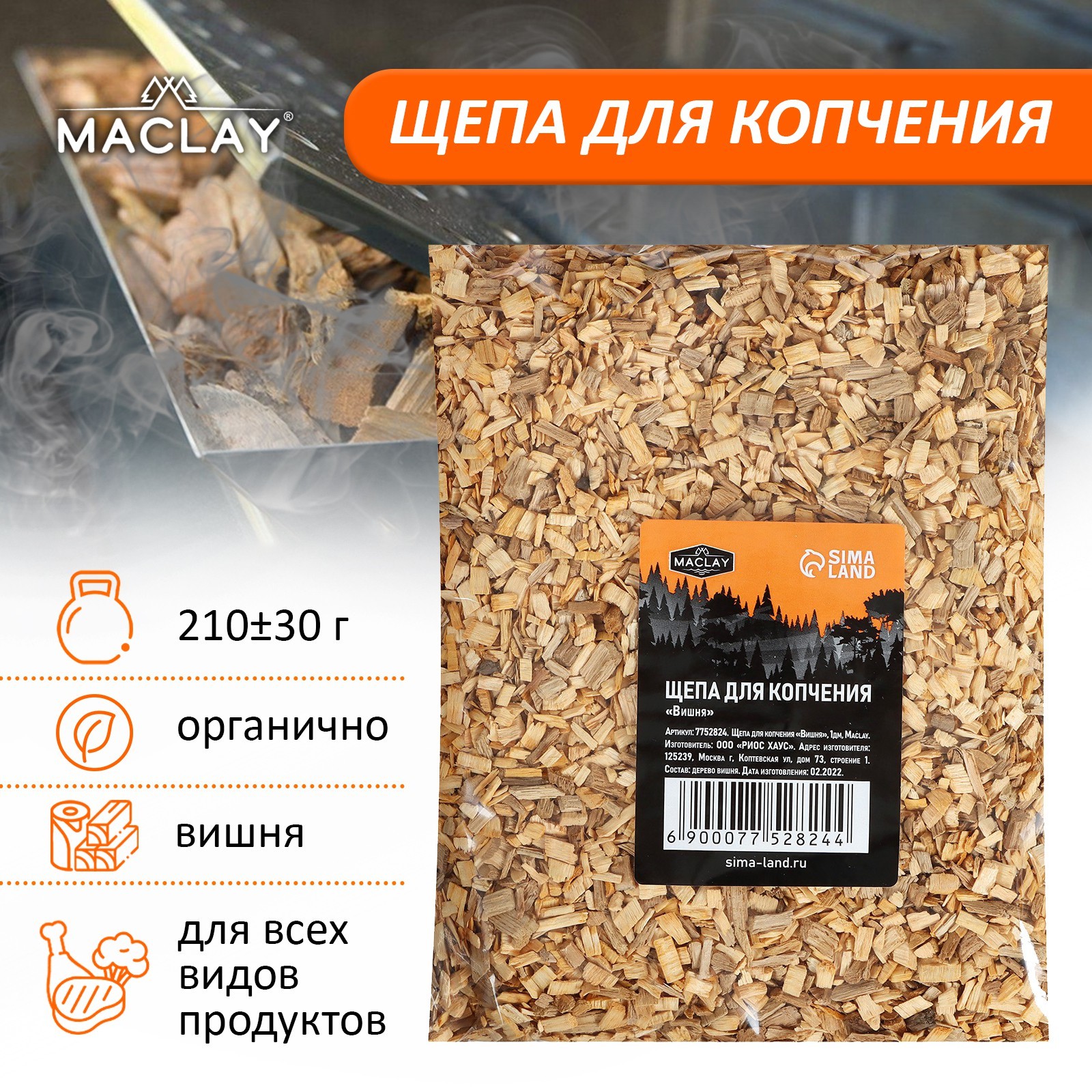 Щепа для копчения maclay «вишня», 210±30 г. Вишнёвая щепа используется для холодного и горячего копчения и подходят для всех видов коптилен. Щепу удобно использовать для готовки мяса, птицы и рыбы. Вес, г/Объём, мл: 210 Вес, г: 210 Вид дерева: Вишня Вид: Щепа Температурное ограничение: Нет  развернуть описание ▼