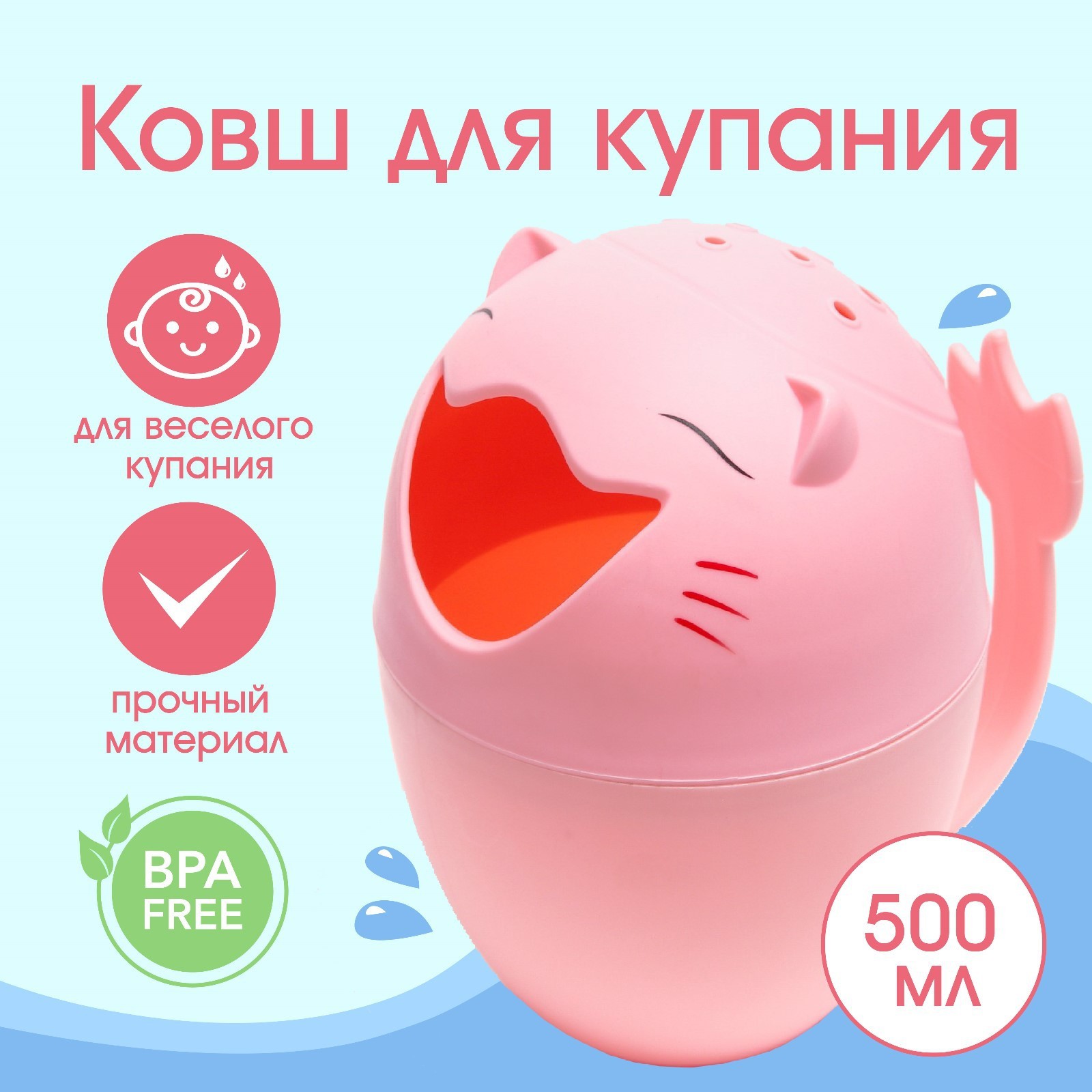 Ковш пластиковый для купания и мытья головы, детский банный ковшик «котик», 500 мл., с леечкой, цвет розовый