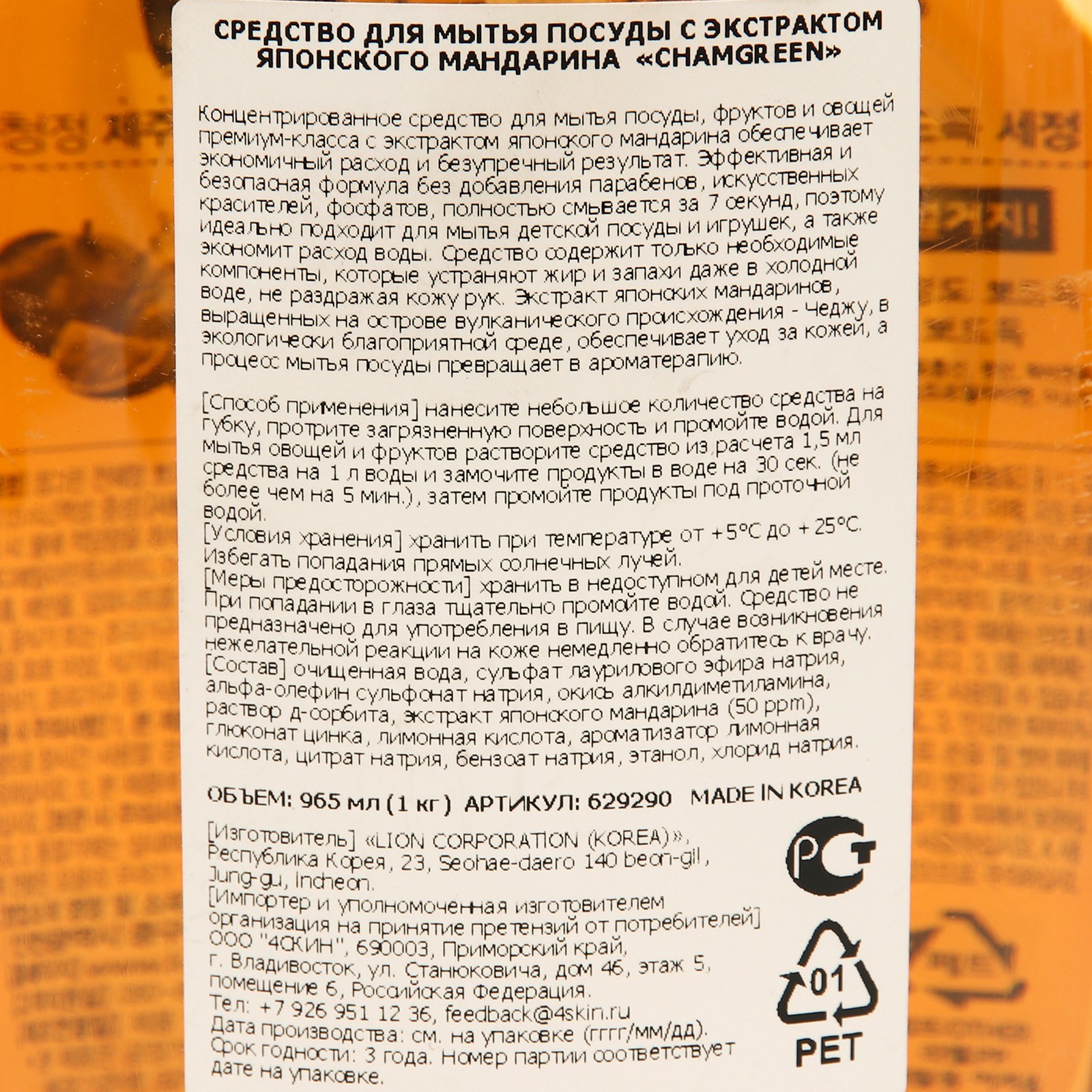 Средство для мытья посуды с экстрактом японского мандарина «chamgreen», 965 мл. Концентрированное средство для мытья посуды, фруктов и овощей премиум-класса с экстрактом японского мандарина обеспечивает экономичный расход и безупречный результат. Эффективная и безопасная формула без добавления парабенов, искуственных красителей, фосфатов, полностью смывается за 7 секунд, поэтому идеально подходит для мытья детской посуды и игрушек, а так же экономит расход воды. Средство содержит только необходимые компоненты, которые устраняют жир и запахи даже в холодной воде, не раздражая кожу рук. Способ применения: нанесите небольшое количество средства на губку, протрите загрязненную поверхность и промойте водой. Для мытья овощей и фруктов растворите средство из расчета 1. 5 мл средства на 1 л воды и замочите продукты в воде на 30 сек но не более чем на 5 мин. , затем промойте продукты под проточной водой. Состав: очищенная вода, сульфат лаурилового эфира натрия, альфа-олефин, сульфат натрия, окись алкилдиметиламина, раствор д-сорбита, экстрак японскогомандарина, глюконат цинка, лимонная кислота, ароматизатор лимонная кислота, цитрат натрия, бензонат натрия, этанол, хлорид натрия. Вес, г/Объём, мл: 965 : 0 Температурное ограничение: Нет Вид: Гель  развернуть описание ▼
