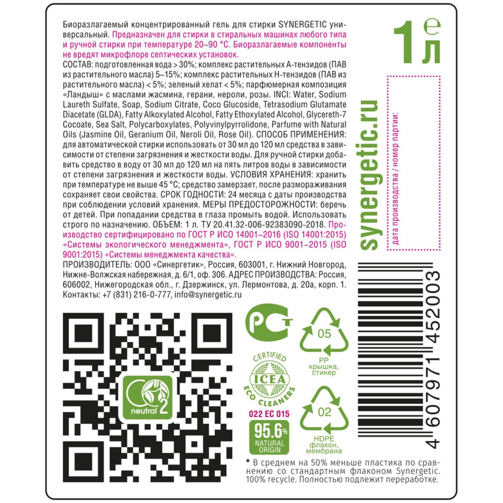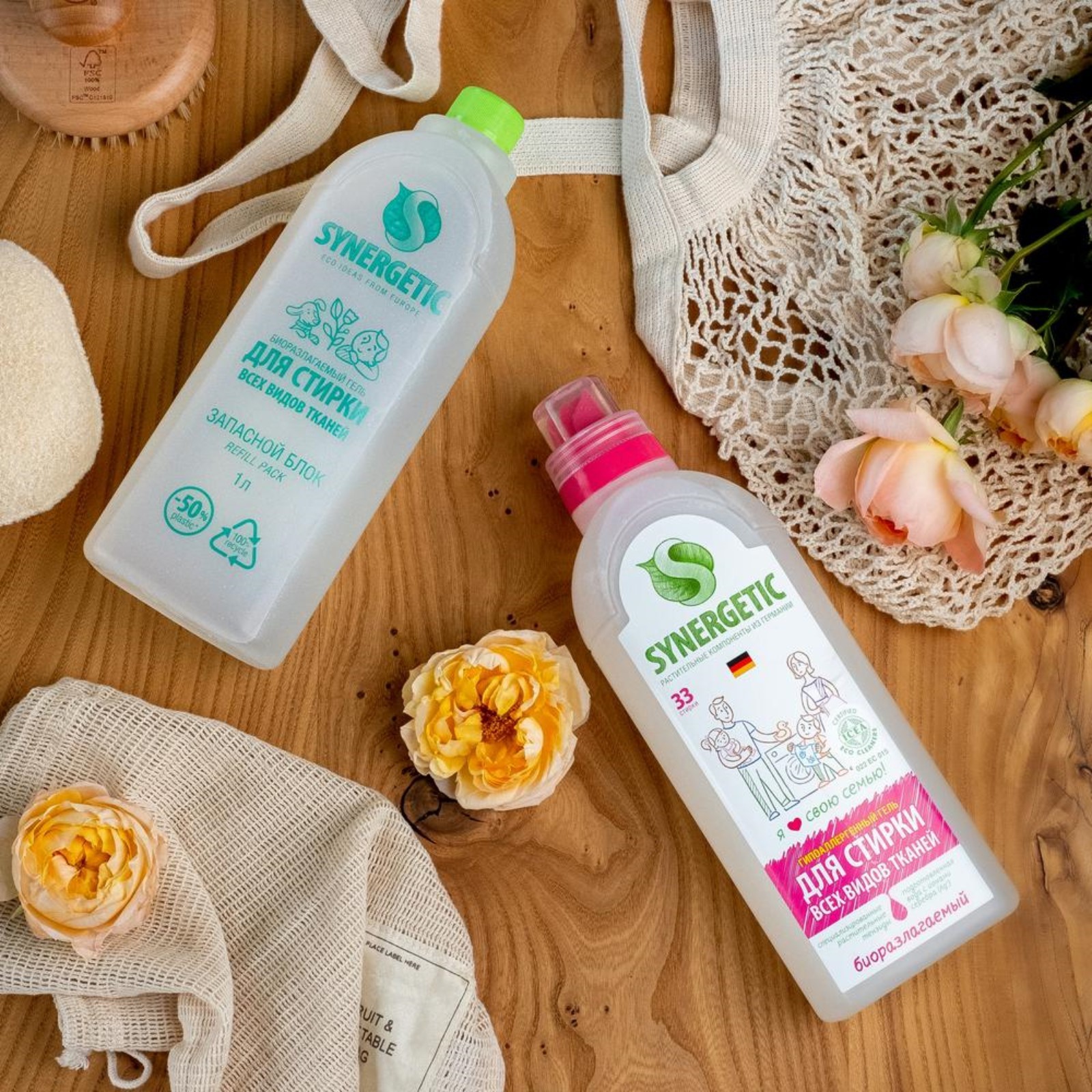 Гель для стирки биоразлагаемый Synergetic, концентрированный, универсальный, Refill Pack 1 л