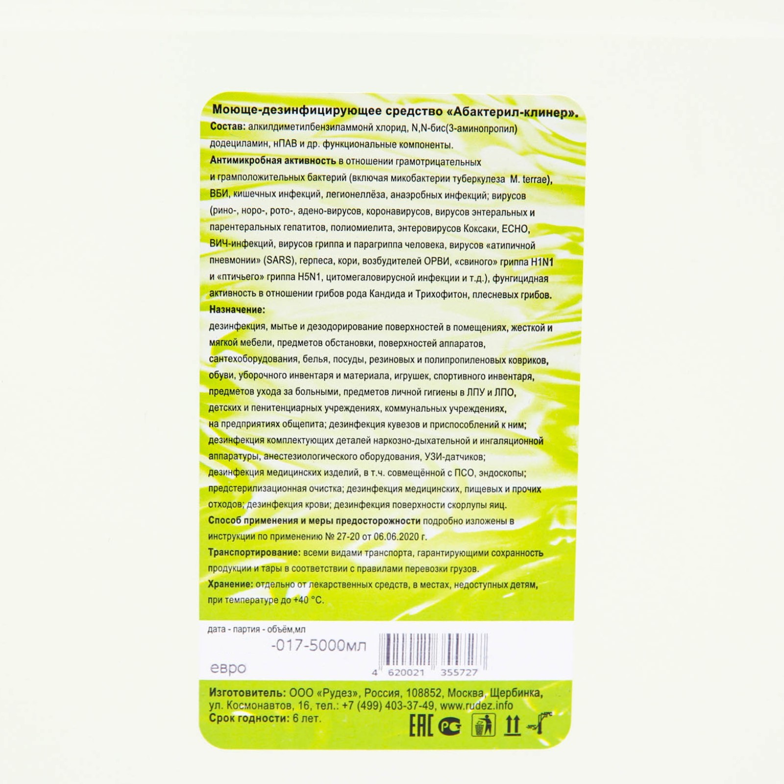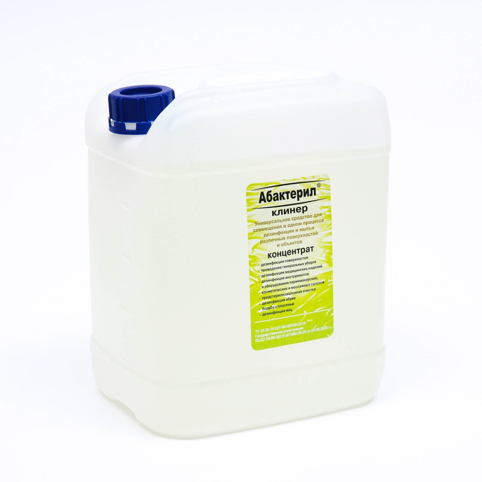 Универсальное дезинфицирующее моющее средство абактерил клинер, 5 л. Универсальное дезинфицирующее моющее средство "Абактерил Клинер" имеет хорошие моющие и дезодорирующие свойства, уничтожает пятна и налеты жира, масла, сажи, белковых отложений и многие другие трудноудалимые загрязнения с поверхностей из любых материалов (стекло, зеркала, металлы, керамика, ковры, кожа, хромированные изделия, бетон, кафель, резина, пластик, винил, фарфор, фаянс и др. , в том числе пористые), удаляет с поверхностей биологические плёнки. Не портит обрабатываемые объекты, не обесцвечивает ткани, не фиксирует органические загрязнения, не вызывает коррозии металлов, включая нелегированные стали, сплавы цветных металлов (латунь, медь), титановые и алюминиевые сплавы, Универсальное дезинфицирующее моющее средство "Абактерил Клинер" полностью биоразлагаемо и экологически безопасно. Сохраняет свои свойства после замерзания и последующего оттаивания. Безопасно для окружающей среды. Не требует смывания с обработанных поверхностей после дезинфекции. Обладает антибактериальной активностью. Способ применения: подробно изложен в инструкции по применению. Состав: алкилдиметилбензиламмонй хлорид – 4, 0 %, N, N-бис(3-аминопропил) додециламин – 0, 5 %, неионогенные поверхностно-активные вещества и другие функциональные компоненты. Вес, г/Объём, мл: 5000 Объём, мл: 5000 Форма выпуска: Жидкость Назначение: Бытовые Назначение: Профессиональные Температурное ограничение: Нет Вид: Хлоросодержащиее  развернуть описание ▼