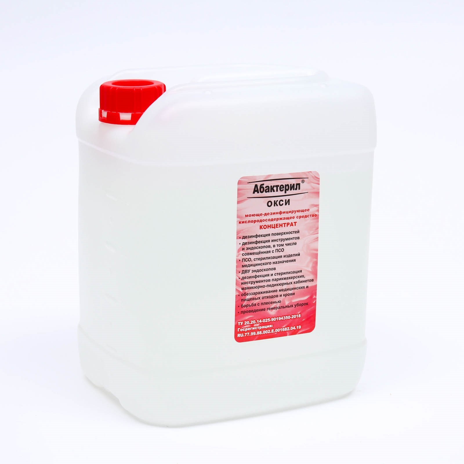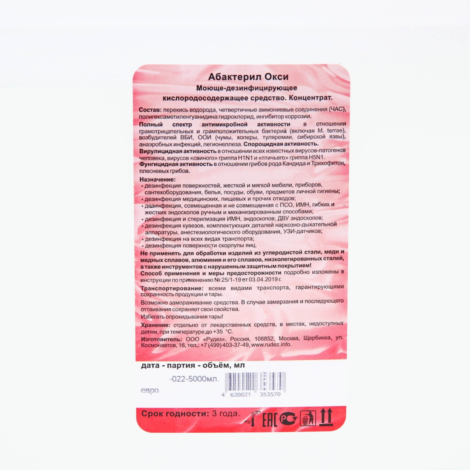 Дезинфицирующее средство абактерил окси, 5 л. Представляет собой прозрачную бесцветную или слегка желтоватую жидкость со слабым специфическим запахом или запахом применяемой отдушки. Допускается наличие опалесценции и незначительного осадка. Кислородосодержащее моюще-дезинфицирующее средство Абактерил-окси широкого спектра действия. Концентрат. Предназначено к применению: дезинфекции медицинских отходов (класса А, класса Б и класса В), дезинфекции и мытья поверхностей в помещениях, белья, посуды столовой, лабораторной, аптечной, ёмкостей из-под выделений, предметов для мытья посуды, игрушек, спортивного инвентаря, средств личной гигиены, предметов ухода за больными, уборочного материала и инвентаря, резиновых и полипропиленовых ковриков, обуви из резин, пластика и других полимерных материалов, систем мусороудаления, изделий медицинского назначения однократного применения перед их утилизацией, а также пищевых и прочих отходов. Дезинфекции крови в сгустках, донорской крови и препаратов крови с истекшим сроком годности, медицинских пиявок после проведения гирудотерапии. Дезинфекции на санитарном транспорте и транспорте для перевозки пищевых продуктов. Профилактической дезинфекции систем вентиляции и кондиционирования воздуха. Дезинфекции и предстерилизационной очистки изделий медицинского назначения. Для дезинфекции поверхностей инструментов и оборудований парикмахерских, косметических и массажных салонов, солярий, маникюрно-педикюрных кабинетов и т. д. Для использования населением в быту. Способ применения: применяется в виде готовой к применению жидкости и в виде пропитанных на месте салфеток из диспенсерной системы согласно утверждённой инструкции по применению. Не требует предварительного мытья рук водой и мылом. Не требует смывания после обработки. Меры предосторожности: не использовать на воспаленных участках кожи. Избегать контакта с глазами. Хранить в недоступном для детей месте. Состав: перекись водорода 18%, алкилдиметилбензиламмоний хлорид и дидецилдиметиламмоний хлорид суммарно 5, 0%, полигексаметиленгуанидин гидрохлорид 4, 0%, а также стабилизатор перекиси, неионогенные поверхностно-активные вещества, антикоррозийные и другие функциональные добавки. Срок хранения: 6 лет. Вес, г/Объём, мл: 5000 Объём, мл: 5000 Форма выпуска: Жидкость Назначение: Профессиональные Назначение: Бытовые Температурное ограничение: Нет Вид: Спиртовое  развернуть описание ▼