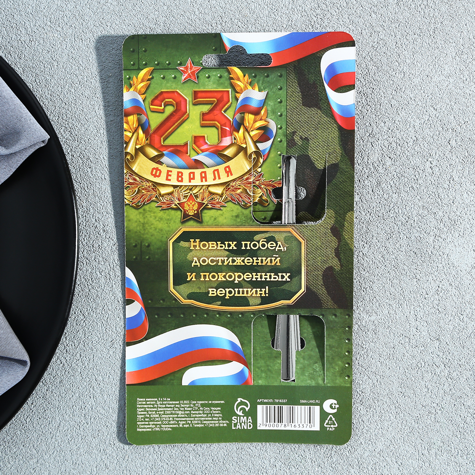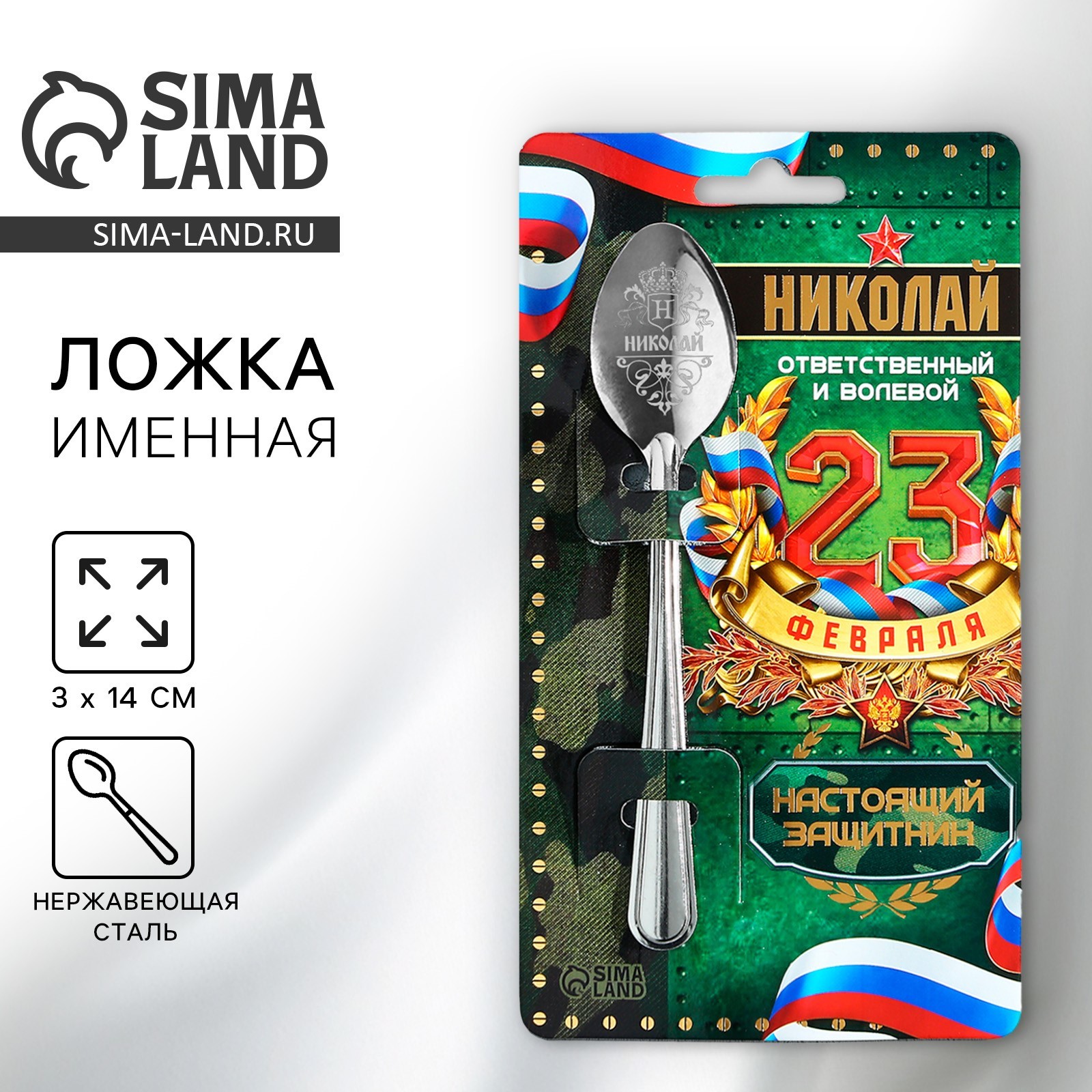 Ложка именная с 23 февраля «николай», 3 х 14 см.. Для особых случаев — особый подарок. Ложка именная с 23 Февраля «Николай», 3 х 14 см. может украсить ваше чаепитие, обед или ужин, сделать каждую встречу неповторимой. Иногда, чтобы сказать близким людям, как они нам дороги, или поздравить с праздником, не нужны слова, достаточно подарить небольшой, но оригинальный сувенир, который будет поднимать настроение и приносить пользу. Ложка с лазерной гравировкой и изящной рукояткой преподносится на красочной открытке. На оборотной стороне изделия специально отведено место для подписи: кому и от кого был вручён подарок. Цвет: Серебристый В наборе, шт.: 1 Объём, мл: 5 Материал ручки: Металл Материал: Металл Выбор имени: Николай/Коля Назначение: Чайные Назначение: Сувенирные Можно мыть в посудомоечной машине: Да Цвет ручки: Серебристый Матовая поверхность: Нет Внешний вид: На 23 февраля  развернуть описание ▼