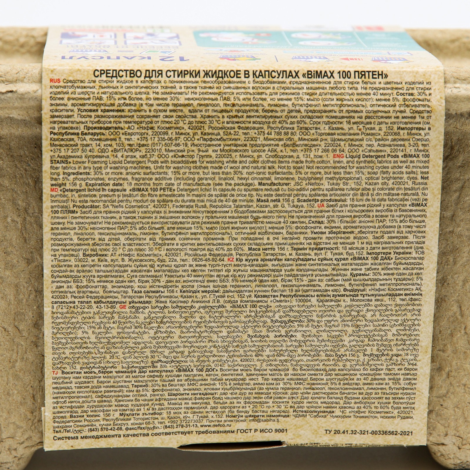 Капсулы для стирки bimax 100 пятен, 12 х 13 г. Капсулы для стирки BiMAX 100 пятен, 12шт. в новой биоразлагаемой упаковке. Новая активная концентрированная формула эффективно справляется с пятнами, защищает волокна ткани и дарит приятный, нежный аромат. Безупречная чистота и мягкий аромат цветочной свежести. Предназначены для стирки и отбеливания изделий из хлопчатобумажных, льняных, синтетических тканей, а также тканей из смешанных волокон. Не предназначены для стирки изделий из шерсти и натурального шелка. Капсулы удаляют загрязнения и более 100 видов трудно выводимых пятен, придавая вашему белью ослепительную белизну. Состав 30% анионные ПАВ, 5-15% мыло, <5% неионогенные ПАВ, фосфонаты, энзимы, оптические отбеливатели. В упаковке, шт.: 12 Назначение: Для всех видов тканей Температурное ограничение: Нет  развернуть описание ▼