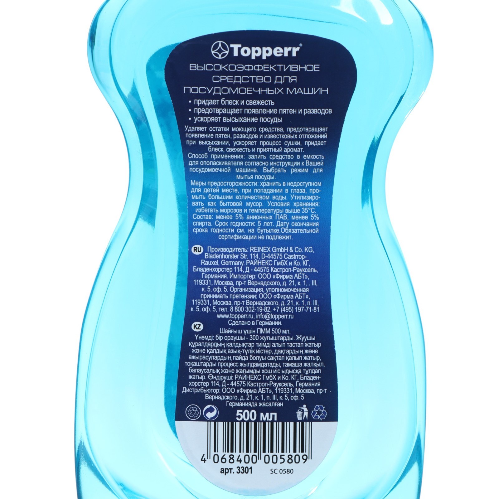 Ополаскиватель для посудомоечных машин topperr, 500 мл. Эффективно удаляет остатки моющих средств и остаточные пищевые запахи, предотвращает появление пятен и разводов, ускоряет процесс сушки, придаёт посуде великолепный блеск, свежесть и приятный аромат. Средство очень экономично - одной упаковки хватит на 300 моек. parts count: 0 Объём, л: 0.5  развернуть описание ▼