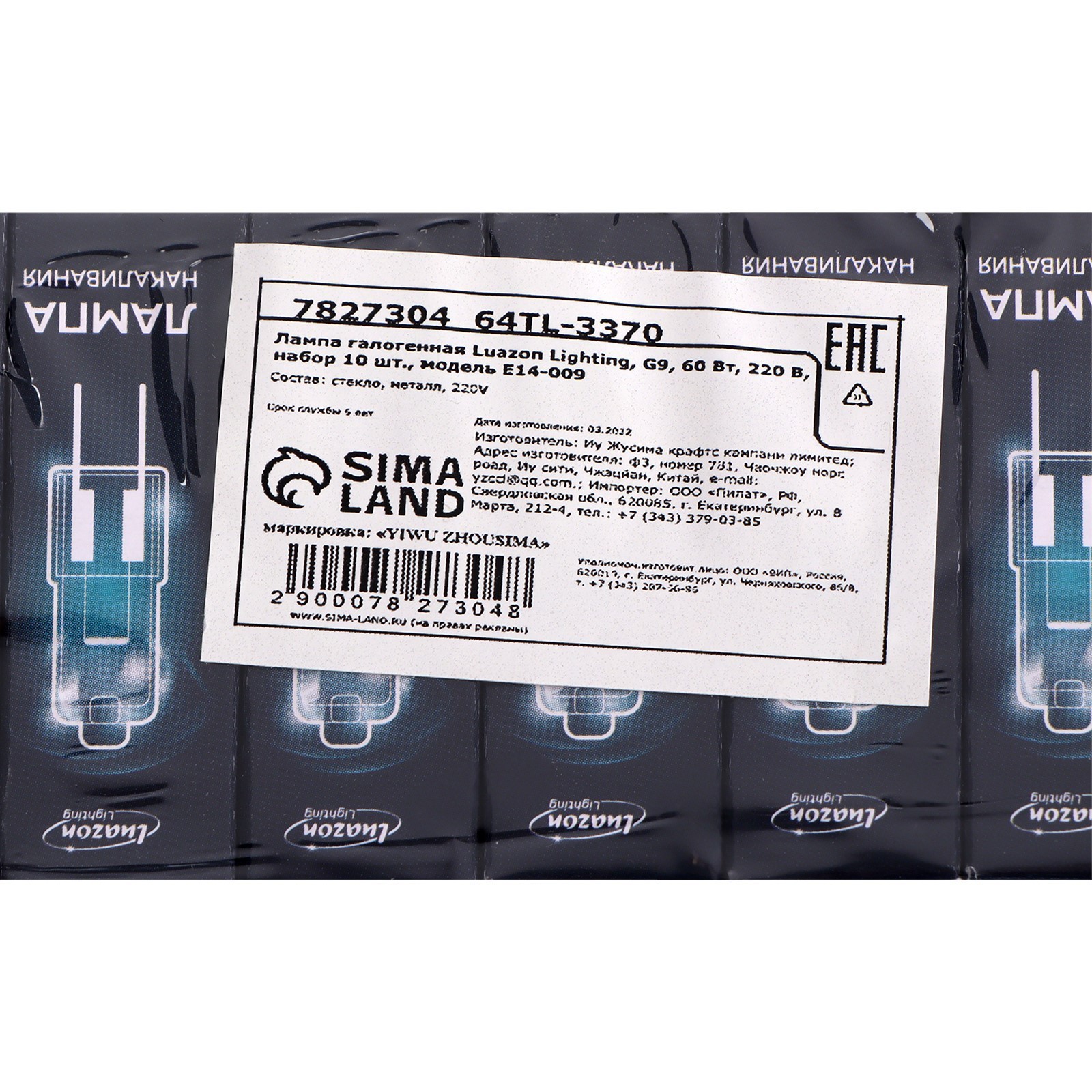 Лампа галогенная Luazon Lighting, G9, 60 вт, 220 в, набор 10 шт.