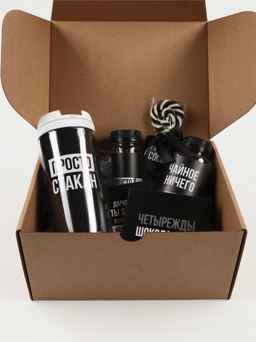 Гифтбокс «ничего»: чай чёрный 50 г., драже 80 г., молочный шоколад 20 г., термостакан 350 мл., леденец 15 г.. ПРИ ОФОРМЛЕНИИ ЗАКАЗА, ПРОСИМ ЗАПРАШИВАТЬ АКТУАЛЬНЫЕ СРОКИ ГОДНОСТИ У МЕНЕДЖЕРА. Чай чёрный байховый. Состав: чай чёрный байховый. Масса нетто: 50 г. Карамель леденцовая фигурная на палочке со вкусом ежевики. Состав: сахар, глюкозный сироп, вода, регулятор кислотности – лимонная кислота, натуральный ароматизатор «Ежевика тип», красители: кармины, каротины, бета-апо-8’-каротиновый альдегид. Масса нетто: 15 г. Драже молочное с какао в сахарной глазури «Пти Бон» Состав: сахар, пальмовое масло, сыворотка сухая молочная, какао-порошок, какао тёртое, молоко сухое обезжиренное, молоко сухое, эмульгатор – соевый лецитин, соль, загуститель – желатин, пищевые красители: Е120, Е133, Е141, Е160С, Е171; глянцеватель – капол, ароматизатор. Масса нетто: 80 г. Шоколад молочный. Состав: сахар, какао-масло, сухие молочные продукты, какао тёртое, какао-порошок, эмульгаторы (лецитин соевый – Е322, PGPR – Е476), ароматизатор пищевой «Ванилин». Содержание какао-продуктов: не менее 37 %. Масса нетто: 20 г (4 шт. х 5 г). Термостакан, 350 мл Состав: полипропилен. Для кого:Унисекс|В наборе, шт.:5|Вид упаковки:Подарочная коробка|Тематика праздника:Универсальная тематика|Адресат:Девочке|Адресат:Мужу|Адресат:Женщине|Адресат:Жене|Адресат:Мужчине|Составляющие набора:Драже|Составляющие набора:Чай|Составляющие набора:Шоколад|Составляющие набора:Леденцы|Составляющие набора:Термостакан|Темпер. ограничение НЕ НИЖЕ :+5|Темпер. ограничение НЕ ВЫШЕ :+15|Возраст:Для взрослых|Страна:Россия  развернуть описание ▼