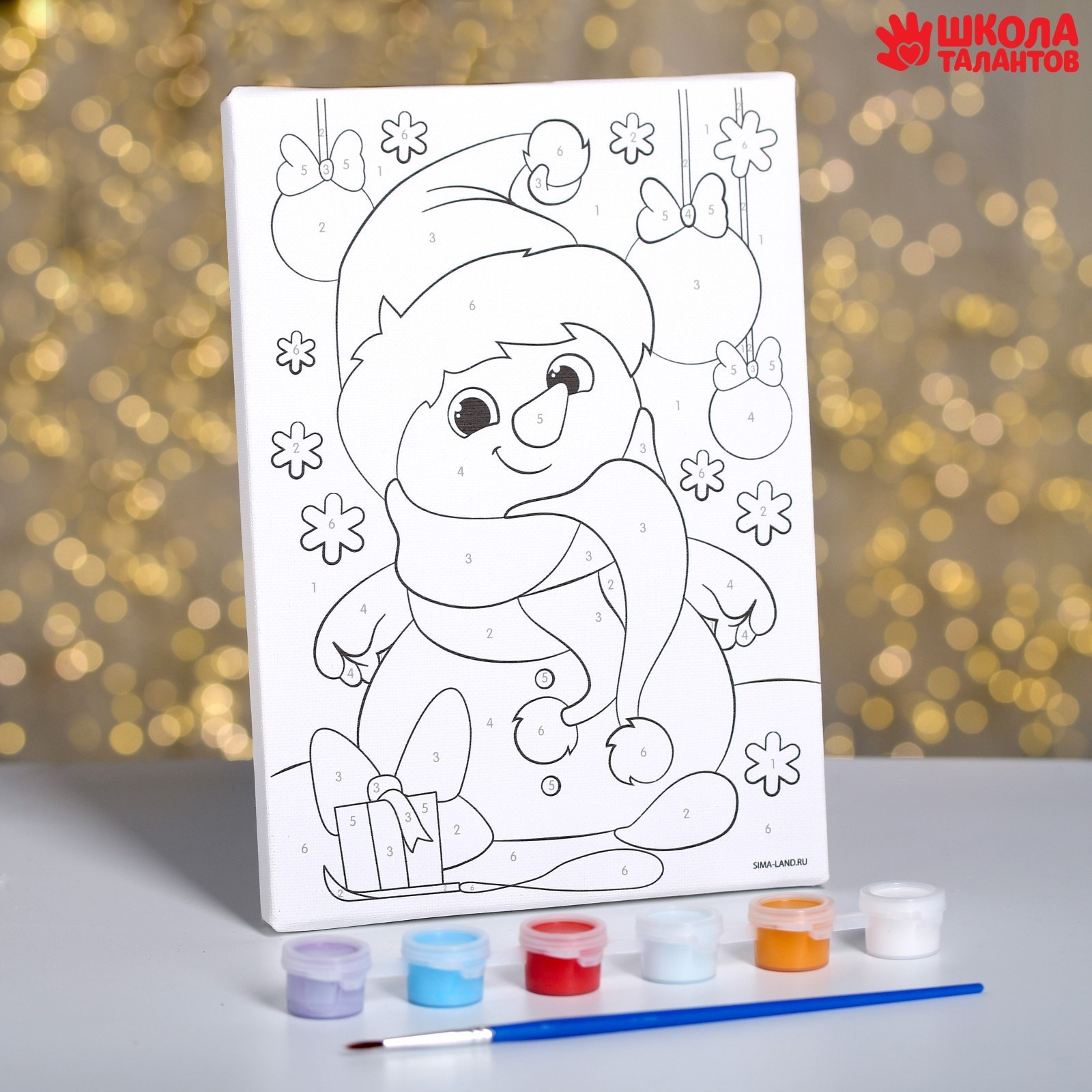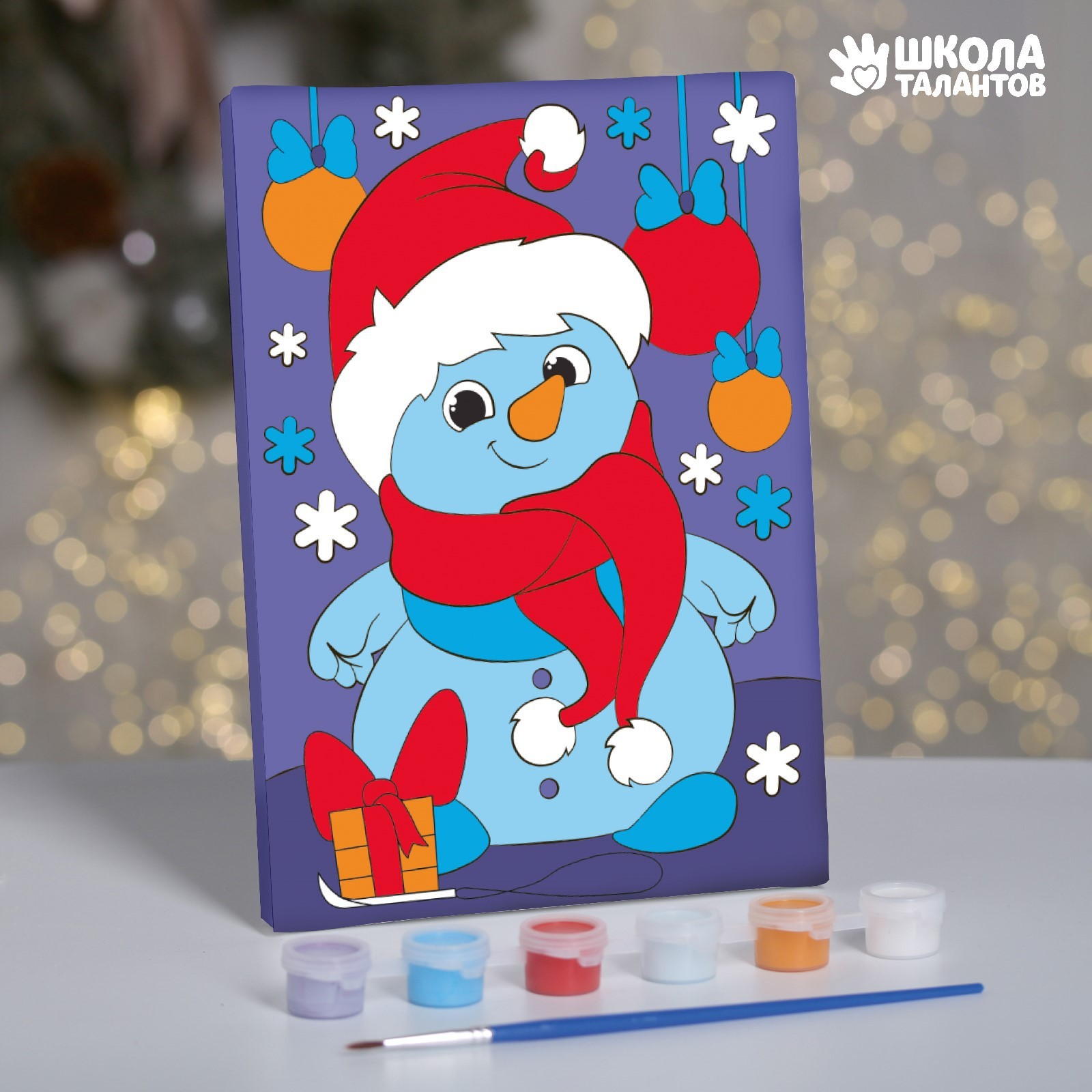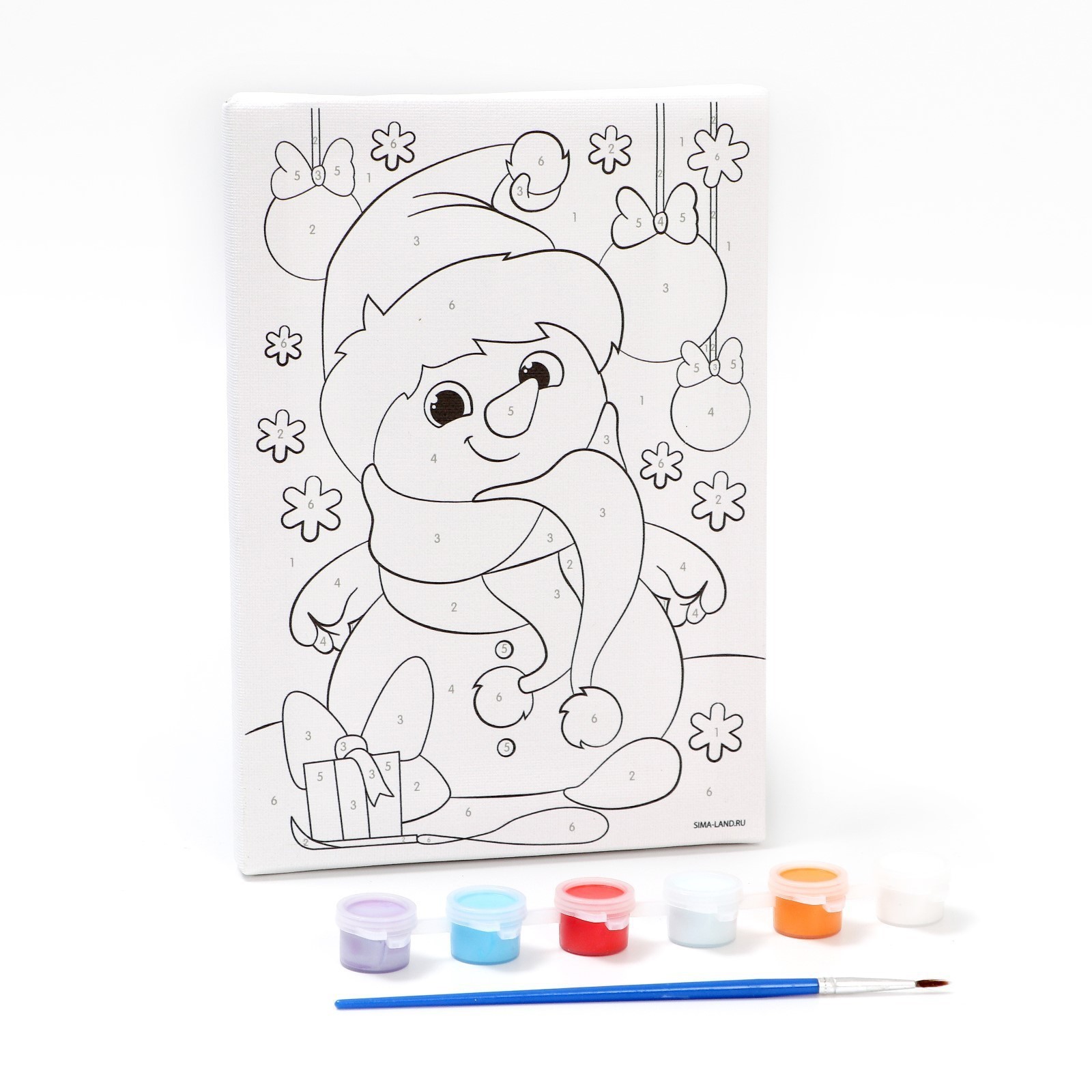 Картина по номерам на холсте с подрамником на новый год «снеговичок с подарком», 15 х 21 см. Создаём картину с новогодним сюжетом своими руками!Подарите маленькому художнику картину по номерам, и он сразу почувствует приближение самого волшебного праздника! Рисунок представляет собой знакомую ребёнку раскраску. В каждом секторе рисунка есть цифра, которая обозначает цвет краски. Можете пользоваться подсказкой для раскрашивания, а можете вместе фантазировать и смешивать краски! Новогодняя картина по номерам украсит детскую комнату или станет оригинальным подарком близкому человеку. Для кого:Унисекс|Размер, см:21 х 15|Возраст:От 3 лет|Тематика:Новогодняя|Символ года:Нет|Тематика праздника:Новый год|Ориентация изображения:Вертикально|Вид:Холст под роспись|Темпер. ограничение НЕ НИЖЕ :-30|Уровень сложности:Лёгкий|Комплектация набора:С кисточками|Комплектация набора:С красками|Страна:Россия  развернуть описание ▼