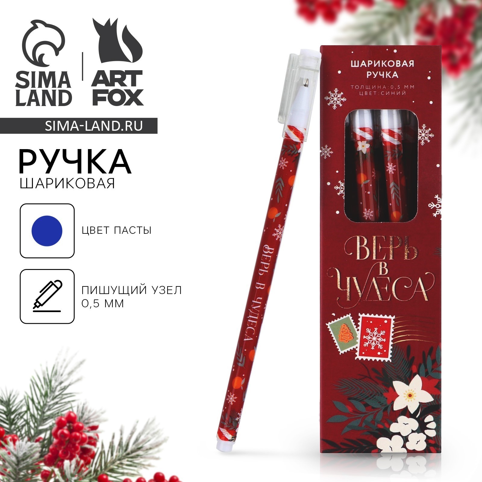 Ручка шариковая, синяя паста, 0.5 мм, пластик, с колпачком «верь в чудеса». Ручка торговой марки ArtFox отлично подойдет в качестве подарка. Яркий дизайн несомненно привлечет внимание и будет выделяться среди других предметов, а удобная форма корпуса позволит использовать ее с комфортом. Цвет стержня: синий;Стержень заменяемый: да;Материал: пластик;Форма корпуса: круглая.Диаметр пишущего узла, мм:0.5|Набор:Нет|Цвет стержня:Синий|Европодвес:Нет|Тематика:Новогодняя|Вид упаковки:Коробка картонная|Символ года:Нет|Тематика праздника:Новый год|Адресат:Жене|Адресат:Учителю|Материал:Пластик|Материал упаковки:Картон|Составляющие набора:Ручка|Штрихкод на единице товара:Да|Наличие грипа:Нет|Страна:Китай  развернуть описание ▼