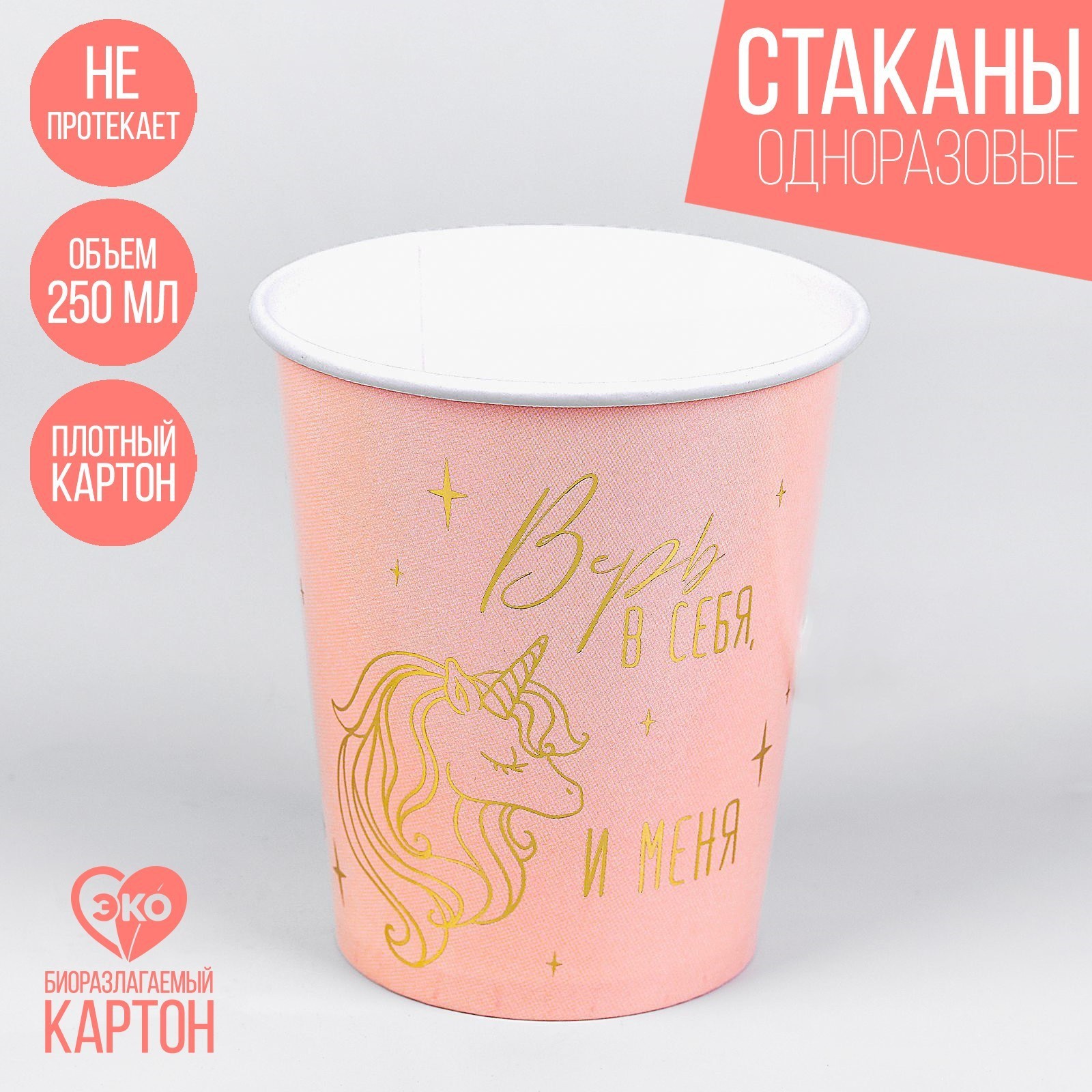 Cтаканы бумажные «верь в себя», единорог, с тиснением, 250 мл, набор 10 шт Cтаканы бумажные «верь в себя», единорог, с тиснением, 250 мл, набор 10 шт