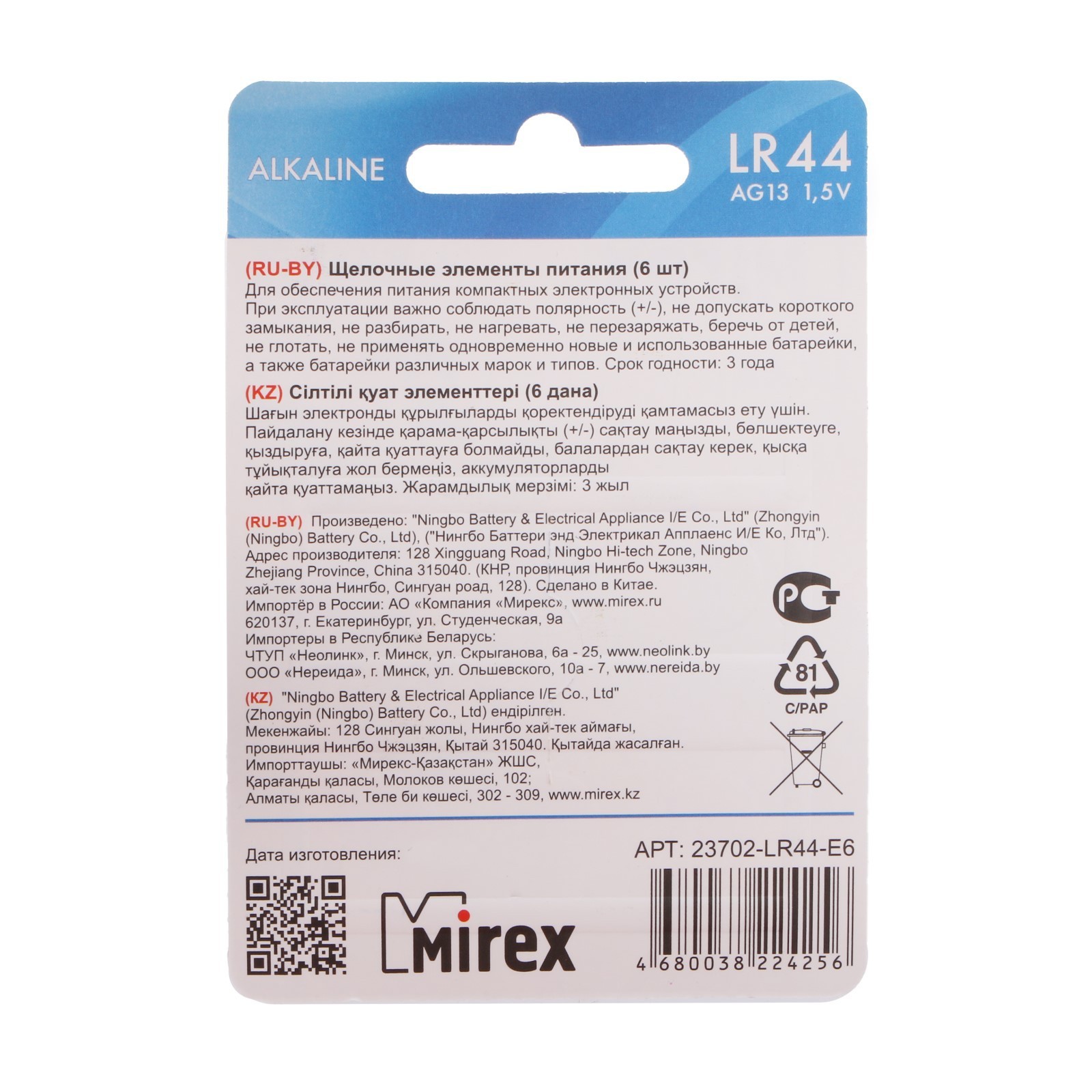 Батарейка алкалиновая Mirex, Lr44, Ag13, 1.5в, блистер, 6 шт
