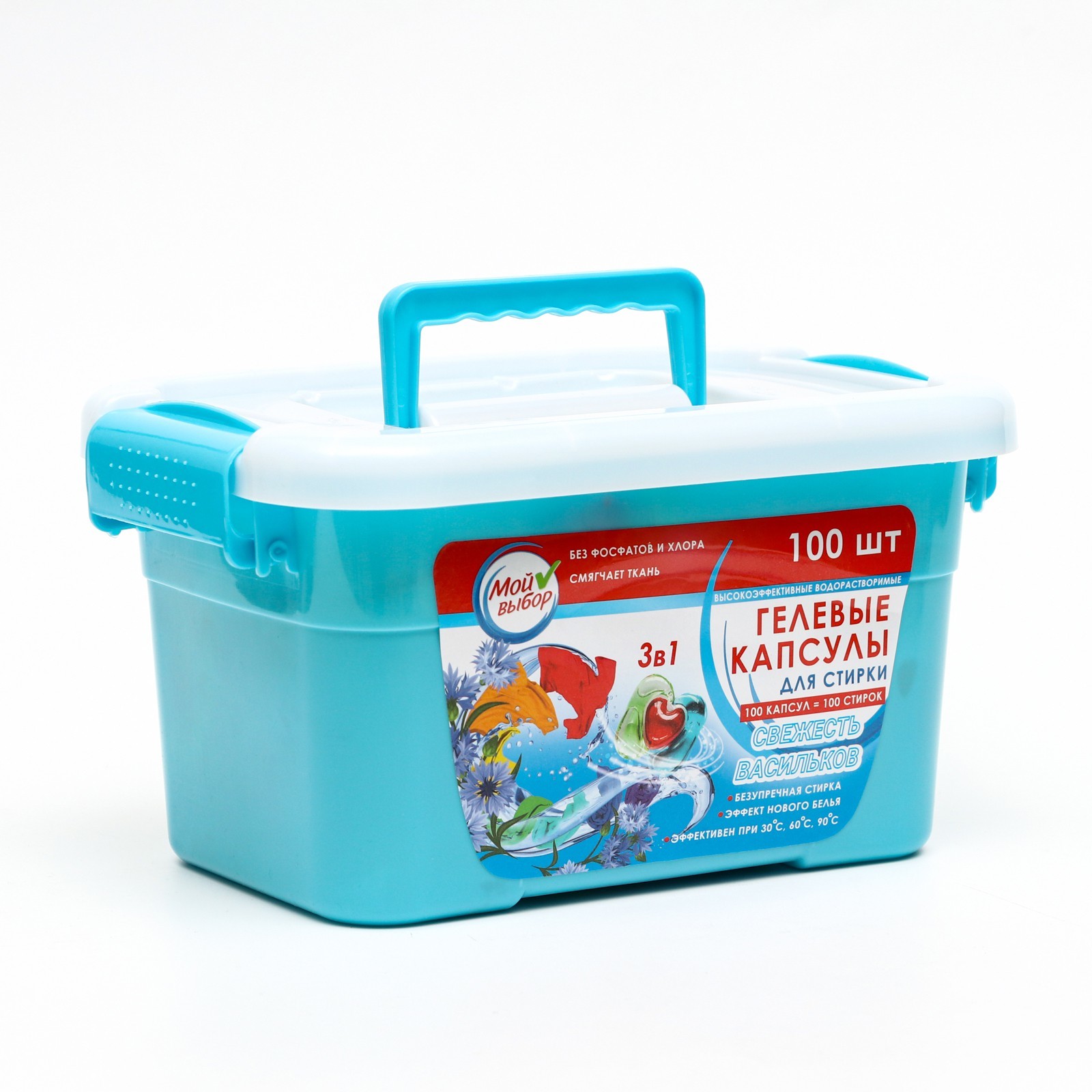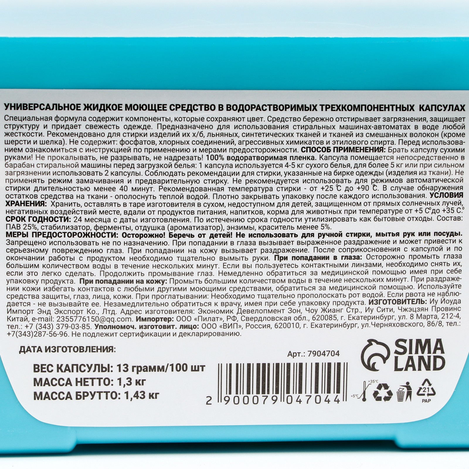 Капсулы для стирки 3в1, "свежесть васильков", 100*13 г. Специальная формула содержит компоненты, которые сохраняют цвет. Средство бережно отстирывает загрязнения, защищает структуру и придает свежесть одежде. Предназначено для использования стиральных машинах-автоматах в воде любой жесткости. Рекомендовано: для стирки изделий из х/б, льняных, синтетических тканей и тканей из смешанных волокон (кроме шерсти и шелка). Не содержит: фосфатов, хлорных соединений, агрессивных химикатов и этилового спирта. Перед использованием ознакомиться с инструкцией по применению и мерами предосторожности. Способ применения: Брать капсулу сухими руками! Не прокалывать, не разрывать, не надрезать! 100% водорастворимая пленка. Капсула помещается непосредственно барабан стиральной машины перед загрузкой белья: 1 капсула используется 4-5 кг сухого белья, для более 5 кг или при сильном загрязнении использовать 2 капсулы. Соблюдать рекомендации для стирки, указанные на бирке одежды (изделия из ткани). Не применять режим замачивания и предварительную стирку. Не рекомендуется использовать для режимов автоматической стирки длительностью менее 40 минут. Рекомендованная температура стирки - от +25 С до +90 С. В случае обнаружения остатков средства на ткани - ополоснуть теплой водой. Плотно закрывать упаковку после каждого использования. Условия хранения: Хранить, оставлять в таре изготовителя в сухом, недоступном для детей месте, защищенном от прямых солнечных лучей, негативных воздействий месте, вдали от продуктов питания, напитков, корма для животных при температуре от +5 С°до+35 С. Состав: ПАВ 25%, стабилизатор, ферменты, отдушка (ароматизатор), энзимы, краситель менее 5%. Меры предосторожности: Осторожно! Беречь от детей! Не использовать для ручной стирки, мытья рук или посуды. Объём, л: 13 В упаковке, шт.: 100 Назначение: Для всех видов тканей Вид стирки: Автомат Количество компонентов: 3  развернуть описание ▼