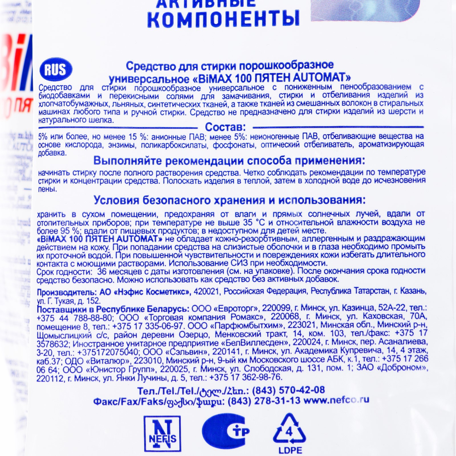 Стиральный порошок bimax "100 пятен", автомат, 6 кг. Стиральный порошок BiMax "100 пятен", автомат, 1. 5 кг Устраняет Топ 10 пятен: 1. Шоколад 2. Трава 3. Вишня 4. Красное вино 5. Помада 6. Томат 7. Сок апельсина 8. Чернила 9. Кофе 10. Пудра. Напитки: Кола, Квас, Пиво, Компот, Какао, Чай, Молоко. Фруктово-ягодные загрязнения: Апельсин, Малина, Клубника, Черника, Смородина, Гранат, Фруктовое пюре. Десерты: Йогурт, Мороженое, Джем, Торт, Суфле, Пудинг, Варенье, Леденцы. Кухня: Мясо, Рыба, Свекла, Морковь, Растительное масло, Яичный желток, Майонез, Сметана, Соевый соус, Горчица, Суп, Шашлык. Прочие пятна: Сажа, Машинное масло, Кровь, Акварельные краски, Фломастеры, Карандаши, Цветочная пыльца. Способ применения: На 4-5 кг загрязненного белья использовать 151 гр порошка при сильном и среднем загрязнение и средней жесткости воды и 188 гр при жесткой воде и 188 гр при жесткой воде. Состав: 5% или более, но менее 15%: анионные ПАВ; менее 5%: неионогенные ПАВ, мыло (соли жирных кислот), отбеливающие вещества на основе кислорода, энзимы, поликарбоксилаты, оптический отбеливатель, фосфонаты, ароматизирующая добавка (в т. ч. гексилциннамаль). Меры предосторожности Использовать средство только по назначению. Хранить в недоступном для детей месте. Хранить вдали от пищевых продуктов. Хранить с закрытой крышкой. Хранить в сухом, прохладном и темном месте. Вес, кг: 6 Назначение: Для цветных тканей Вид стирки: Автомат : 0  развернуть описание ▼