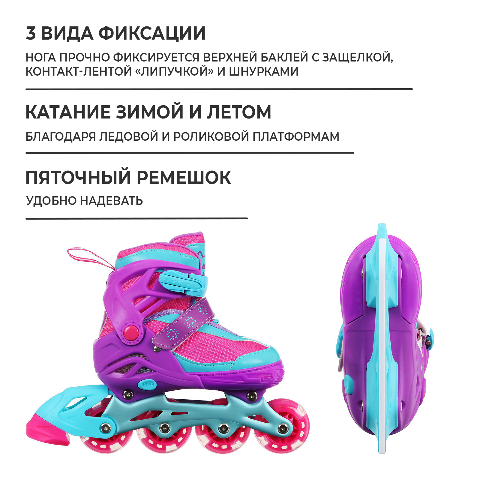 Коньки детские раздвижные snow cat, с роликовой платформой, р. 30-33. Коньки подходят для катания на открытом льду и крытых катках. Их легко надеть, отрегулировать и зафиксировать с помощью пластиковых клипс, которые расположены на голенище и в области ступни. Жёсткий корпус ботинка защищает ногу от травм, гарантирует плотную посадку и поддерживает голеностоп. Коньки регулируются на 4 размера, это позволяет использовать их в течение нескольких сезонов. Для изменения размера необходимо зажать кнопку Push у основания пятки и раздвинуть две части пластикового каркаса до нужного положения. Универсальное лезвие из нержавеющей стали не поддаётся коррозии. Рекомендации по эксплуатации Удаляйте влагу с лезвия мягкой тканью. Сушите при комнатной температуре вдали от отопительных приборов. Используйте чехлы для лезвий коньков во время хранения и перехода к ледовой площадке. Заточите лезвия после покупки и повторяйте эту процедуру по мере необходимости для комфортного катания. Особенности Максимальная нагрузка: 40 кг. Максимальная температура катания: до –10 °С. Набор не предназначен для коммерческого использования и в пунктах проката. Цвет: Фиолетовый Цвет: Голубой Для кого: Для девочки Возраст: От 6 лет Диаметр колеса, мм: 6.2 Размер обуви: 30 Размер обуви: 33 Материал рамы: Металл Материал колёс: Пластиковые Материал подкладки: Велюр Серия: Без серии Раздвижные коньки: Да Тип коньков: Детские Роликовая платформа: Да Материал верха: Текстиль Материал верха: Пластик Подходят для проката: Нет Материал лезвия: Нержавеющая сталь  развернуть описание ▼
