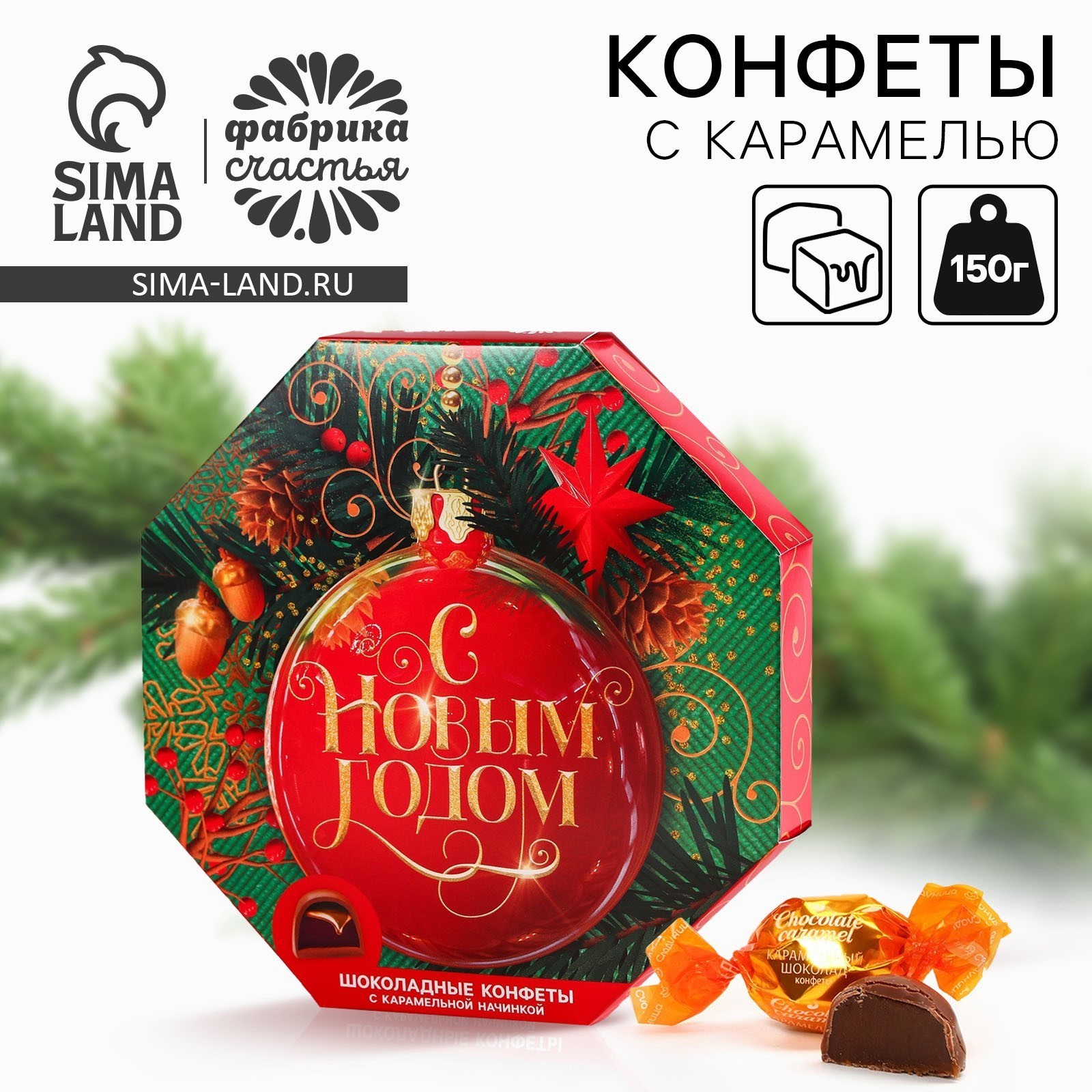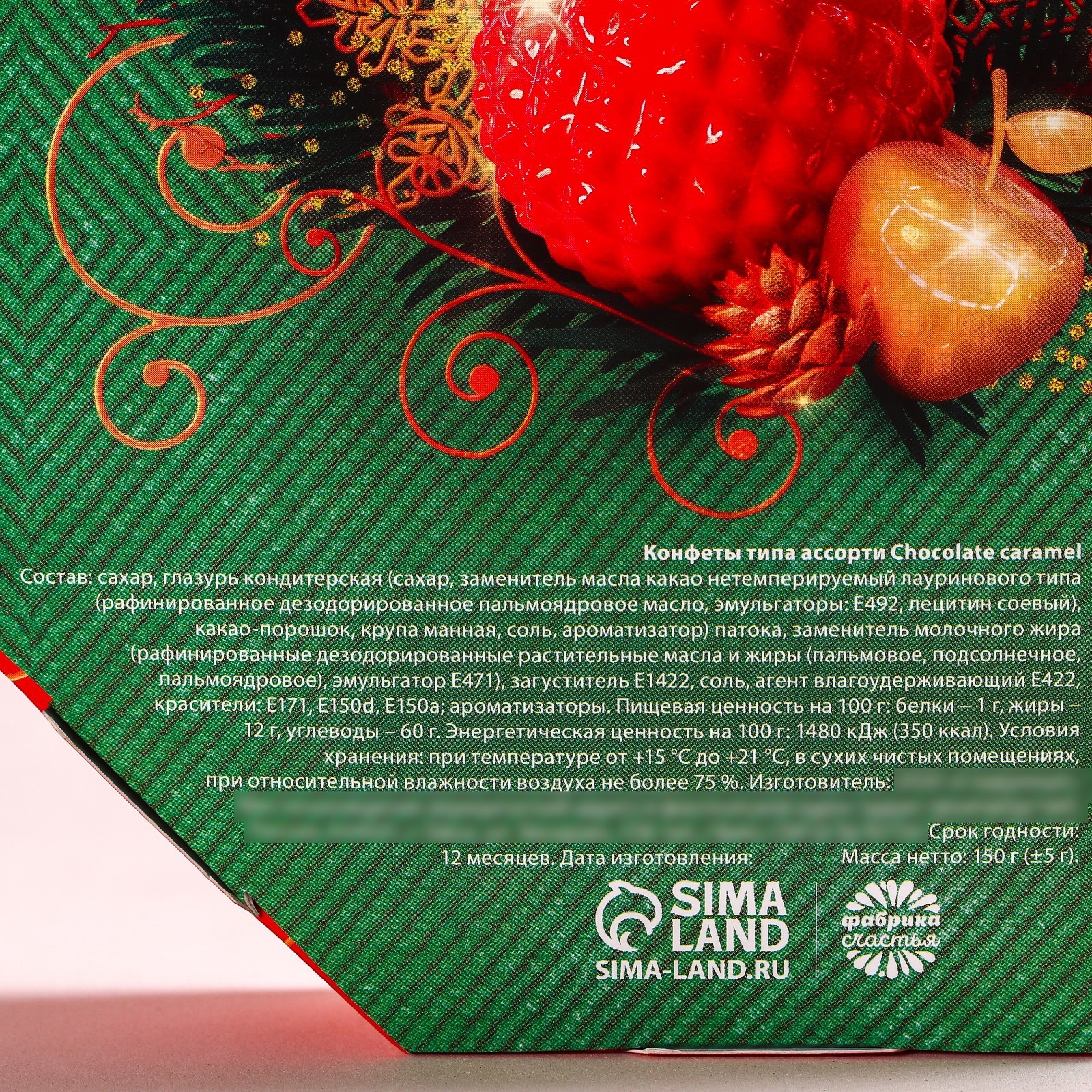 Конфеты шоколадные в коробке «с новым годом», 150 г. При оформление заказа, просим запрашивать актуальные сроки годности у менеджераСостав: сахар, глазурь кондитерская (сахар, заменитель масла какао нетемперируемый лауринового типа (рафинированное дезодорированное пальмоядровое масло, эмульгаторы: Е492, лецитин соевый), какао-порошок, крупа манная, соль, ароматизатор) патока, заменитель молочного жира (рафинированные дезодорированные растительные масла и жиры (пальмовое, подсолнечное, пальмоядровое), эмульгатор Е471), загуститель Е1422, соль, агент влагоудерживающий Е422, красители: Е171, Е150d, Е150а; ароматизаторы. Срок годности: 12 месяцев Масса нетто: 150 г (±5 г) Вес нетто, г:150|Вид упаковки:Подарочная коробка|Тематика праздника:Новый год|Вкус:Карамель|Вид:Шоколадные|Страна:Россия  развернуть описание ▼