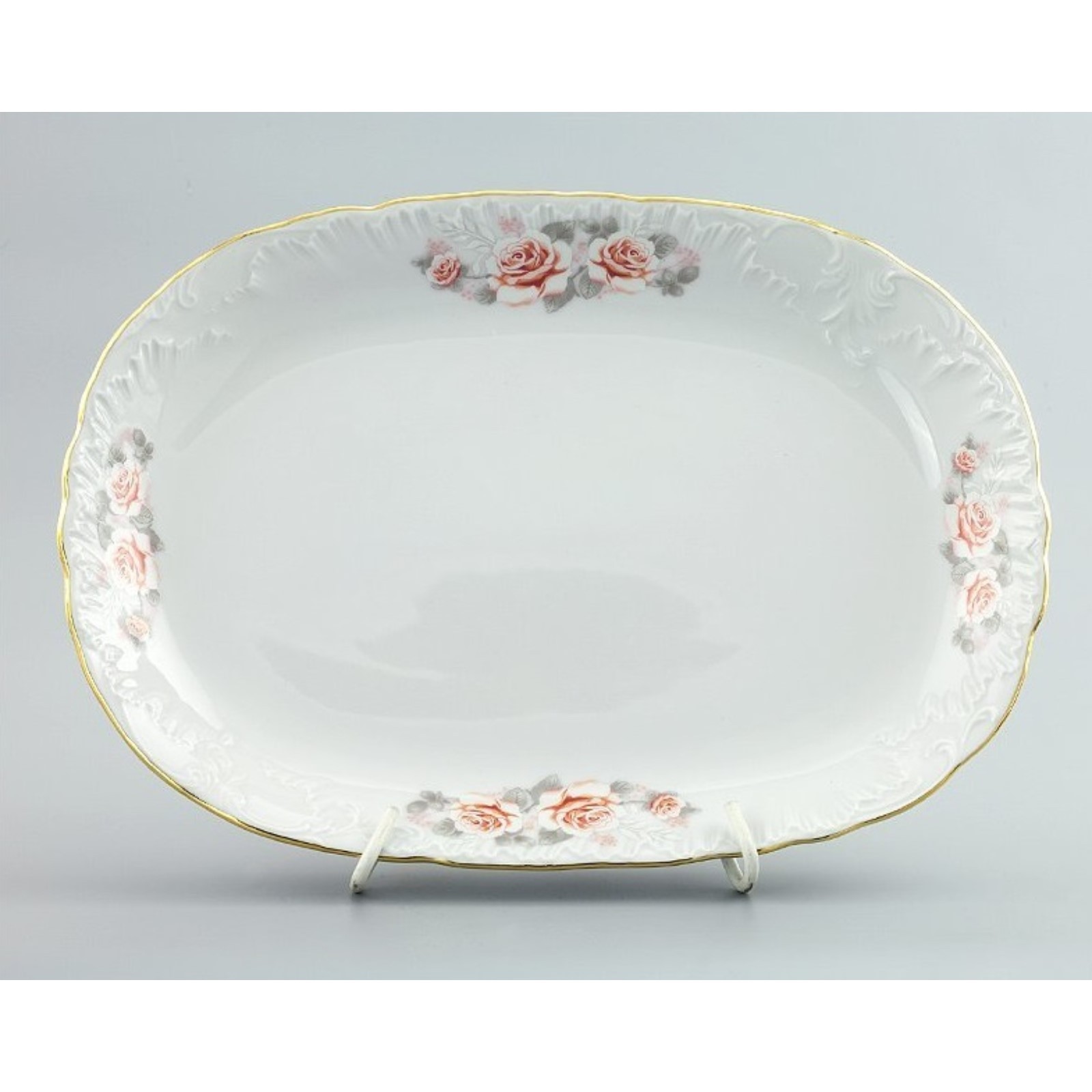 Блюдо овальное 33 см, Rococo, декор «бледные розы, отводка золото»