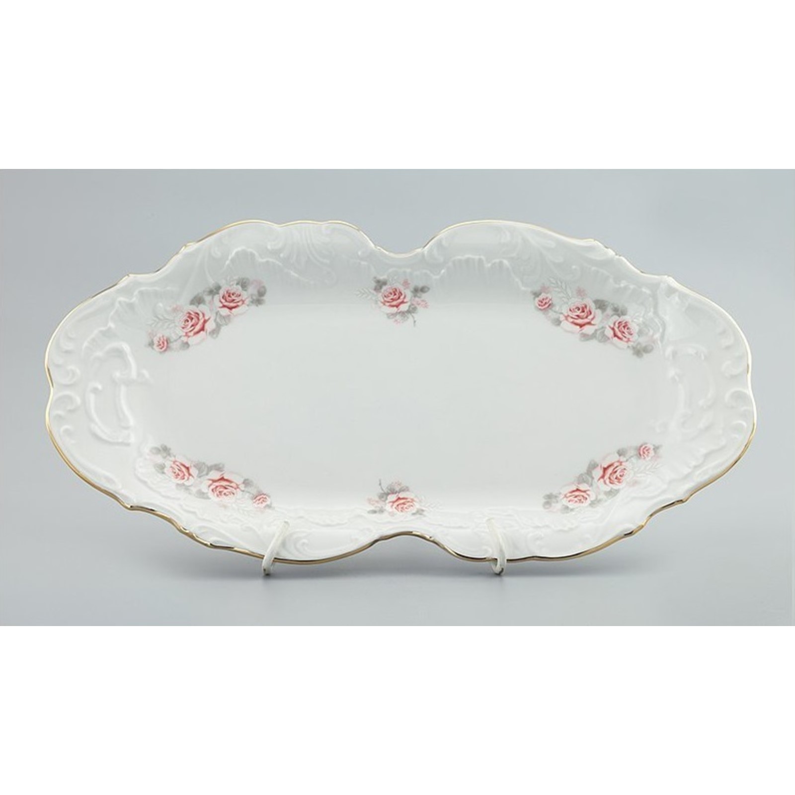 Блюдо прямоугольное 36 см, Rococo, декор «бледные розы, отводка золото»