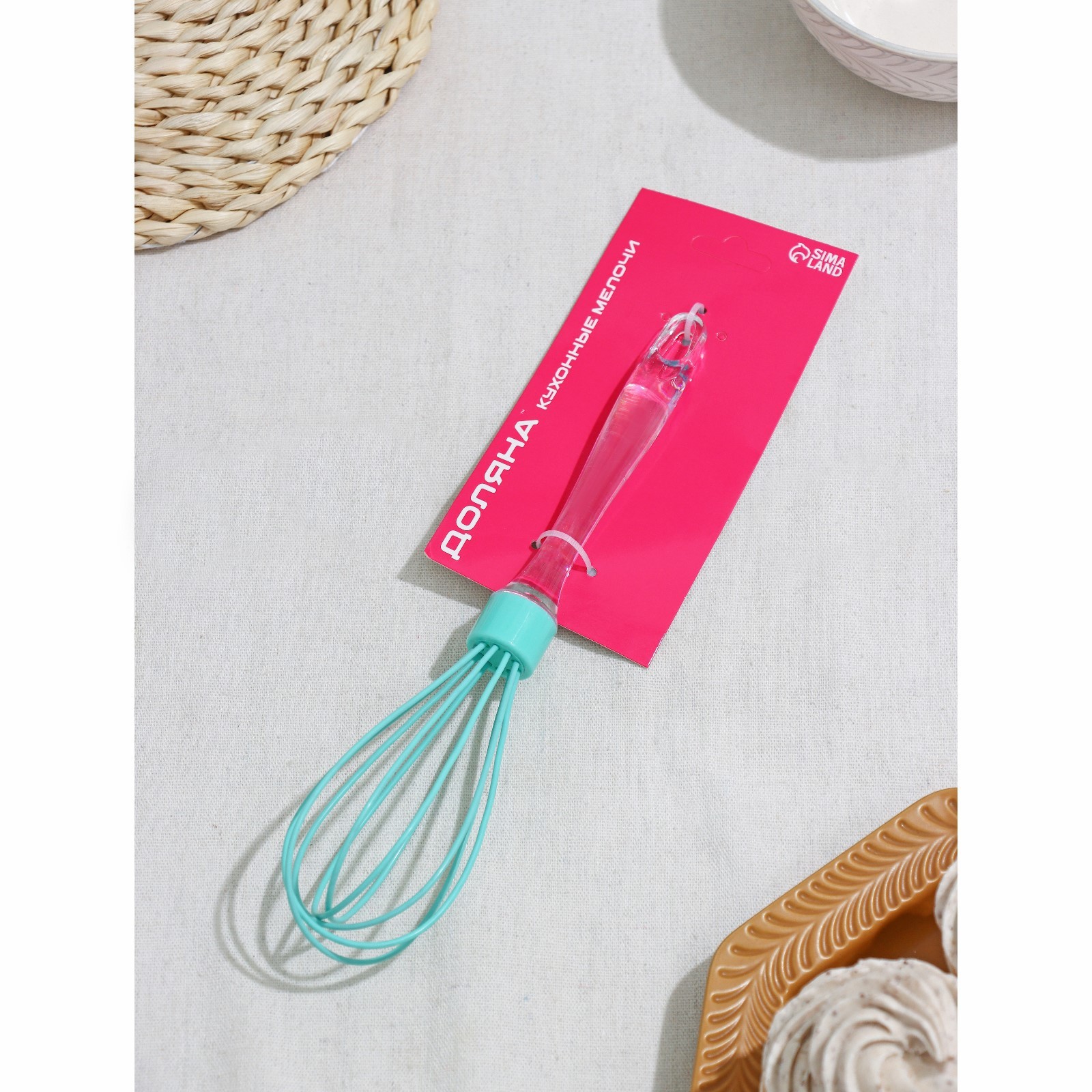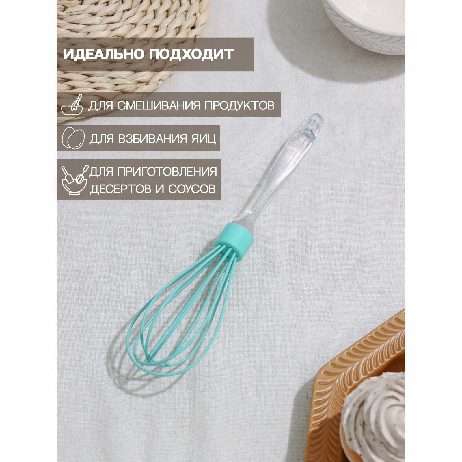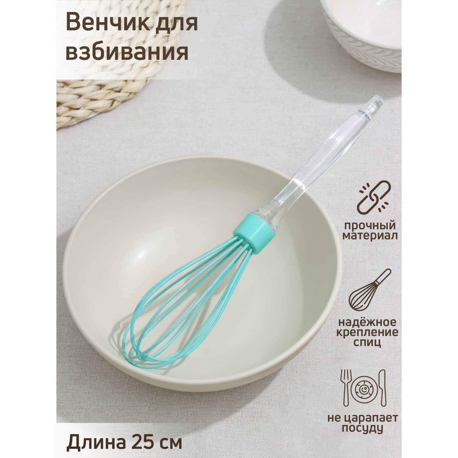 Венчик для взбивания доляна «лёд», 25 см, цвет бирюзовый. Быстро взбить яйца для завтрака, перемешать ингредиенты для соуса, сделать тесто для блинов или приготовить вкуснейший кляр без комочков — с этими задачами справится незаменимый кухонный венчик «Лёд». Преимущества: Это отличная альтернатива увесистому миксеру: не требует много времени и места на установку, работает без электричества. Венчик поможет быстро взбить крем из белков и жирных сливок для украшения кондитерских изделий, а также перемешать ингредиенты для приготовления пышных оладий. Дизайн венчика отлично украсит вашу кухню. Цвет: Бирюзовый Материал ручки: Пластик Материал: Силикон Материал рабочей части: Металл Можно мыть в посудомоечной машине: Нет  развернуть описание ▼