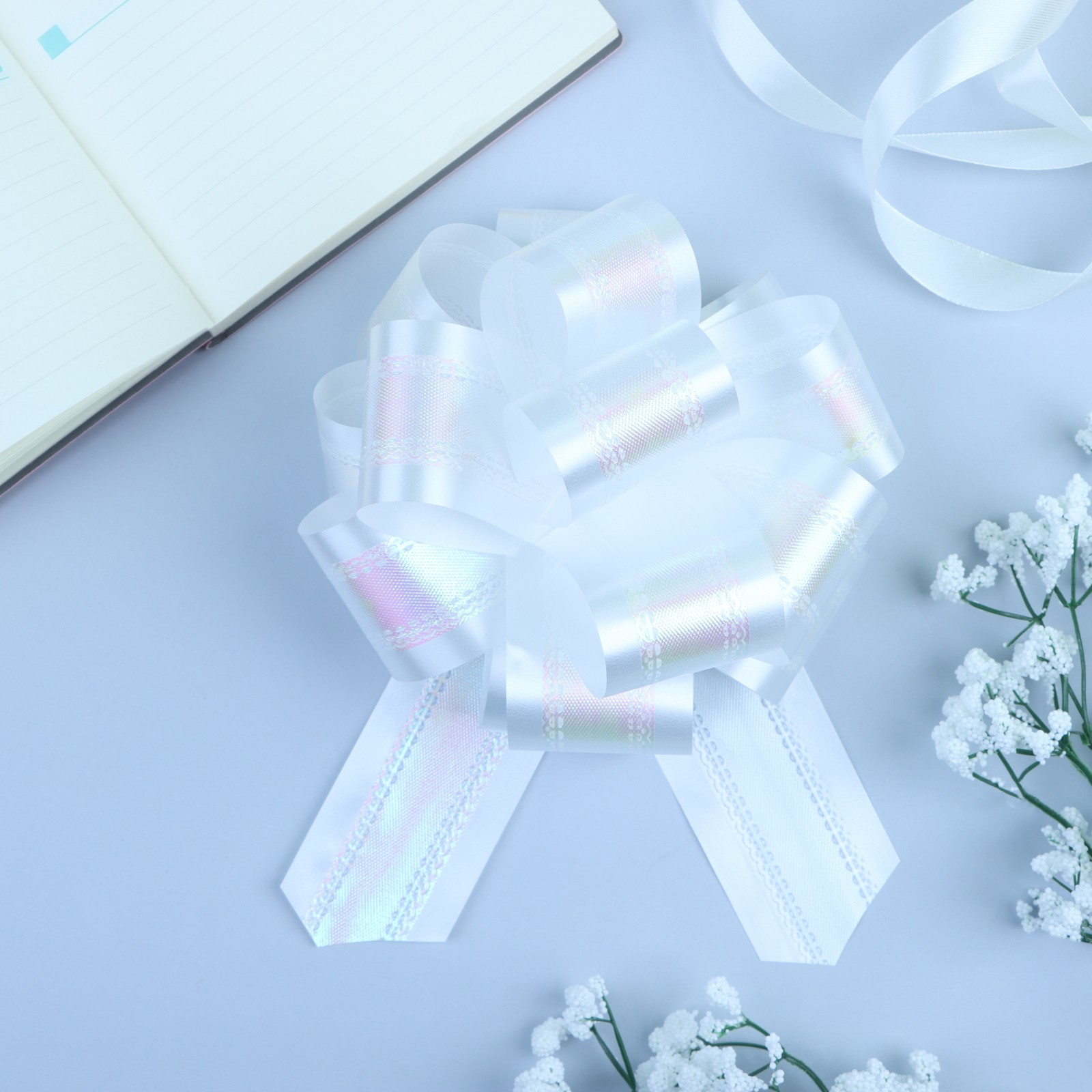 Подарочный бант - шар №5 перламутровый, белый, для упаковки подарков. Бант для упаковки подарков — это стильный и яркий аксессуар, который добавляет индивидуальности и шарма любому презенту. Банты для упаковки подарков идеально подходят для празднования дня рождения, свадьбы, 8 Марта, 14 и 23 Февраля, а также для украшения торжеств. Они могут быть использованы для оформления цветочных композиций, подарочных коробок, открыток и других предметов. Банты для упаковки подарков доступны в разных цветах и дизайнах, что позволяет выбрать подходящий вариант для любого случая. Использование бантов для упаковки подарков и украшения торжеств помогает создать атмосферу праздника, радости и веселья. Они добавляют изюминку и делают подарки более запоминающимися и приятными. Для того чтобы собрать бант, надо потянуть за две ленточки, находящиеся между широкими лентами, удерживая широкие ленты в месте спайки. Бант собирается за несколько секунд. Набор:Нет|Особенности цвета:Перламутровый|Цвет:Белый|Диаметр, см:15|Ширина ленты, см:5|Тематика:Узоры|Тематика праздника:8 Марта|Тематика праздника:Универсальная тематика|Тематика праздника:Свадьба|Тематика праздника:День рождения|Материал:Пластик|Вид банта:Шар|Страна:Китай  развернуть описание ▼