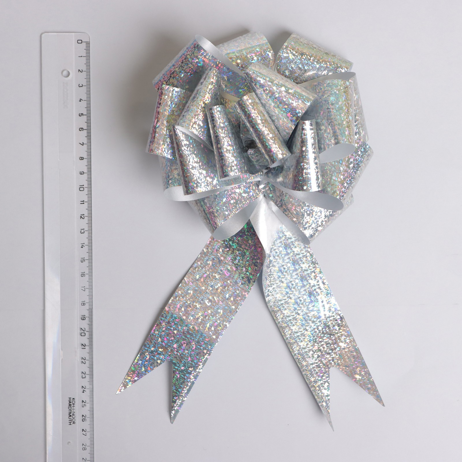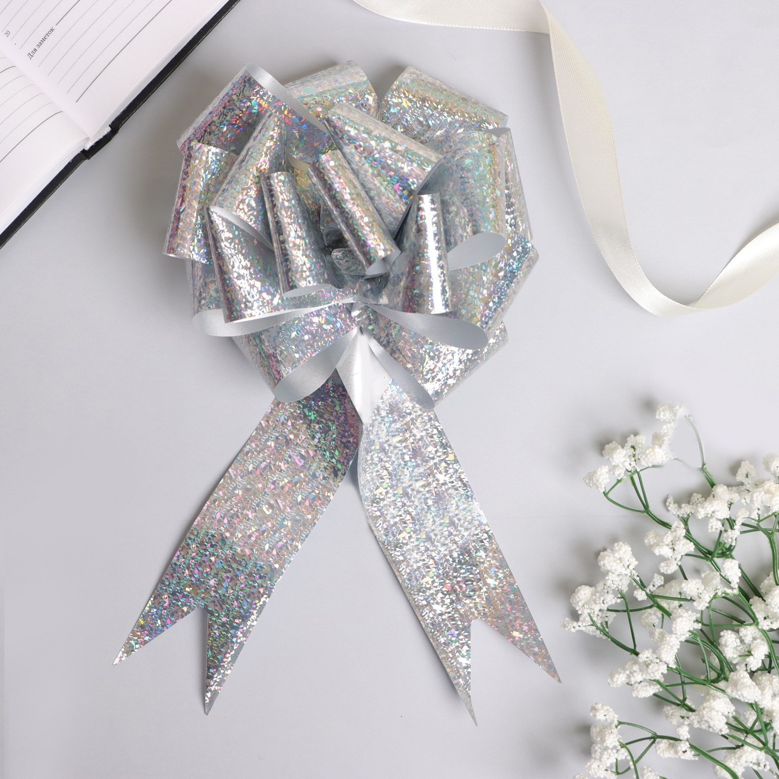 Подарочный бант - шар №5 голография, цвет серебряный, для упаковки подарков. Бант для упаковки подарков — это стильный и яркий аксессуар, который добавляет индивидуальности и шарма любому презенту. Банты для упаковки подарков идеально подходят для празднования дня рождения, свадьбы, 8 Марта, 14 и 23 Февраля, а также для украшения торжеств. Они могут быть использованы для оформления цветочных композиций, подарочных коробок, открыток и других предметов. Банты для упаковки подарков доступны в разных цветах и дизайнах, что позволяет выбрать подходящий вариант для любого случая. Использование бантов для упаковки подарков и украшения торжеств помогает создать атмосферу праздника, радости и веселья. Они добавляют изюминку и делают подарки более запоминающимися и приятными. Для того чтобы собрать бант, надо потянуть за две ленточки, находящиеся между широкими лентами, удерживая широкие ленты в месте спайки. Бант собирается за несколько секунд. Набор:Нет|Особенности цвета:Голографический|Цвет:Серебристый|Диаметр, см:5|Ширина ленты, см:5|Тематика:Однотонная|Тематика праздника:Свадьба|Тематика праздника:Универсальная тематика|Тематика праздника:8 Марта|Тематика праздника:День рождения|Материал:Пластик|Вид банта:Шар|Страна:Китай  развернуть описание ▼