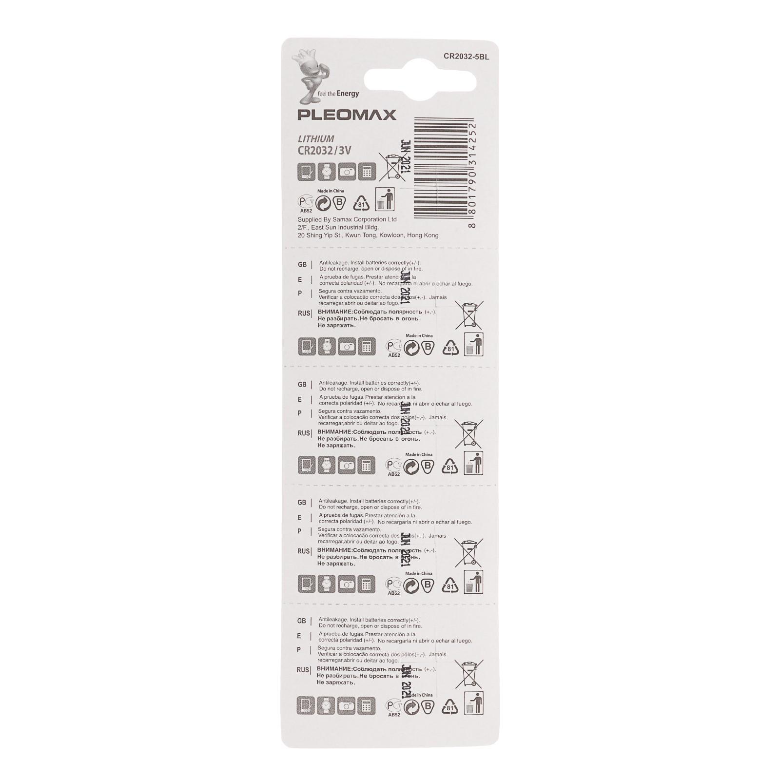 Батарейка литиевая pleomax, cr2032-5bl, 3в, блистер, 5 шт.. Кнопочные батарейки классифицируют по высоте, диаметру, напряжению, ёмкости, химическому составу. Перед покупкой посмотрите наименование вашего элемента питания или требования от производителя к прибору и следуйте рекомендациям ниже, чтобы приобрести аналогичную батарейку. Первые две буквы в маркировке обозначают тип элемента. CR — литиевая батарейка, напряжение 3 В. LR — щелочная, 1, 5 В. SR — серебряно-цинковая, 1, 55 В. PR — воздушно-цинковая, 1, 4 В. После букв следуют три или четыре цифры, которые указывают на размеры изделия. Первая часть (одна или две цифры) характеризует диаметр в миллиметрах, а вторая — высоту в 1/10 мм. Значения округляются до целой части. Например: CR2016 — литиевый элемент, диаметр 20 мм, высота 1, 6 мм;LR621 — щелочной, диаметр 6, 8 мм, высота 2, 15 мм. Держите кнопочные батарейки подальше от маленьких детей! В упаковке, шт.: 5 Вид упаковки: Блистер Типоразмер батареек: CR2032 Тип батарейки: Литиевая  развернуть описание ▼
