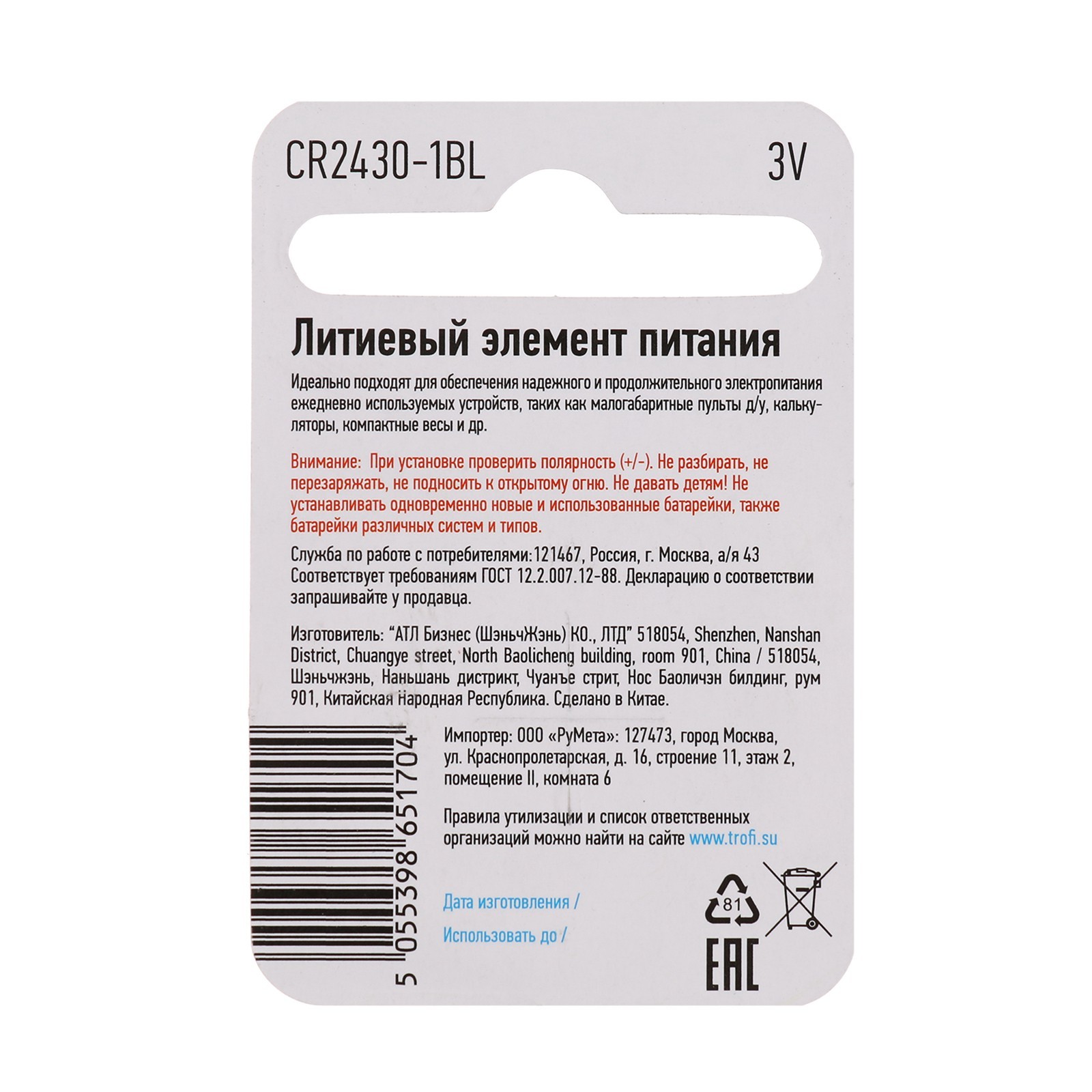 Батарейка литиевая "трофи", cr2430-1bl, 3в, блистер, 1 шт..