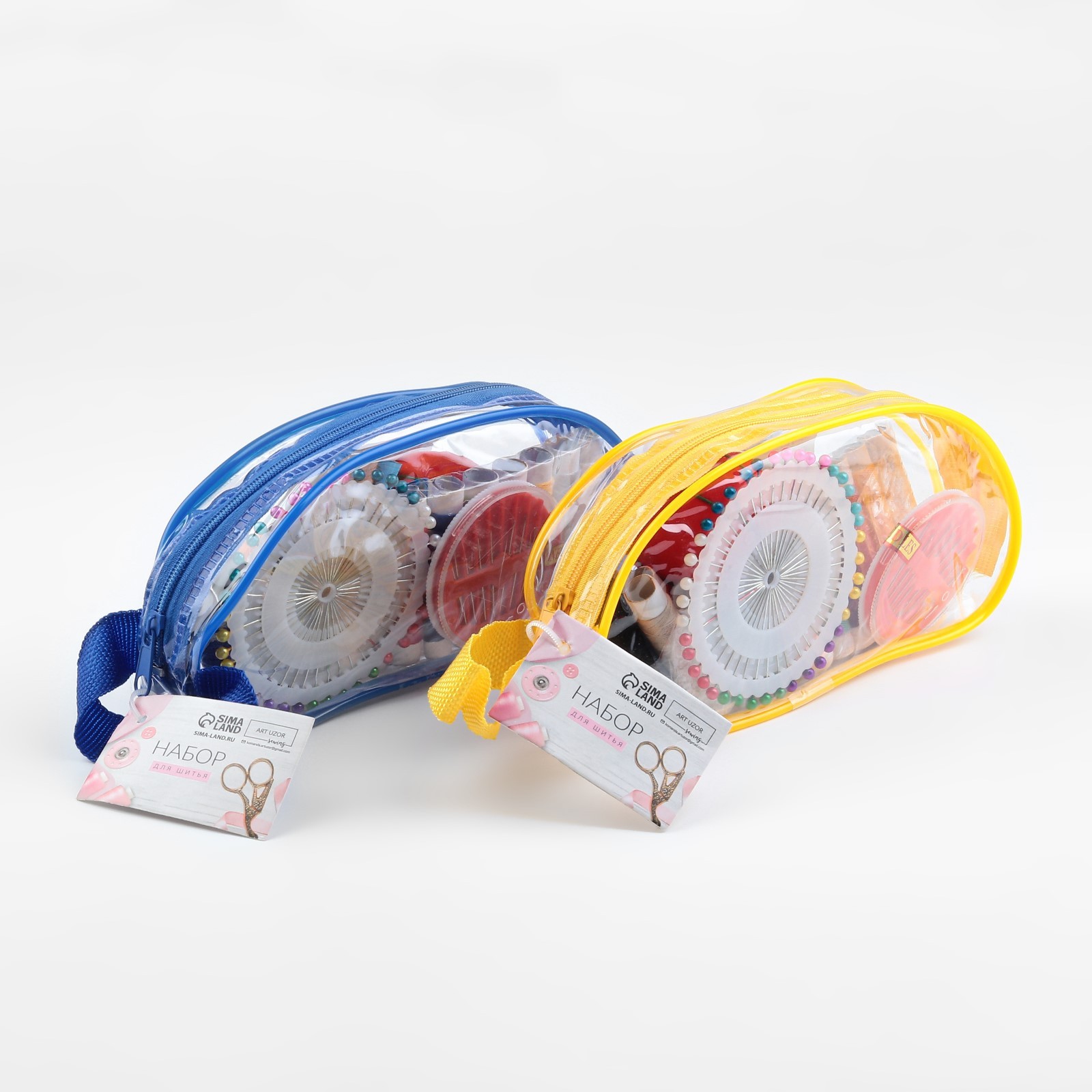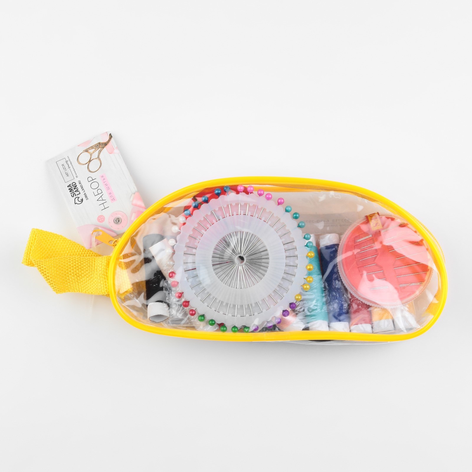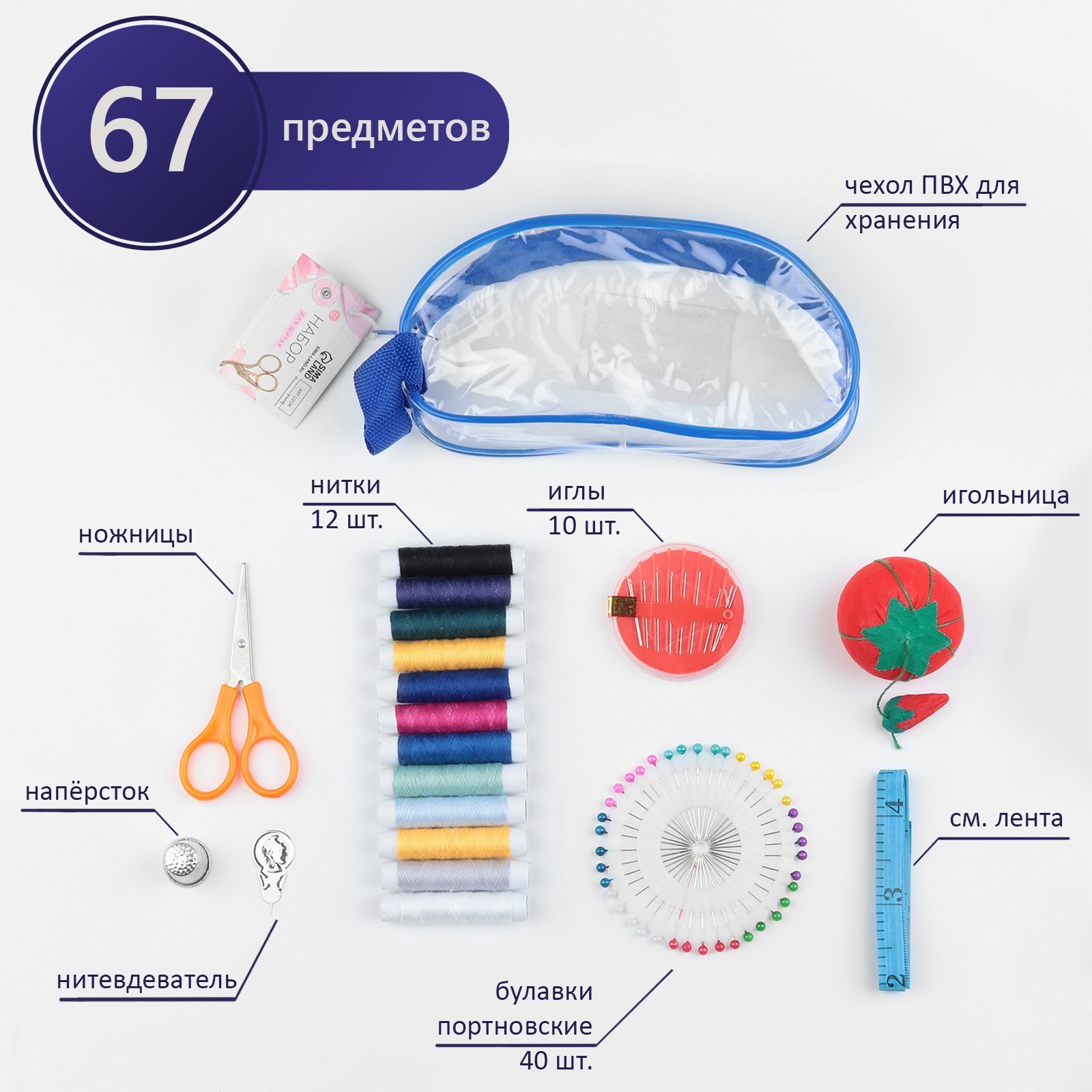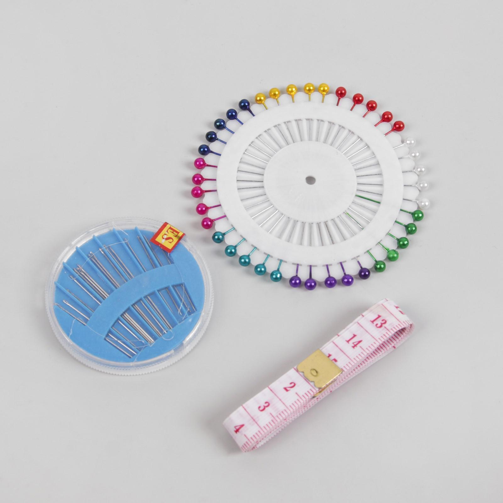нитки - 12 шт;иглы - 10 шт;булавки портновские - 40 шт;сантиметровая лента, 150 см - 1 шт;ножницы - 1 шт;напёрсток - 1 шт;нитевдеватель - 1 шт;игольница - 1 шт.