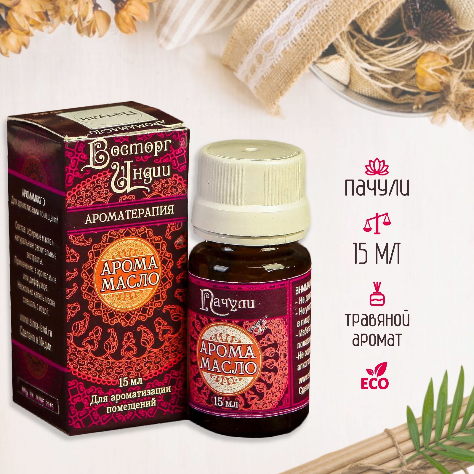 Аромамасло восторг индии 15 мл пачули. Ароматерапия сегодня считается модным и современным занятием. При этом ее история насчитывает тысячи лет – еще в древнем Китае существовал обычай воскуривать фимиам для создания гармоничной атмосферы в помещении. При этом приятный запах может влиять на состояние не только духа, но и тела. Экзотический, терпкий и дурманящий аромат пачули расслабляет и успокаивает, приводит в гармоничное состояние душу и тело, дарит вдохновение, пробуждает творческое начало и артистические способности. Кроме того, пачули – сильный афродизиак, усиливающий чувственность и помогающий привнести в привычные отношения новые яркие ноты. Сочетается с ароматами гвоздики, розы, лаванды, жасмина, герани, имбиря, ладана, бергамота, мирры, лемонграсса. Набор:Нет|Объём, мл:15|Аромат:Пачули|Группа ароматов:Трава|Страна:Индия  развернуть описание ▼