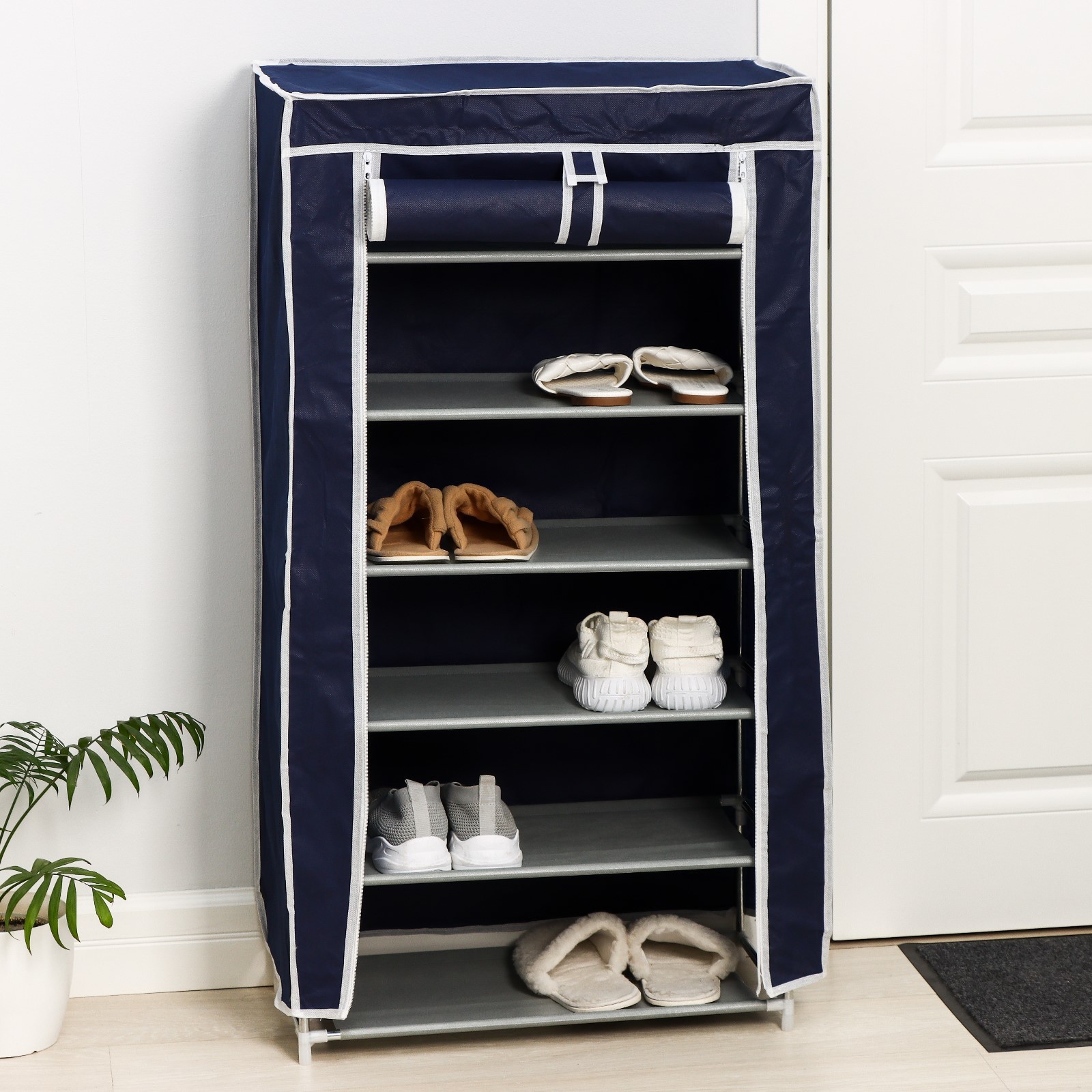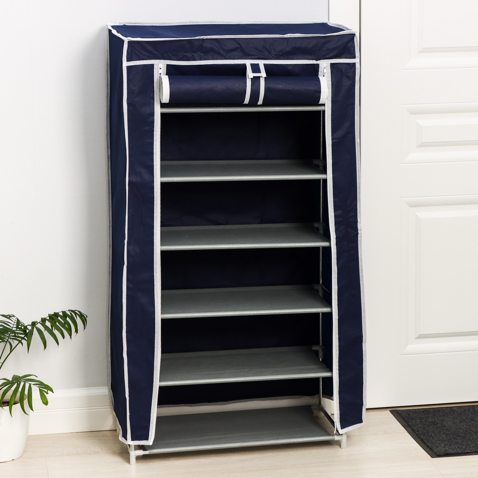 Обувница, 6 ярусов, 57x28x107 см, цвет синий. Цвет: Синий Ширина, мм: 570 Глубина, мм: 280 Высота, мм: 1070 parts count: 0 Количество секций: 6 На колёсиках: Нет Материал: Текстиль Вид установки: Напольный Поставляется в разобранном виде: Да  развернуть описание ▼