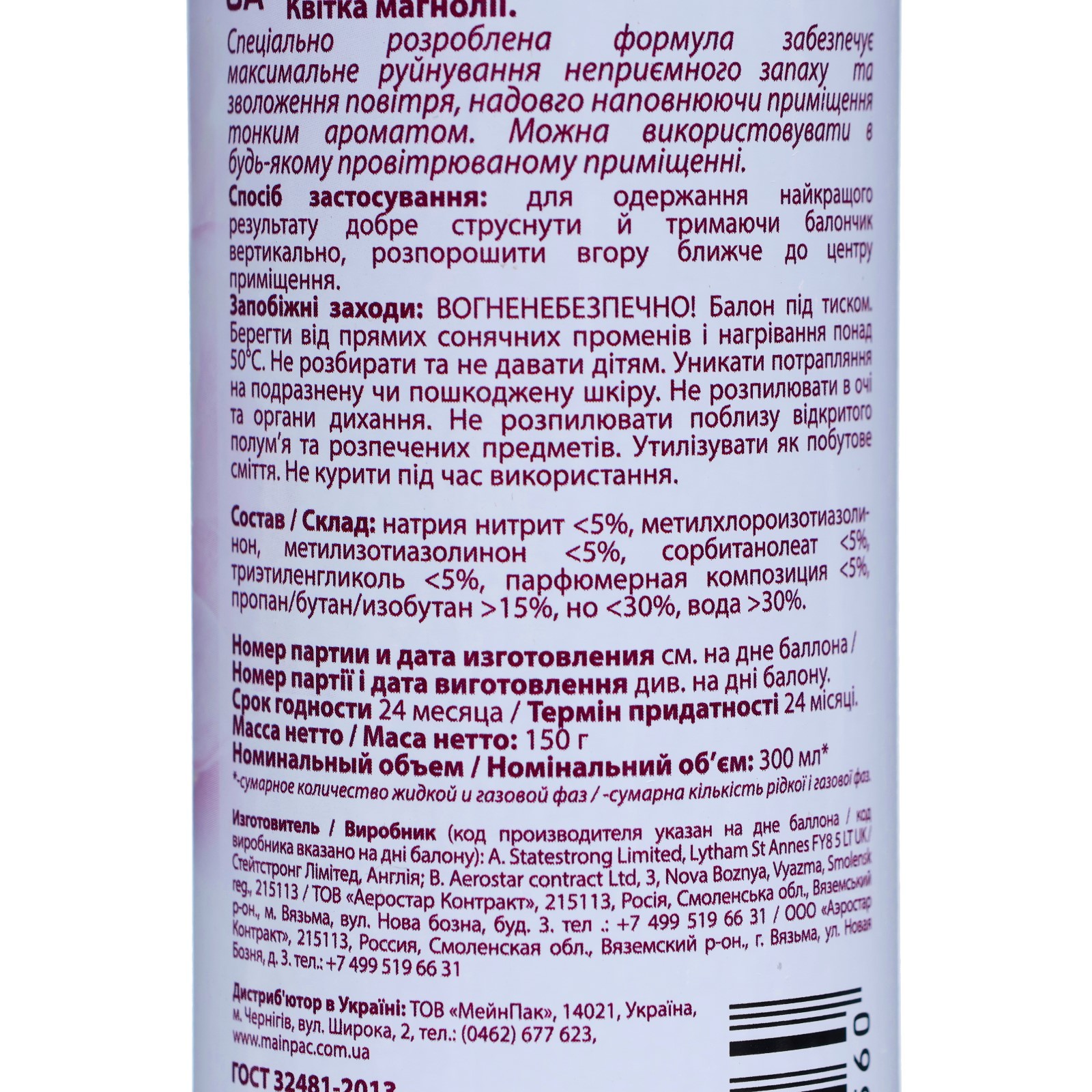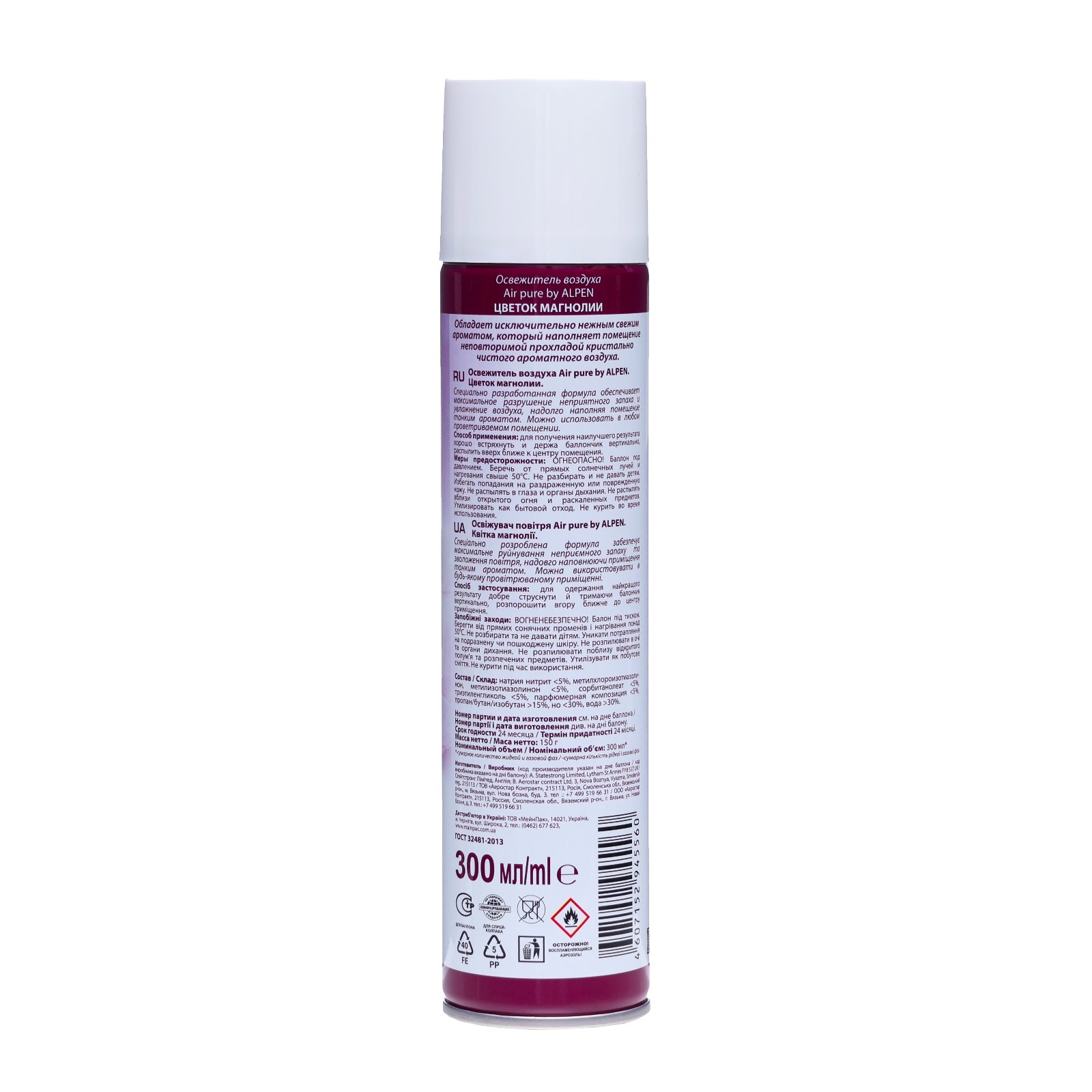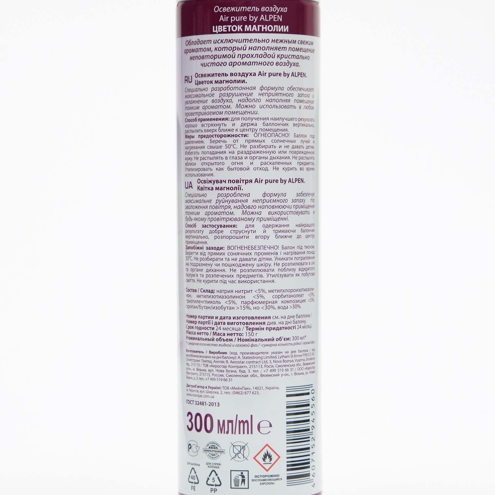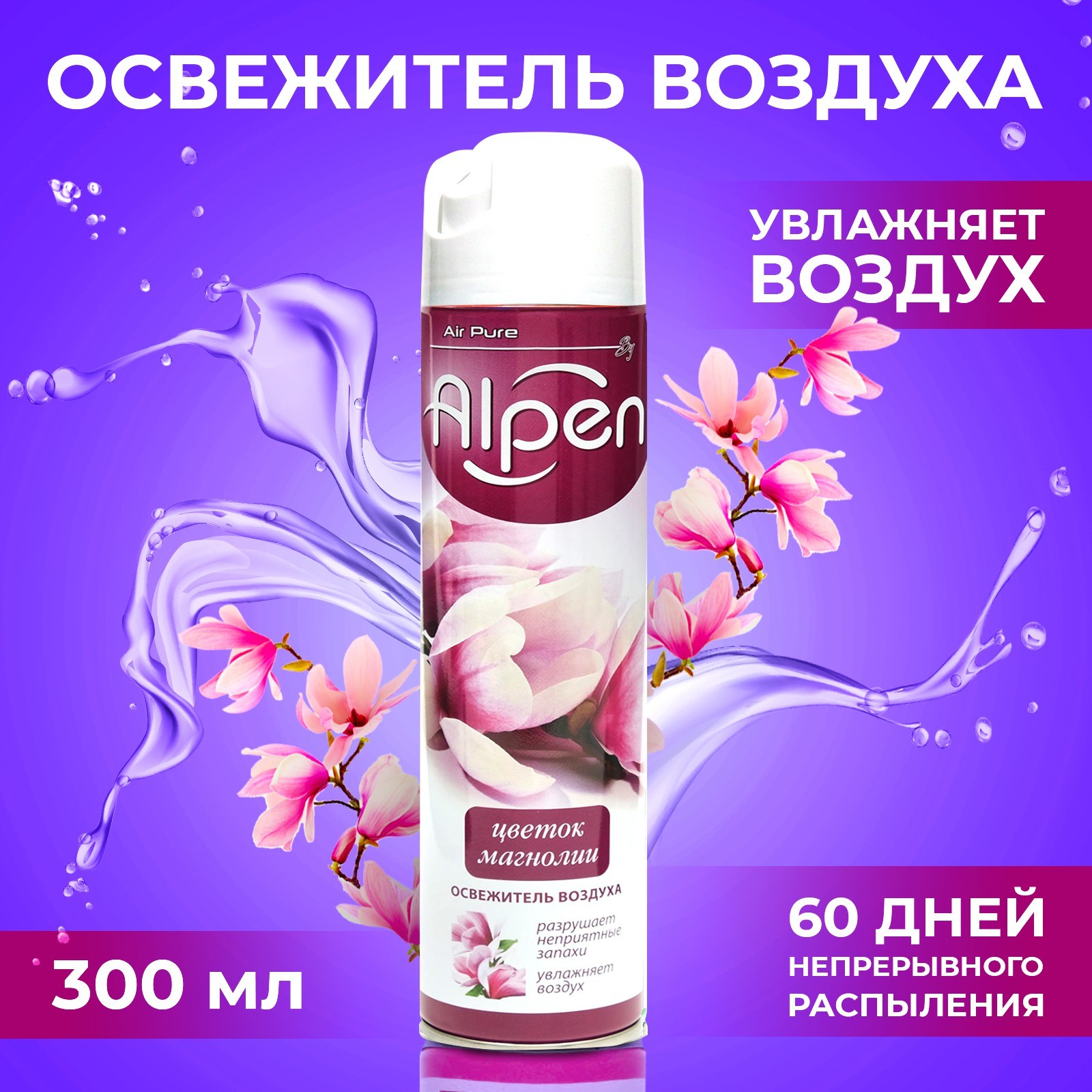 Освежитель воздуха alpen, цветок магнолии, 300 мл. Освежитель воздуха обладает исключительно нежным свежим ароматом, который наполняет помещение неповторимой прохладой кристально чистого ароматного воздуха. Специально разработанная формула обеспечивает максимальное разрушение неприятного запаха и увлажнения воздуха, надолго наполняя помещение тонким ароматом. Можно использовать в любом проветриваемом помещении. Способ применения: для получения наилучшего результата хорошо встряхнуть и держа баллончик вертикально, распылить вверх ближе к центру помещения. Меры предосторожности: огнеопасно! Баллон под давлением. Беречь от прямых солнечных лучей и нагревания свыше 50 °C. Не разбирать и не давать детям. Избегать попадания на раздраженную или поврежденную кожу. Не распылять в глаза и органы дыхания. Не распылять вблизи открытого огня и раскаленных предметов. Утилизировать как бытовой отход. Не курить во время использования. Состав: натрия нитрит 5%, метилхлороизотиазолинон, метилизотиазолинон 5%, сорбитанолеат 5%, триэтиленгликоль 5%, парфюмерная композиция, пропан, бутан, изобутан 15%, вода 30%. Объём, мл: 300 Аромат: Магнолия Форма выпуска: Спрей Принцип работы: Ручной Вид распыления: Влажное Температурное ограничение: Нет Тип: Освежитель воздуха  развернуть описание ▼