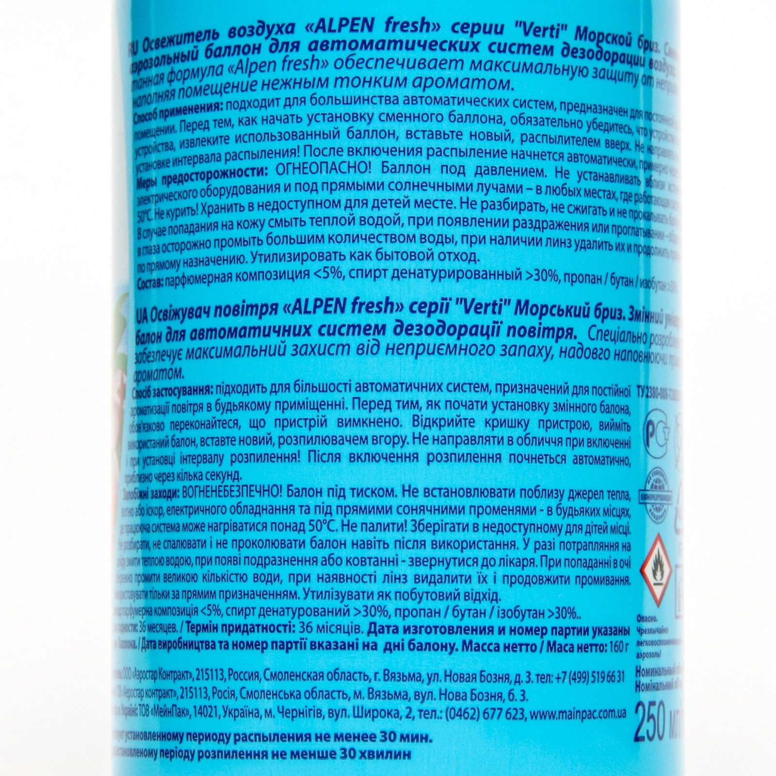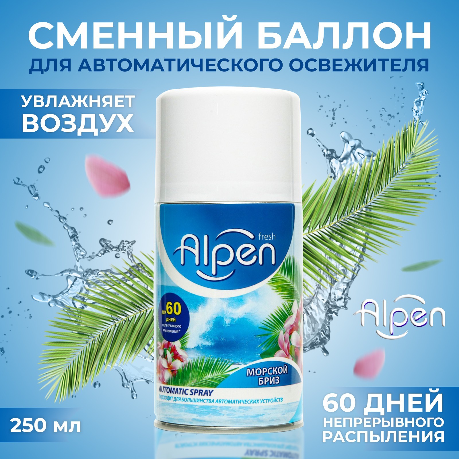 Сменный баллон для автоматического освежителя alpen, морской бриз, 250 мл. Сменный универсальный аэрозольный баллон для автоматических систем дезодорации воздуха. Специально разработанная формула «Alpen fresh» обеспечивает максимальную защиту от неприятного запаха, надолго наполняя помещение нежным тонким ароматом. Подходит для большинства автоматических систем, предназначен для повседневного использования в помещении. Способ применения: перед тем как начать установку сменного баллона, обязательно убедитесь, что устройство выключено, извлеките использованный баллон, вставьте новый, распылителем вверх. Не направляйте в глаза при установке интервала распыления! После включения распыление начнется автоматически через несколько секунд. Меры предосторожности: огнеопасно! Баллон под давлением. Не устанавливать вблизи открытого огня, электрического оборудования и под прямыми солнечными лучами. Не курить! Хранить в недоступном для детей месте. Не разбирать, не сжигать и не прокалывать. В случае попадания на кожу смыть теплой водой, при появлении раздражения или проглатывания, попадания в глаза осторожно промыть большим количеством воды, при наличии линз удалить их и продолжить промывание. Использовать по прямому назначению. Утилизировать как бытовой отход. Состав: парфюмерная композиция 5%, спирт денатурированный 30%, пропан, бутан, изобутан 30%. Объём, мл: 250 Аромат: Морской бриз Форма выпуска: Спрей Принцип работы: Автоматический Вид распыления: Влажное Температурное ограничение: Нет Тип: Сменный баллон  развернуть описание ▼