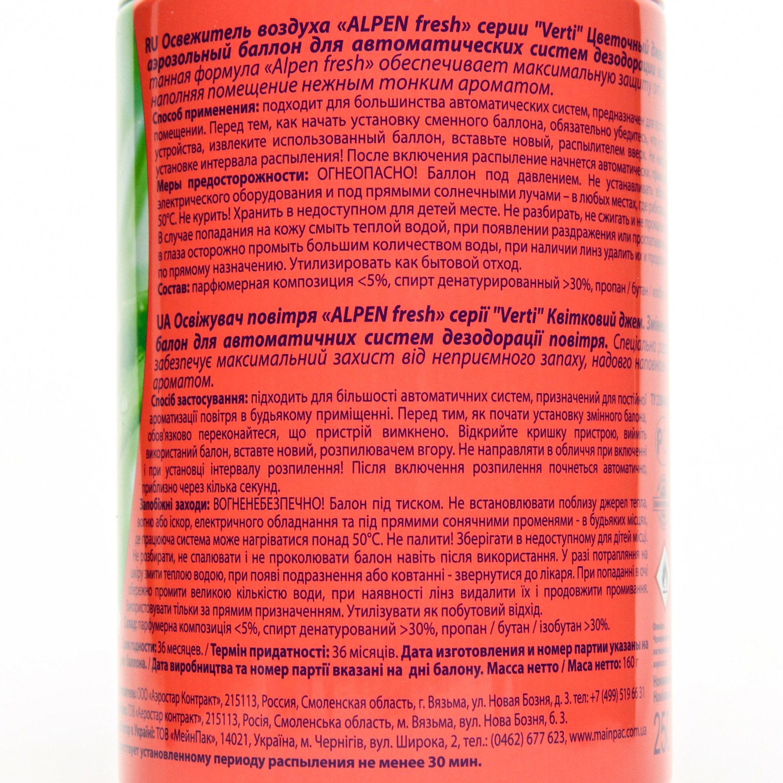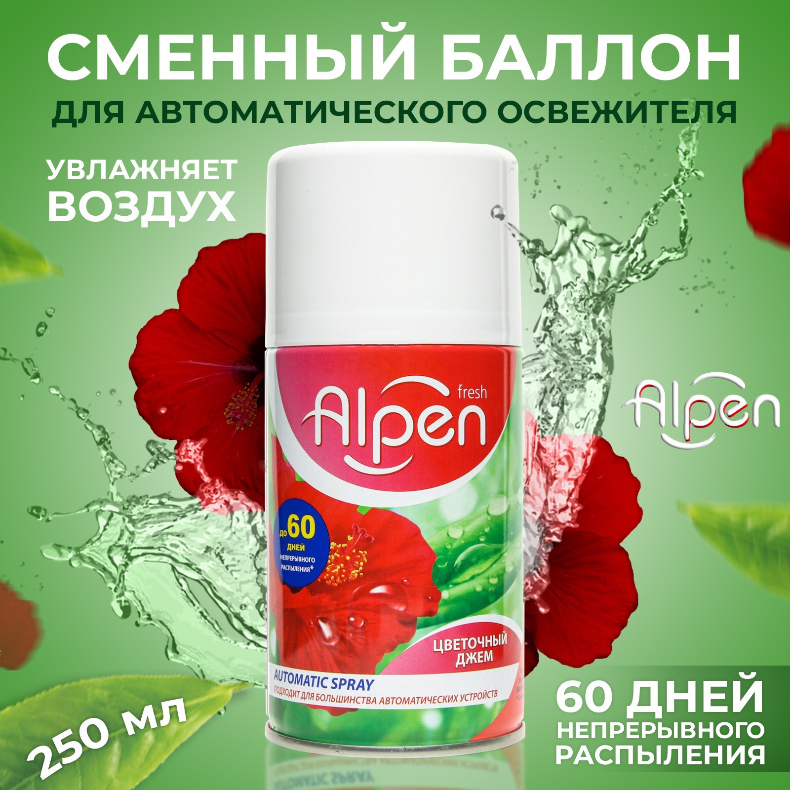 Сменный баллон для автоматического освежителя alpen, цветочный джем, 250 мл. Освежитель воздуха, сменный универсальный аэрозольный баллон для автоматических систем дезодорации воздуха. Специально разработанная формула обеспечивает максимальную защиту от неприятного запаха, надолго наполняя помещение нежным тонким ароматом. Способ применения: подходит для большинства автоматических систем, предназначен для пользования в помещении. Перед тем, как начать установку сменного баллона, обязательно убедитесь, что устройство выключено, извлеките использованный баллон, вставьте новый, распылителем вверх. Не направляйте в лицо при установке интервала распыления! После включения распыление начнется автоматически, через несколько секунд. Меры предосторожности: огнеопасно! Баллон под давлением. Не устанавливать в близи огня и электрического оборудования и под прямыми солнечными лучами. Не КУРИТЬ ! Хранить в недоступном для детей месте. Не разбирать, не сжигать и не прокалывать. Использовать по прямому назначению. Утилизировать как бытовой отход. Состав: парфюмерная композиция 5%, спирт денатурированный 30%, пропан, бутан, изобутан, вода. Объём, мл: 250 Аромат: Цветы Форма выпуска: Спрей Принцип работы: Автоматический Вид распыления: Влажное Температурное ограничение: Нет Тип: Сменный баллон  развернуть описание ▼