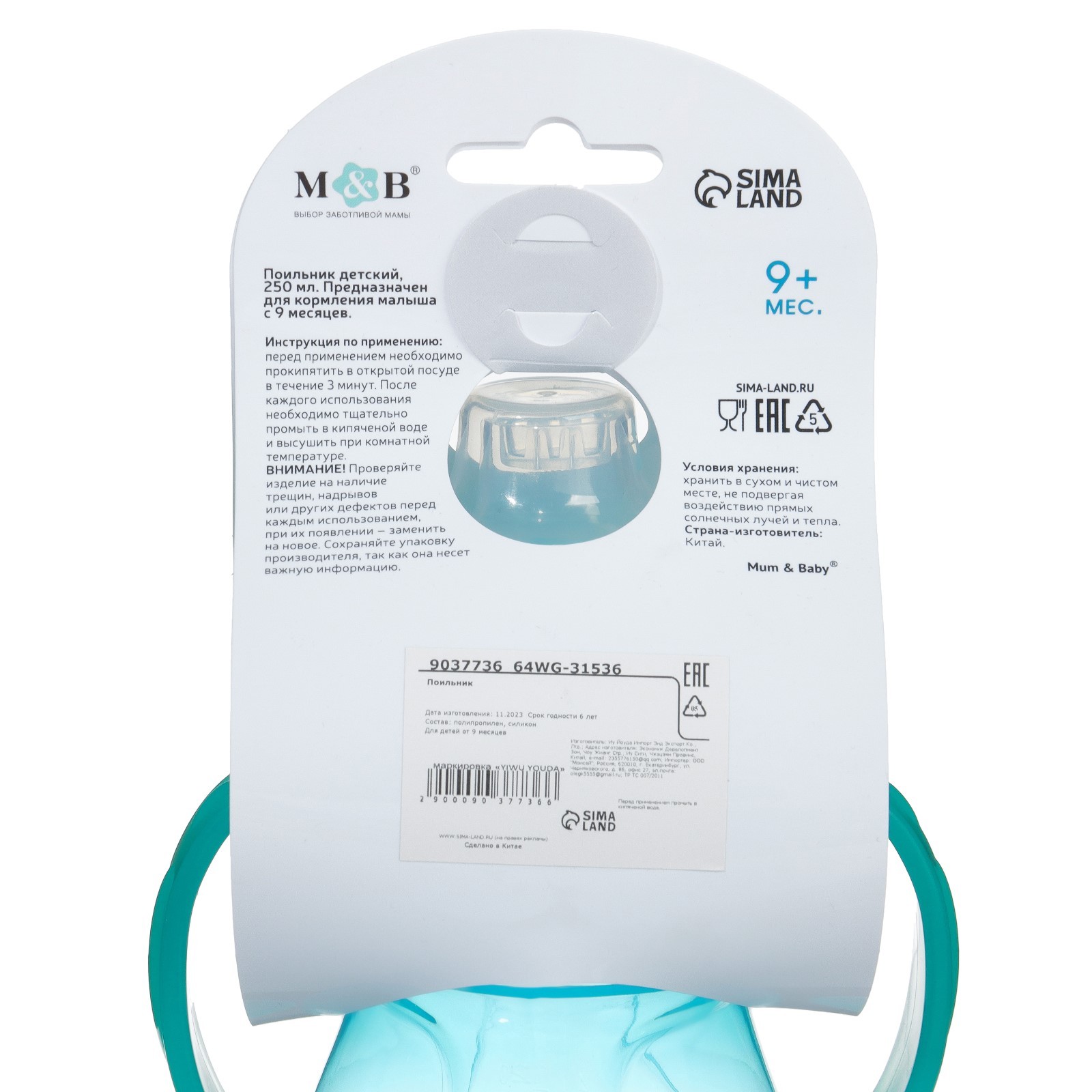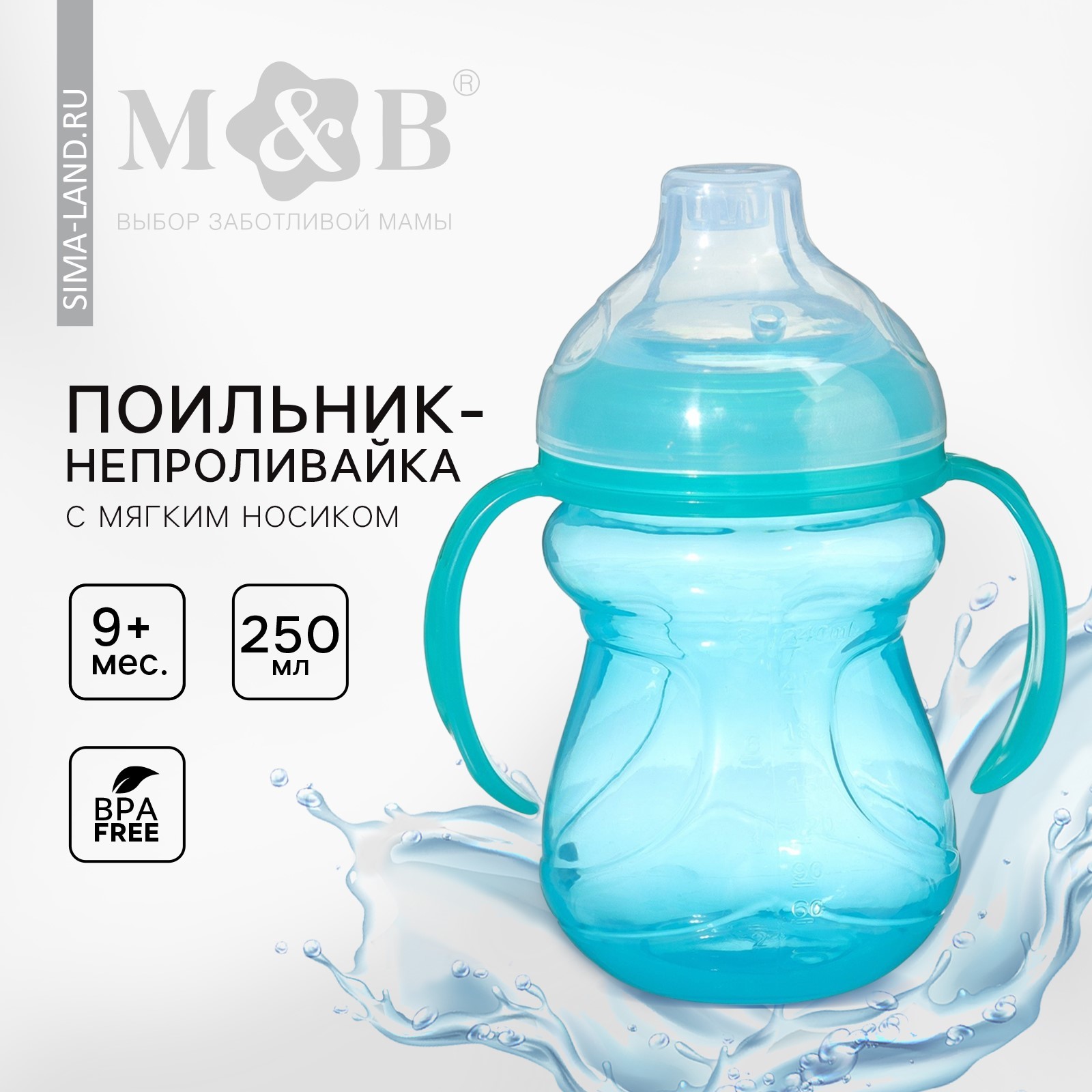Поильник - непроливайка детский с мягким носиком, 250 мл., с ручками, цвет зеленый