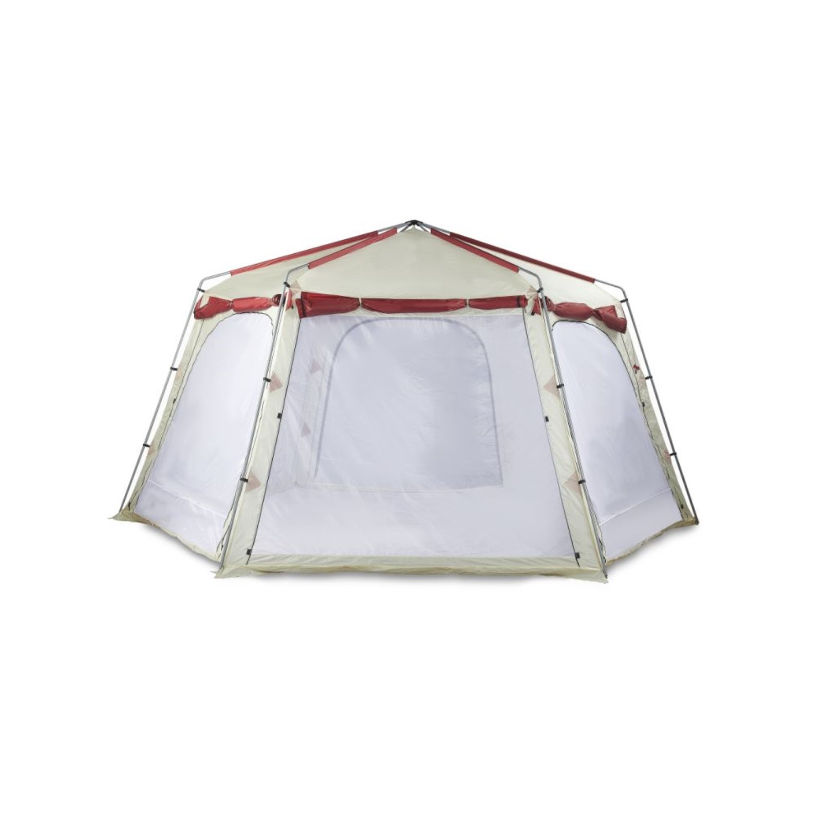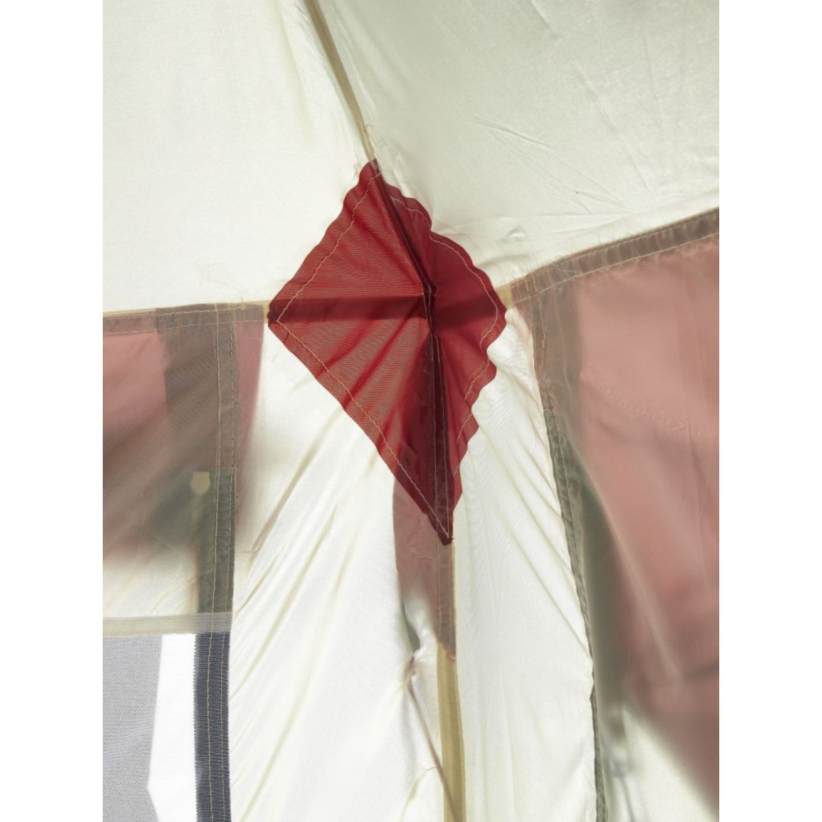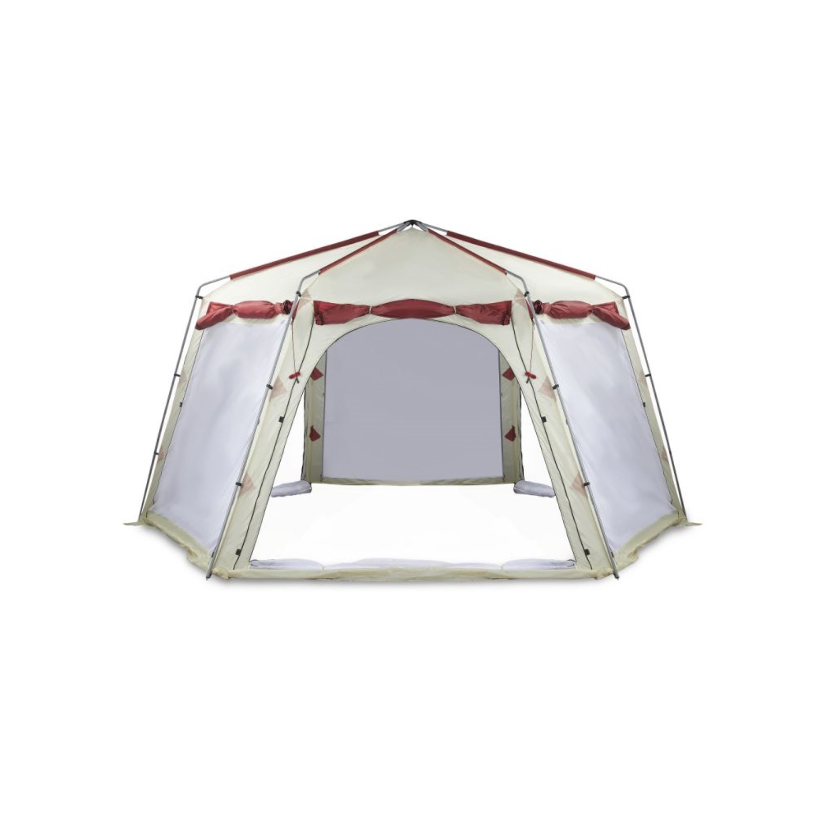 Тент: 100 % полиэстер, 1000 мм / ст Каркас: 19 мм стальные трубкиСтенки: 3 входа + 3 стенки + 6 шторок полиэстер на каждую стенку и на каждый вход Полный вес: 15, 3 кг Размер: 500 х 433 х 255 см Высота палатки: 255 см