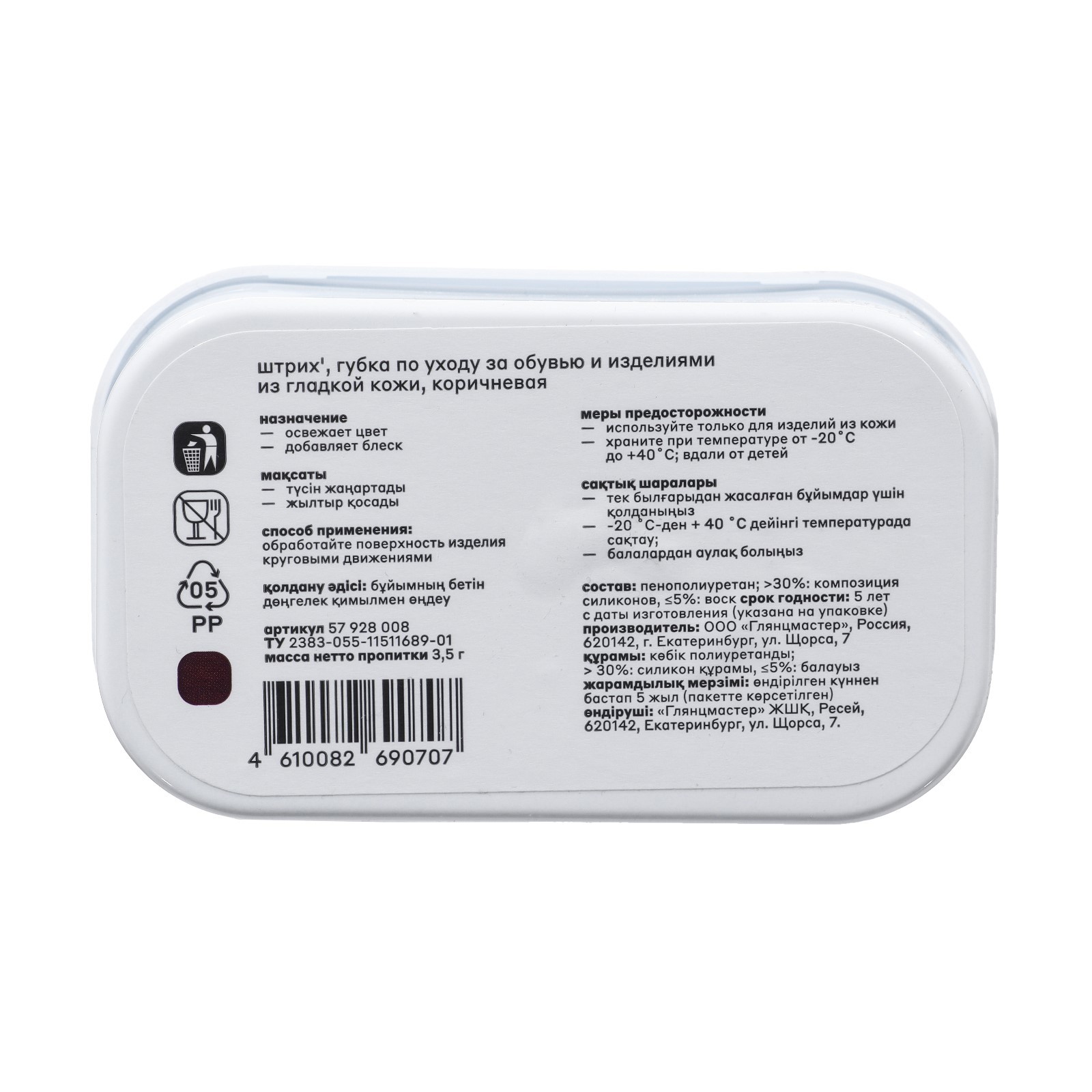 Губка для гладкой кожи штрих, "стандарт" коричневая. Губка для обуви из гладкой кожи ШТРИХ Стандарт, коричневая предназначена для очистки легких загрязнений, придания блеска и обновления внешнего вида обуви (изделий) из гладких кож. Обладает подкрашивающим эффектом и водоотталкивающими свойствами. Цвет: Коричневый Температурное ограничение: Нет Назначение: Экокожа Назначение: Искусственная кожа Эффект: Блеск  развернуть описание ▼