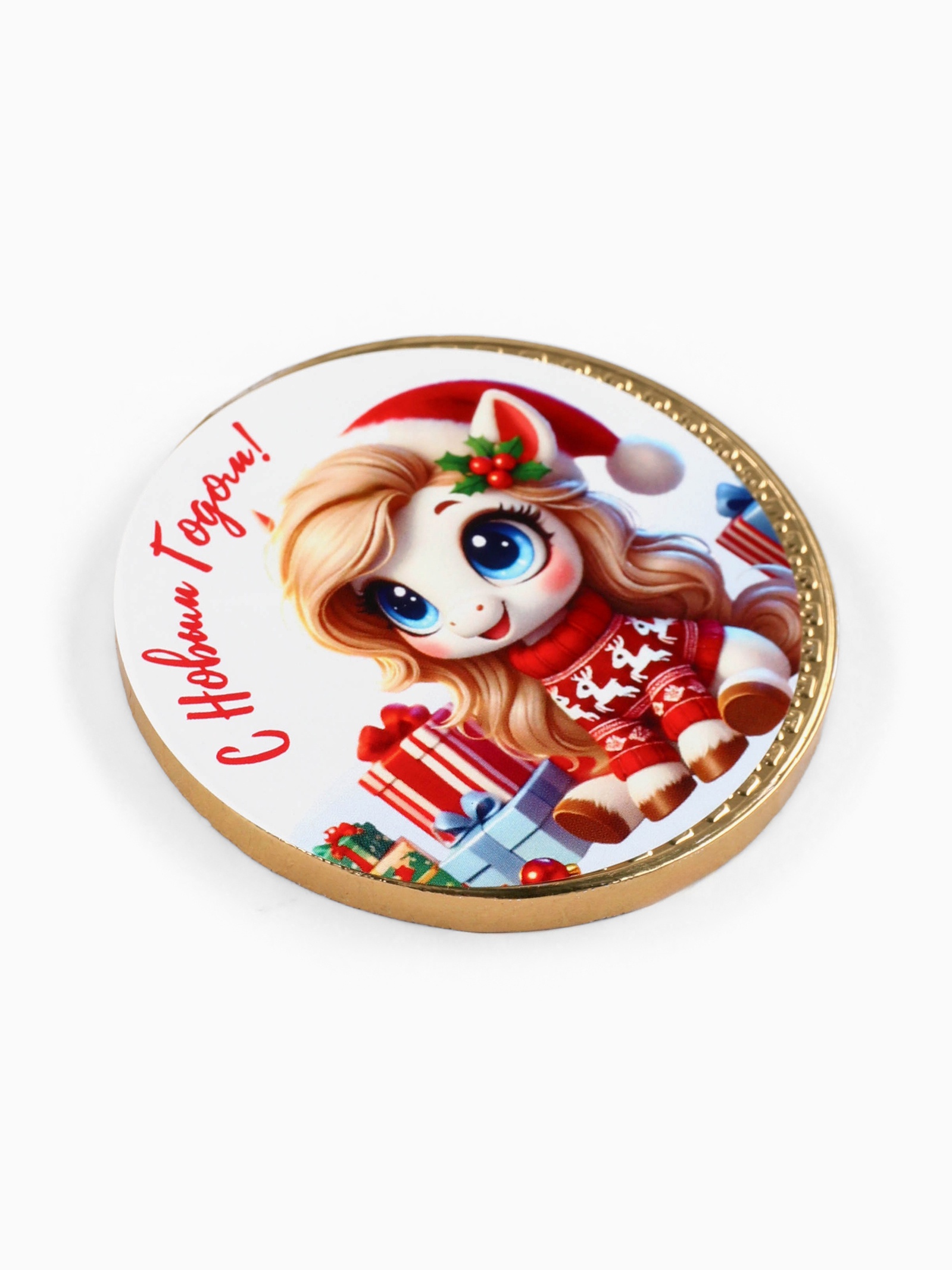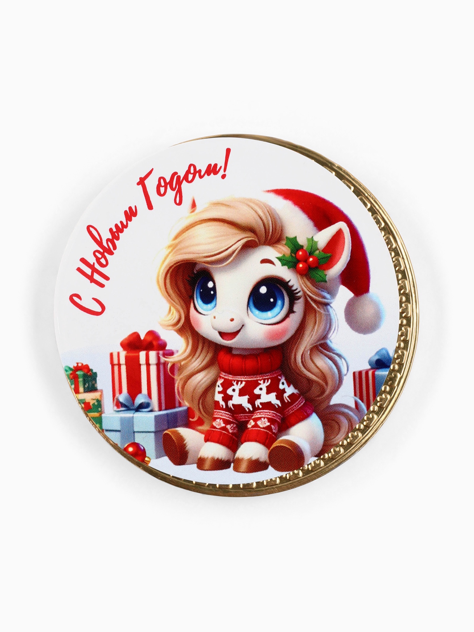 Набор:Нет|Белки, г:1|Вес нетто, г:25|Жиры, г:32|Углеводы, г:64|Энергетическая ценность, ккал:552|Тематика:Новогодняя|Символ года:Символ года 2026 (Лошадь)|Тематика праздника:Новый год|Форма:Медаль|Вид шоколада:Молочный|Добавки:Без добавок|Страна:Россия