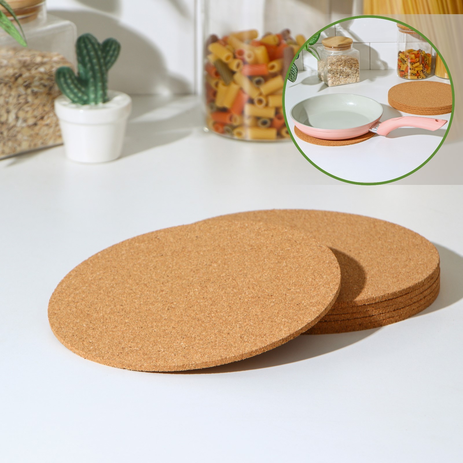Набор подставок под горячее доляна, 6 шт, d=19 см. Подставка под горячее поможет сохранить стол от пятен и повреждений. А также подставку можно использовать для хранения украшений. Помимо этого, изделие будет необычным элементом интерьера кухни и подойдёт в качестве подарка на любой праздник! Достоинства: необычный дизайн, неограниченный срок службы, экологический и безопасный для продуктов питания материал. Цвет: Бежевый Форма: Круглая Размер, см: 19 х 19 В наборе, шт.: 6 Материал: Пробка Можно мыть в посудомоечной машине: Нет  развернуть описание ▼