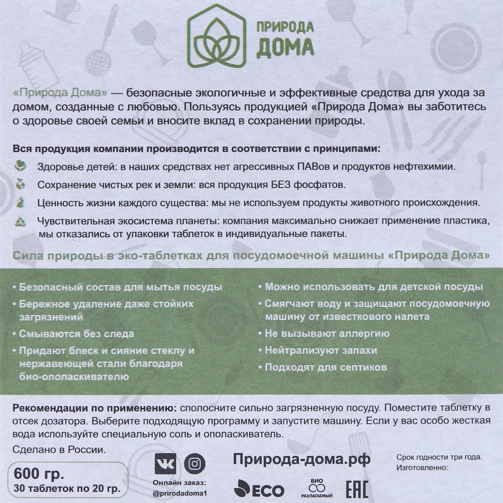 Таблетки для посудомоечных машин «природа дома», 30 шт. Эко таблетки для посудомоечной машины «Природа Дома» великолепно отмывают посуду до блеска, не оставляя разводов и налета. Полностью смываются с посуды, без запаха. Не содержать фосфаты, синтетические ПАВ. Подходят для мытья детской посуды, гипоаллергенные. Защищают посудомоечную машину от накипи, могут использоваться в домах с септиками. Состав: 10-25% карбонат натрия, цитрат натрия, перкарбонат натрия, бикарбонат натрия, силикат натрия, сульфат натрия, менее 10% природный полисахарид, энзимы, Н-тензиды растительного происхождения, биоразлагаемый активатор отбеливателя. В упаковке, шт.: 30 Ароматизированные: Нет Температурное ограничение: Нет  развернуть описание ▼