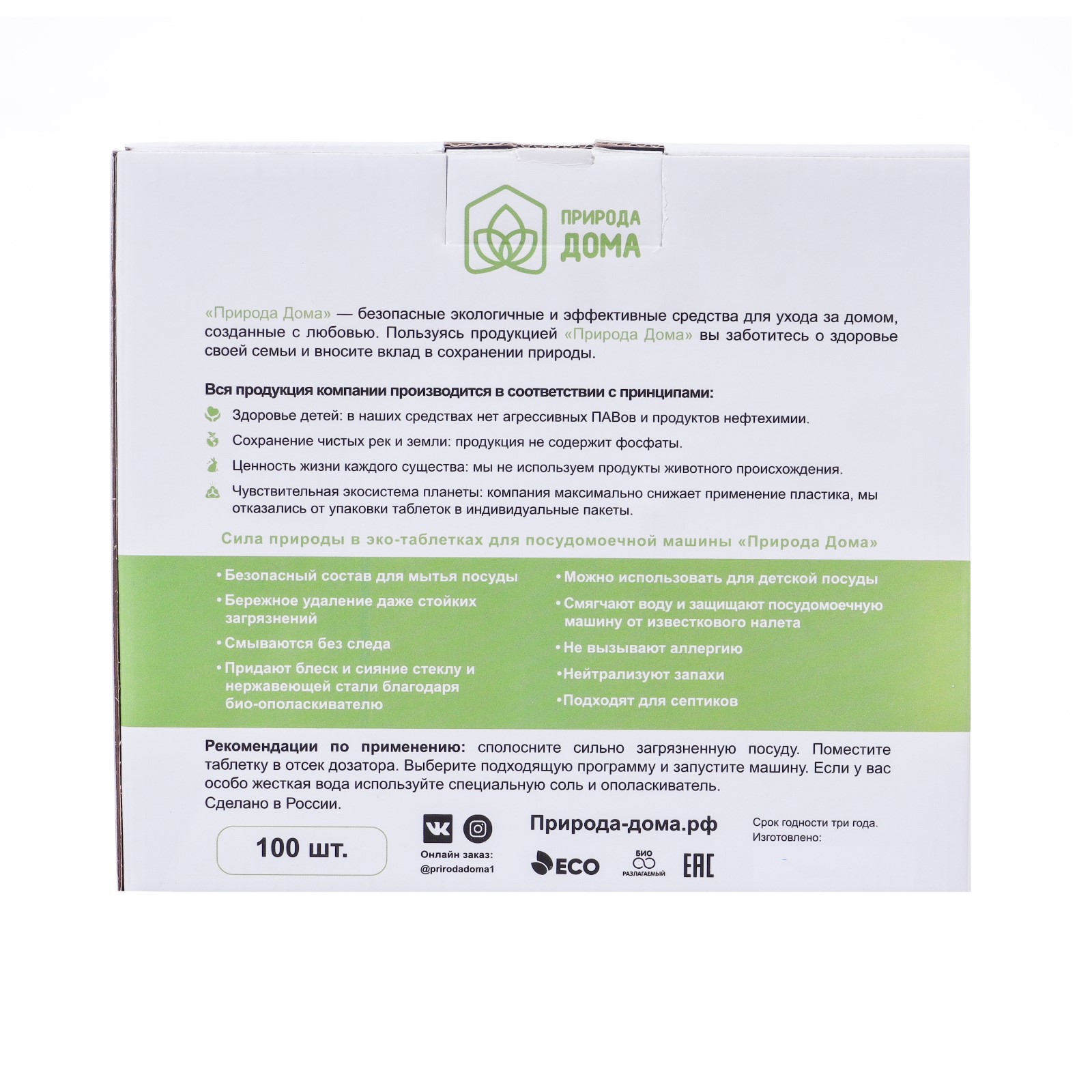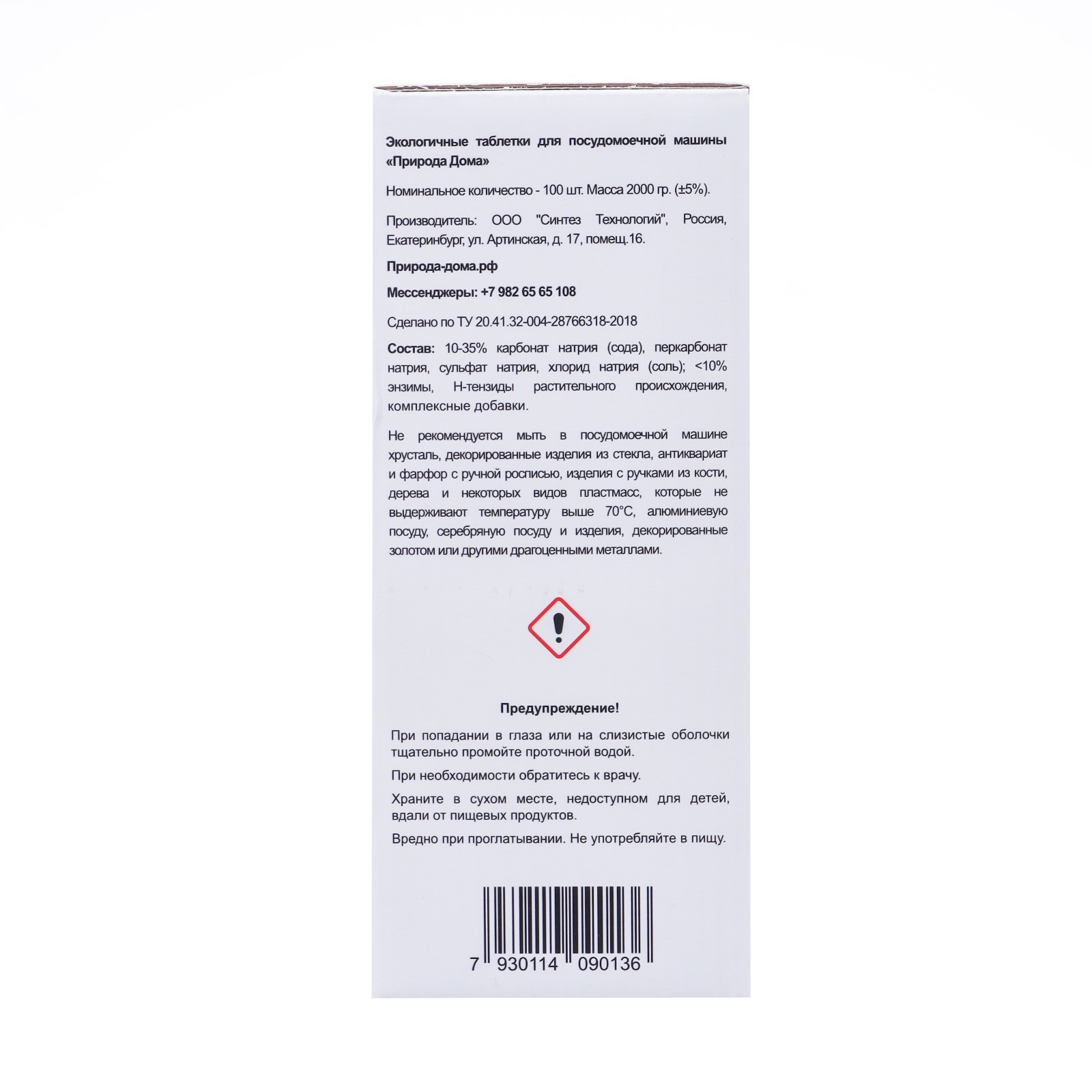 Таблетки для посудомоечных машин «природа дома», 100 шт. Эко таблетки для посудомоечной машины «Природа Дома» великолепно отмывают посуду до блеска, не оставляя разводов и налета. Полностью смываются с посуды, без запаха. Не содержать фосфаты, синтетические ПАВ. Подходят для мытья детской посуды, гипоаллергенные. Защищают посудомоечную машину от накипи, могут использоваться в домах с септиками. Состав: 10-25% карбонат натрия, цитрат натрия, перкарбонат натрия, бикарбонат натрия, силикат натрия, сульфат натрия, менее 10% природный полисахарид, энзимы, Н-тензиды растительного происхождения, биоразлагаемый активатор отбеливателя. В упаковке, шт.: 100 Ароматизированные: Нет Температурное ограничение: Нет  развернуть описание ▼