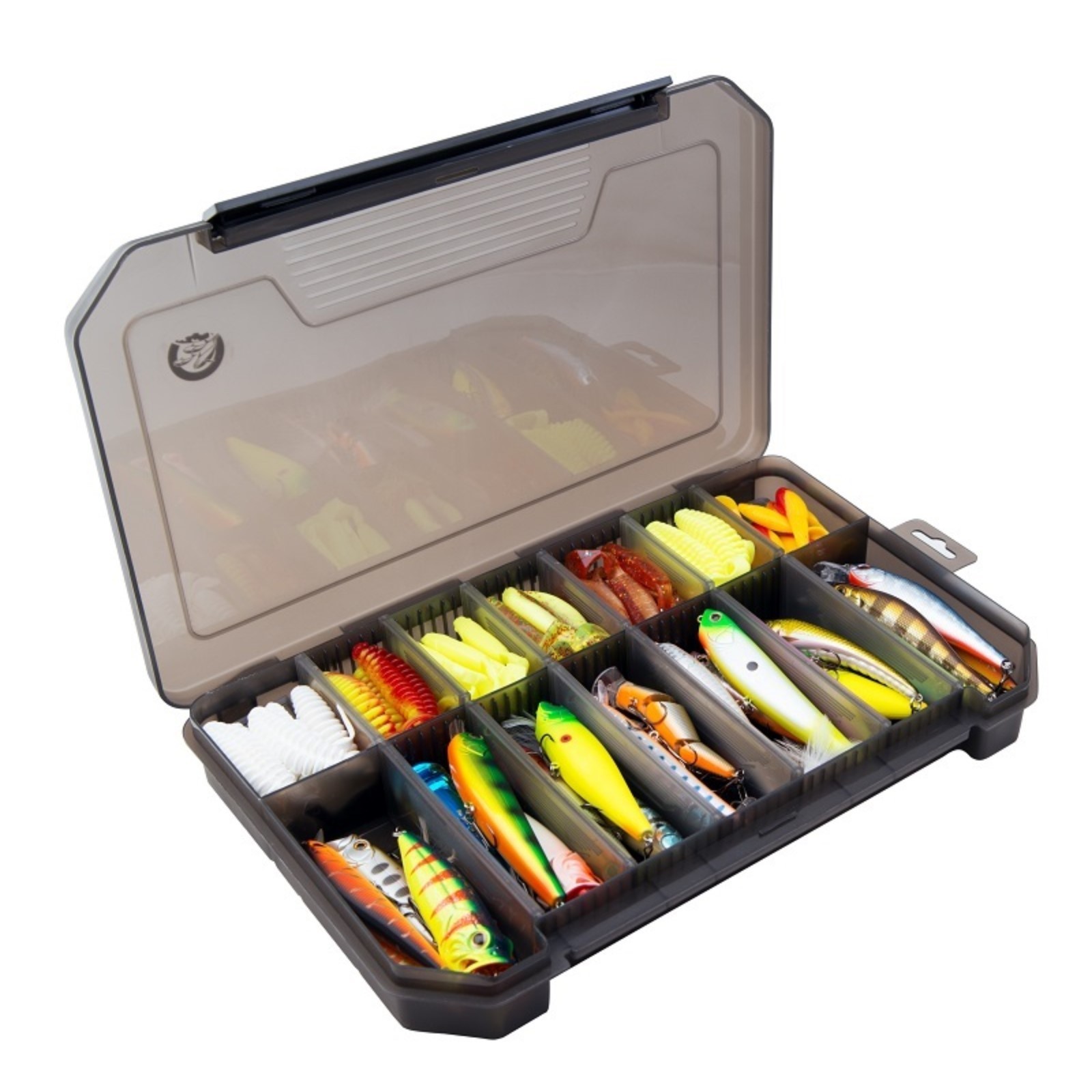 Коробка для приманок, 340х215х50 мм, цвет дымка. Коробка данного типа предназначена для хранения и переноски рыболовных принадлежностей: приманок, крючков, грузил. Бокс выполнен из высококачественного пластика, в нем можно хранить силиконовые твистеры, пластик не вступает в химическую реакцию с мягкими наживками. Плотная защелка препятствует самопроизвольному открытию коробки. Бокс поделен на 2 сегмента, один шириной в 7 см, другой – 12 см. , длина коробки составляет 34 см, вес - 525 грамм. В комплект входит 6 больших и 6 маленьких съёмных перегородок, которые помогают преобразовать коробку и габариты ячеек под собственные нужды. Количество отделений: 1 Количество секций: 14 Количество ячеек: 14 Материал: Пластик Съёмные перегородки: Да Особенности: Без особенностей Назначение: Для приманок  развернуть описание ▼