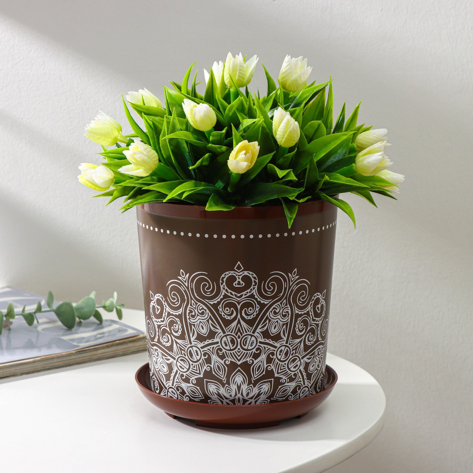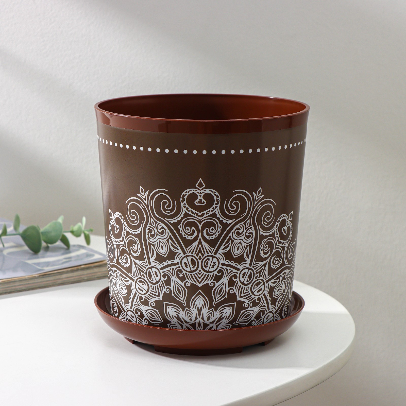 Горшок для цветов с поддоном доляна «кракле», 1,6 л, d=14 см, h=15,5 см, цвет коричневый. Представляем вам цветочные горшки от собственной торговой марки Доляна — идеальное решение для создания уютной атмосферы в вашем доме или офисе. Наши горшки изготовлены из высококачественного пластика, который обеспечивает долговечность и устойчивость к внешним воздействиям. Горшки имеют стильный дизайн и представлены в различных размерах и цветах, что позволяет подобрать идеальный вариант для любого интерьера. Благодаря наличию поддона, вы можете не беспокоиться о том, что вода прольётся на подоконник или мебель. Наши цветочные горшки станут прекрасным дополнением к вашему домашнему или офисному интерьеру. Они помогут создать уютную атмосферу и подчеркнуть вашу индивидуальность. Преимущества наших цветочных горшков: Изготовлены из качественного пластика.Имеют стильный дизайн.Представлены в разных размерах и цветах.Оснащены поддонами для защиты поверхностей от влаги.Доступны по цене.Не упустите возможность приобрести качественные цветочные горшки по доступной цене! Создайте уют и гармонию в своём доме или офисе с помощью наших горшков. Цвет:Коричневый|Форма:Круглая|Диаметр, см:14|Высота, см:15.5|Объём, л:1.6|Вид установки:Настольное|Рисунок:Да|Материал:Пластик|Можно оставлять зимой на улице:Нет|Поддон в комплекте:Да|Страна:Россия  развернуть описание ▼