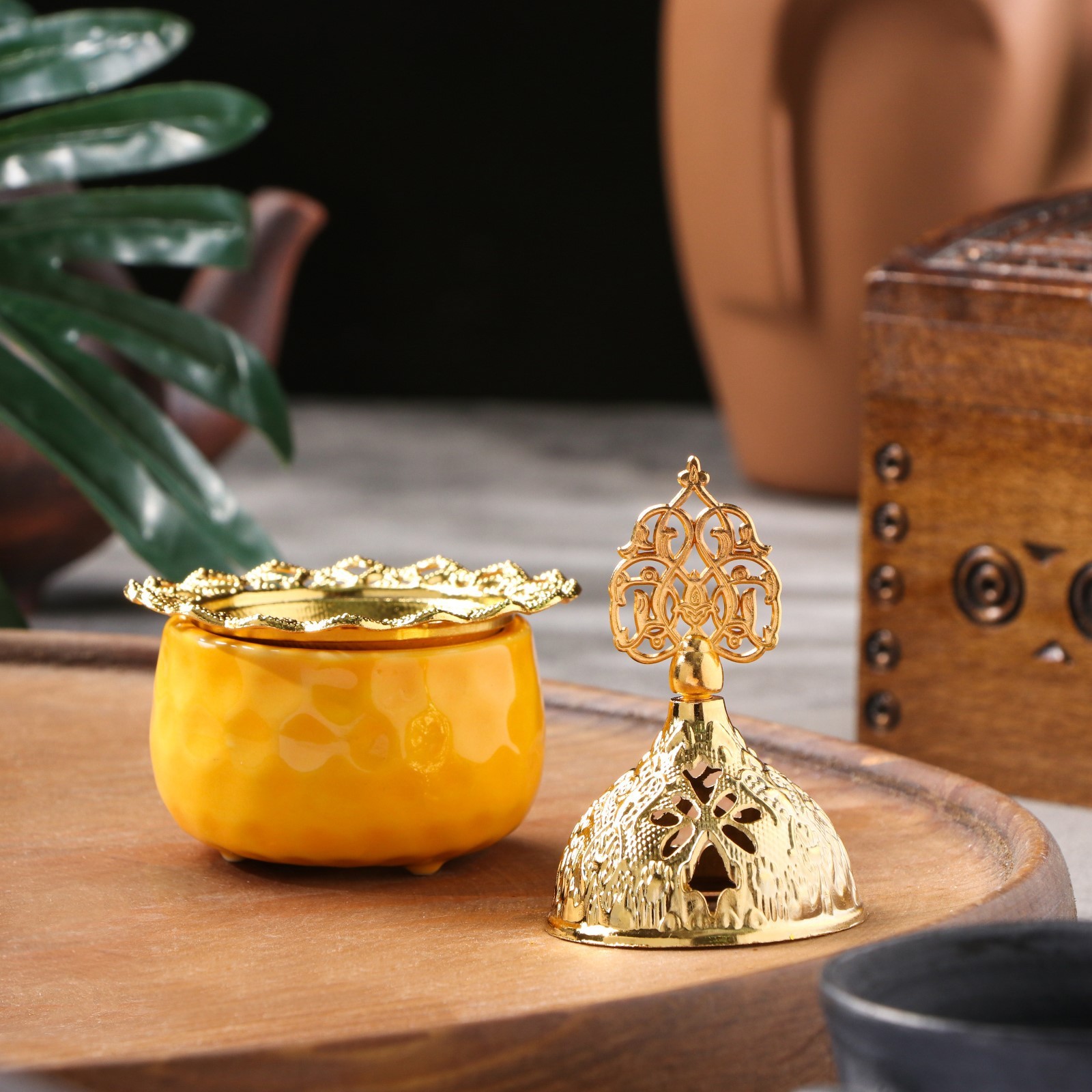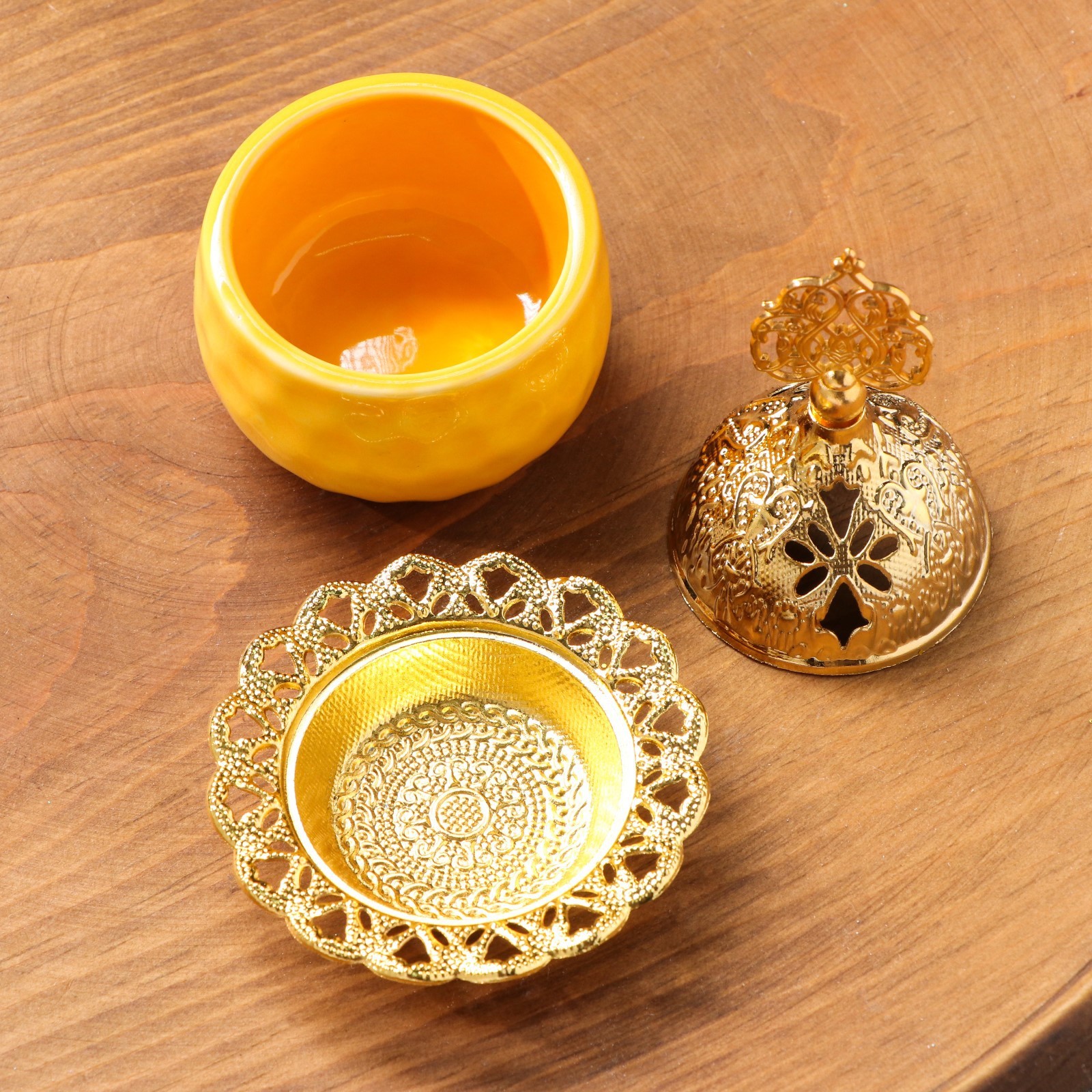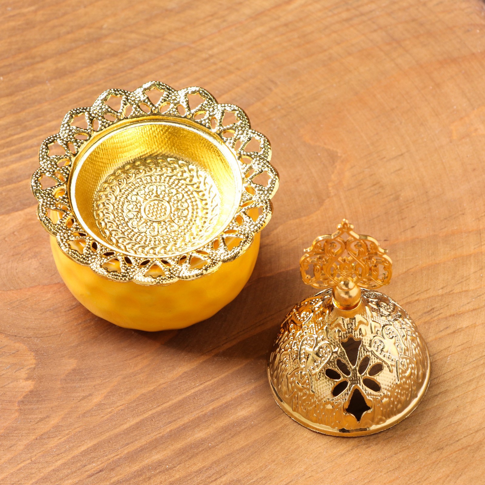 Курильница для благовоний порошковых и конусов take it easy «мешочек», жёлтый, 10.5 6.9 см. Курильница подходит для ароматических смесей, смол и благовоний, в том числе Пало Санто и Сян Дао. Изделие можно использовать для релаксации и чайной церемонии. Поместите благовоние в курильницу и подожгите так, чтобы оно начало тлеть. Дым должен струиться и испускать аромат. Превратите ароматерапию в приятный и красивый ритуал! Материал:Металл|Материал:Керамика|Тип благовоний:Сыпучие|Тип благовоний:Конусные|Страна:Китай  развернуть описание ▼